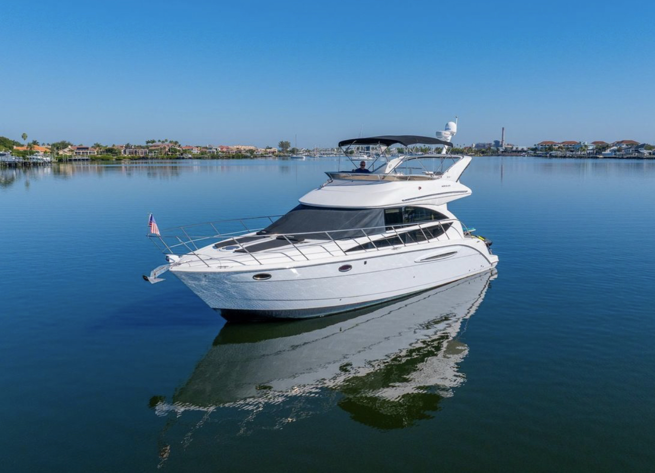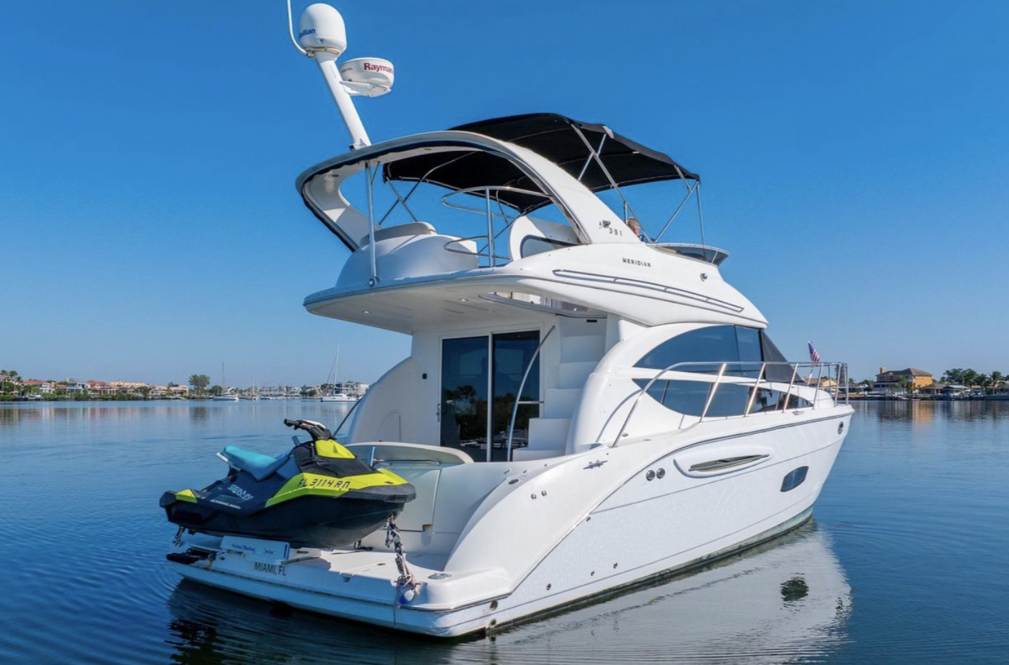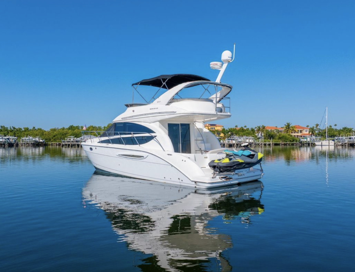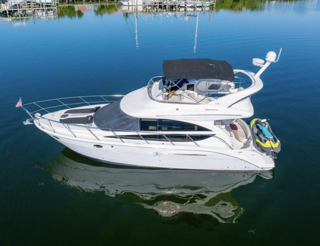This 2009 Meridian 391 is loaded with premium features and designed for effortless, comfortable cruising. Powered by twin Cummins 380HP diesels with an Onan 9kW generator, it offers reliable performance and smooth handling. Bow & stern thrusters with joystick controls make docking simple, while a Seakeeper provides exceptional stability underway and at anchor.
