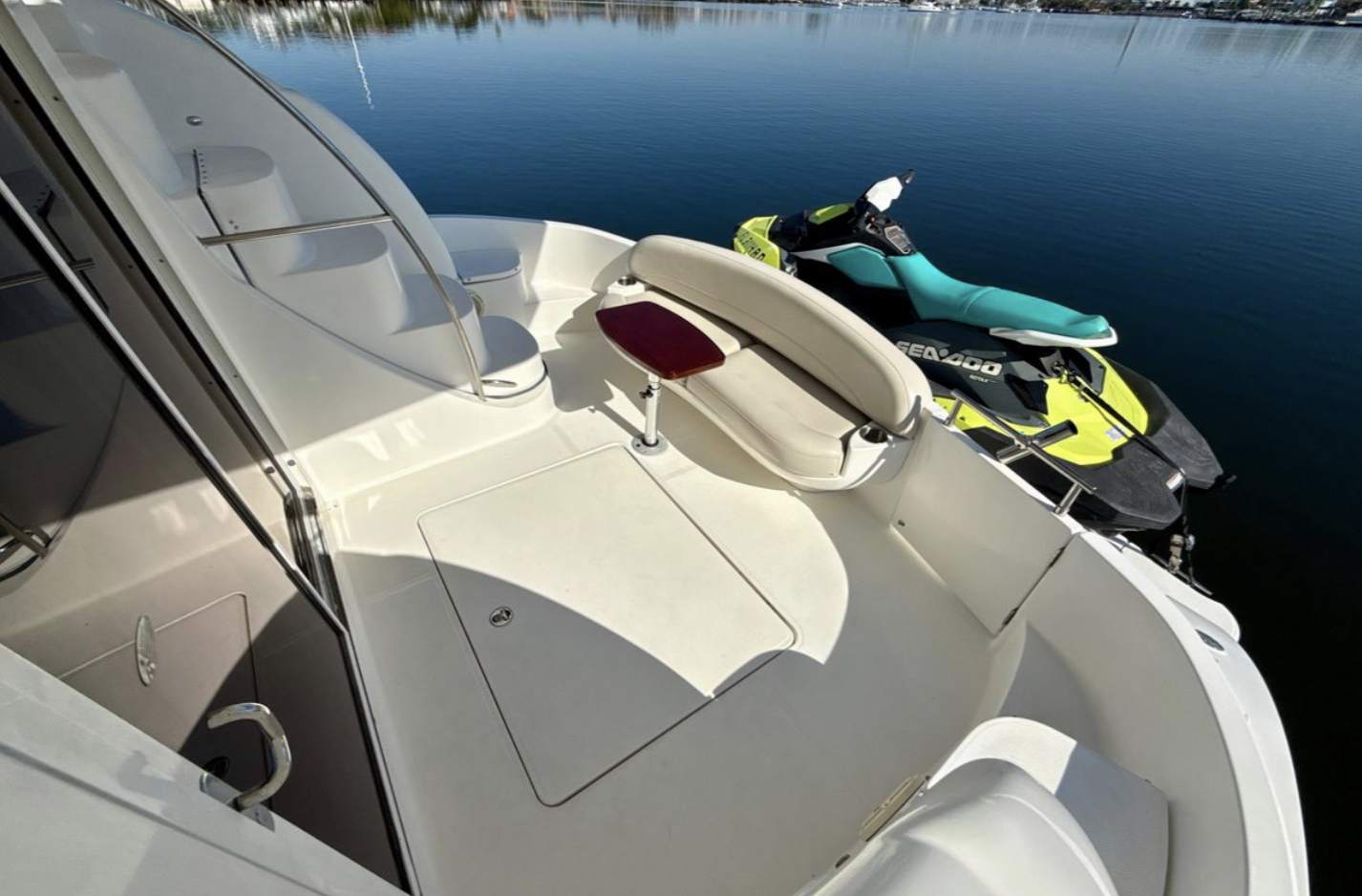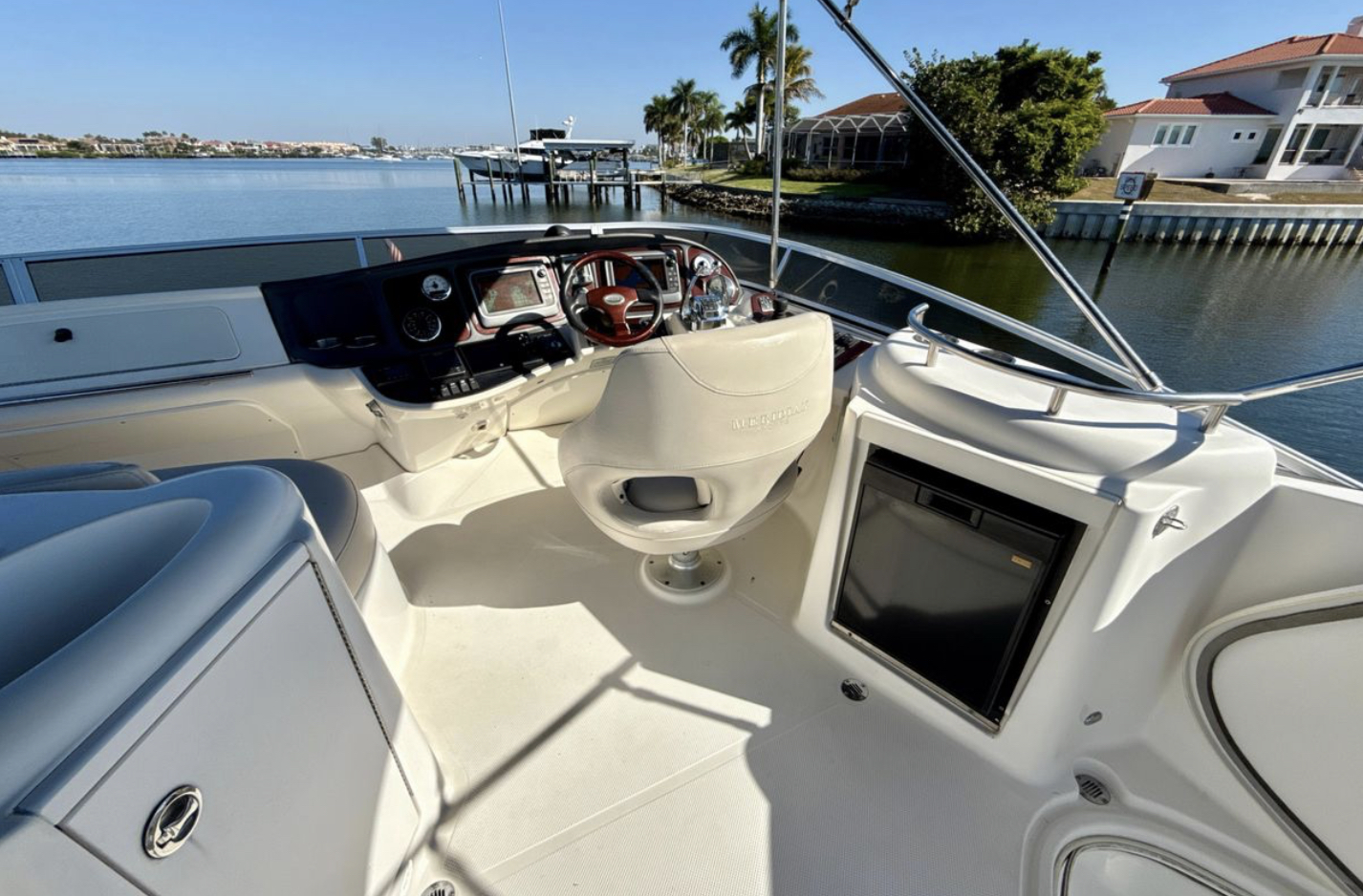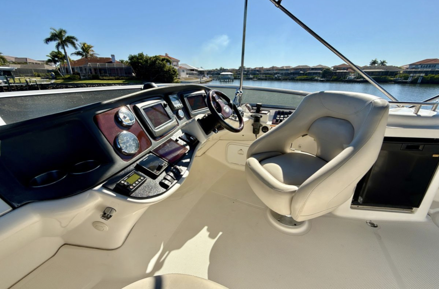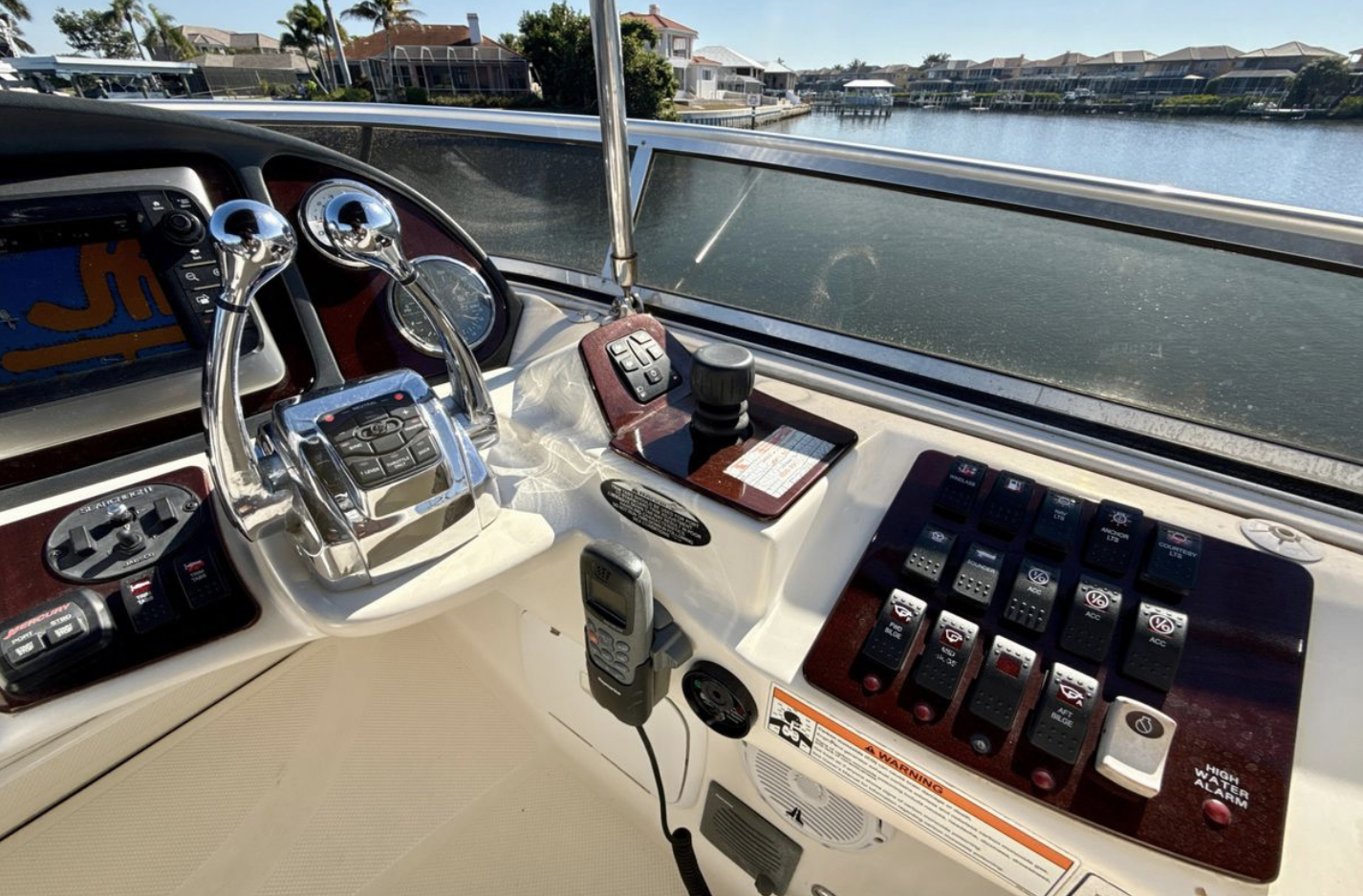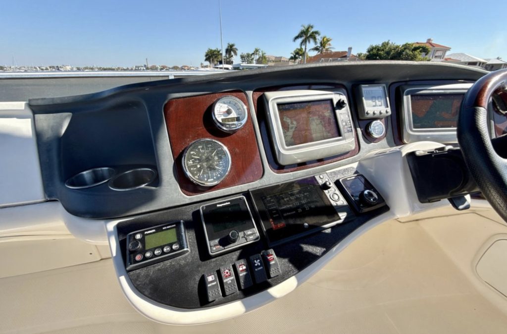 The helm is upgraded with Raymarine GPS, Autopilot, Radar, Mercury VesselView, onboard WiFi, and full digital monitoring. A full eisenglass flybridge enclosure and protective canvas covers keep the vessel in excellent condition.