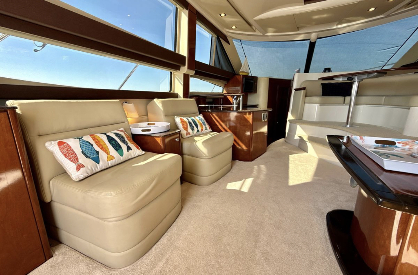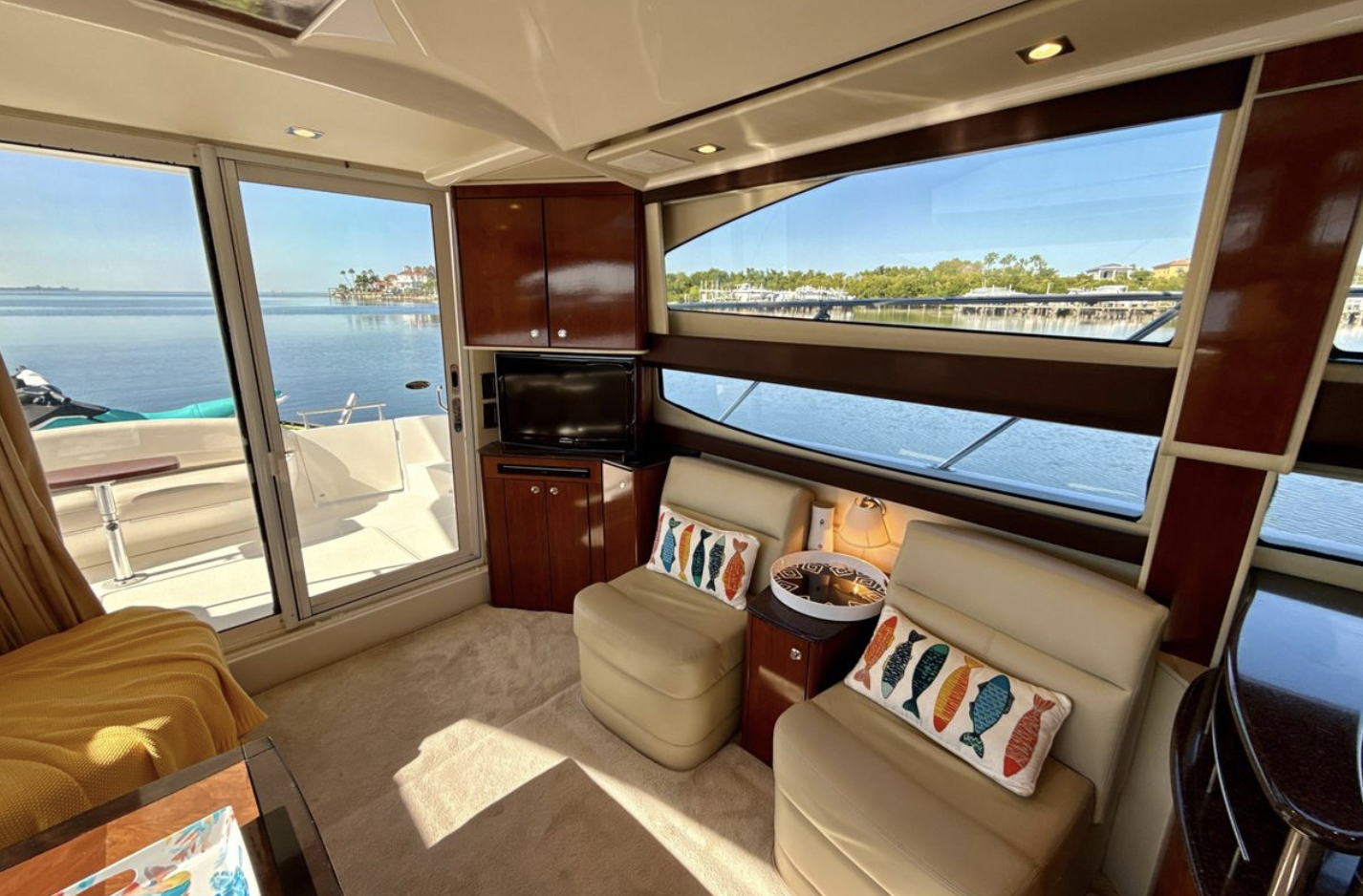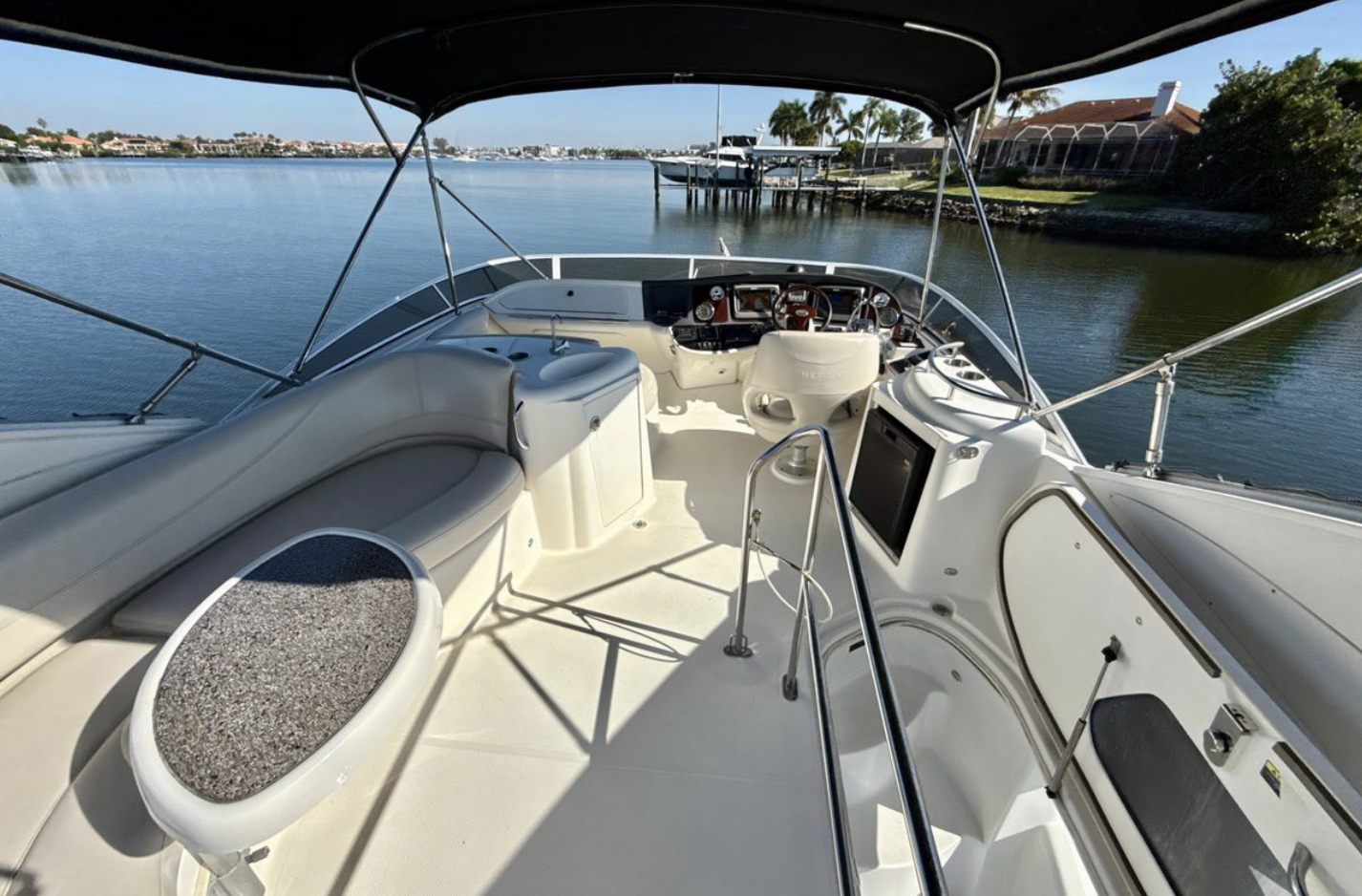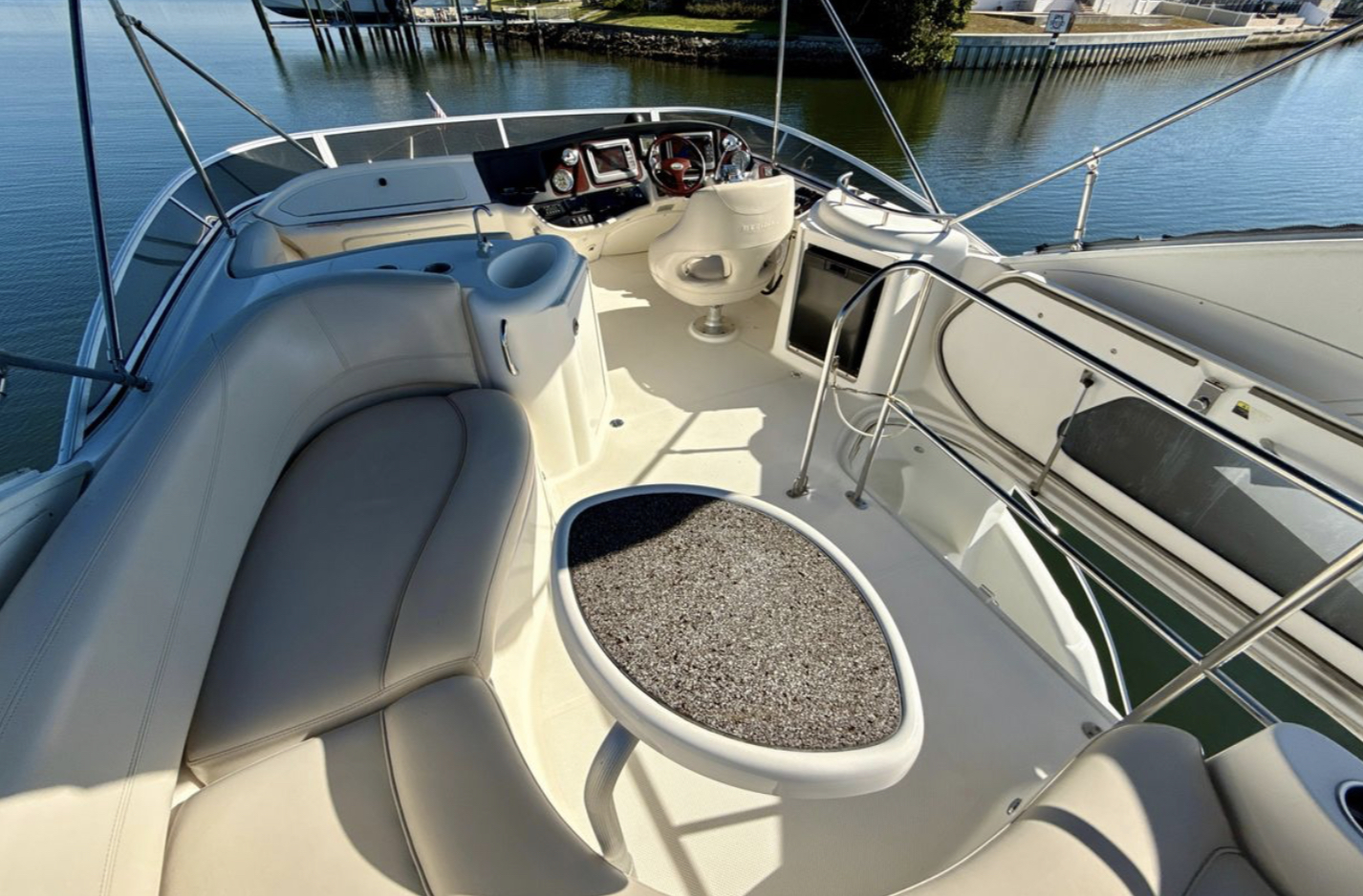 The helm is upgraded with Raymarine GPS, Autopilot, Radar, Mercury VesselView, onboard WiFi, and full digital monitoring. A full eisenglass flybridge enclosure and protective canvas covers keep the vessel in excellent condition.