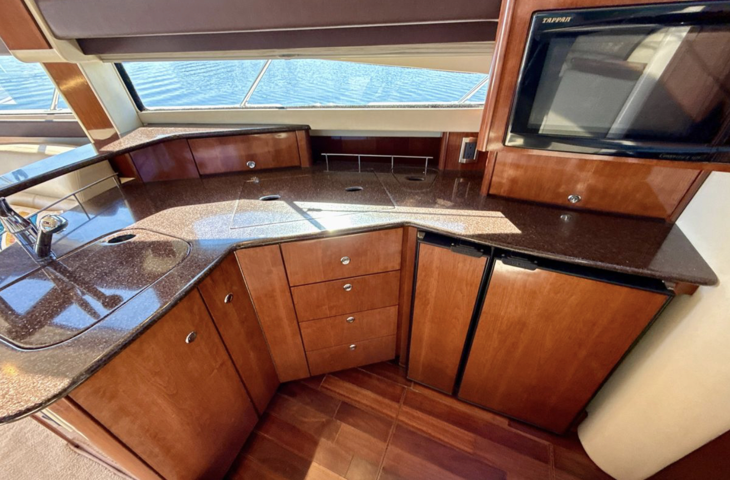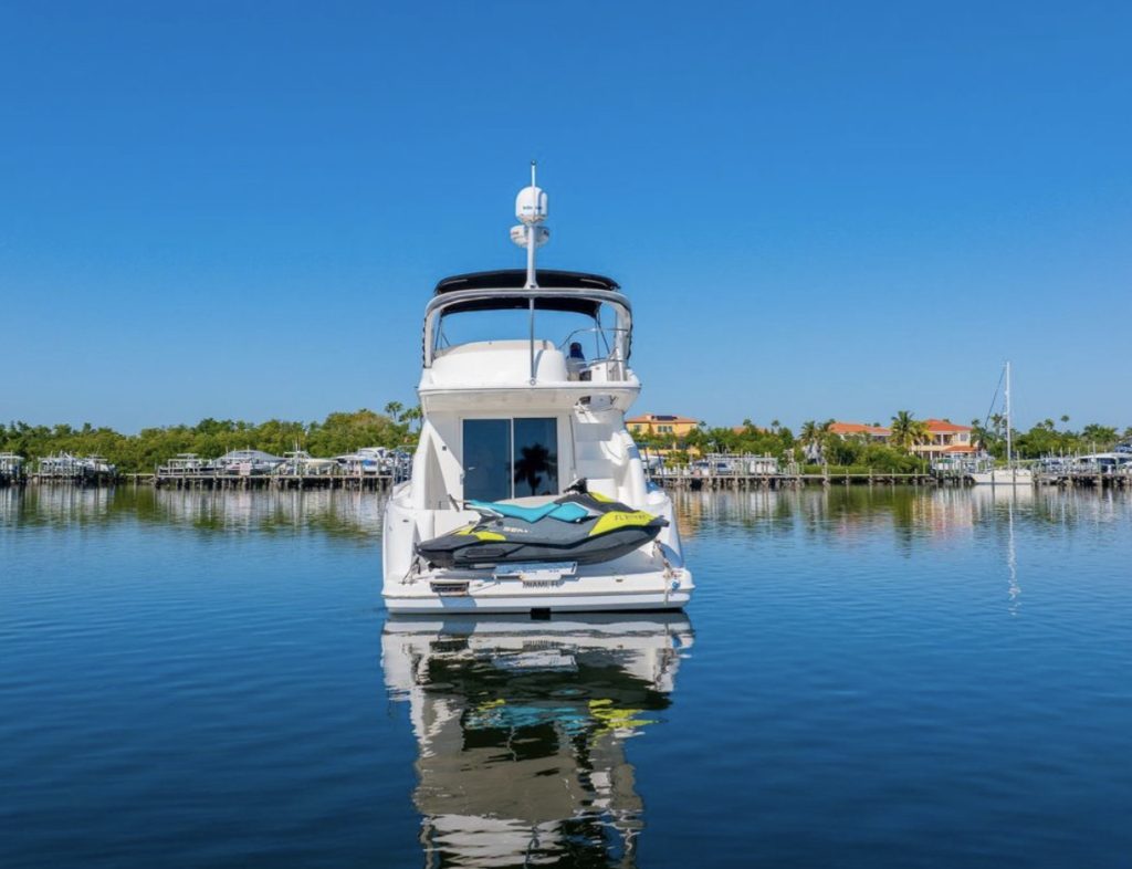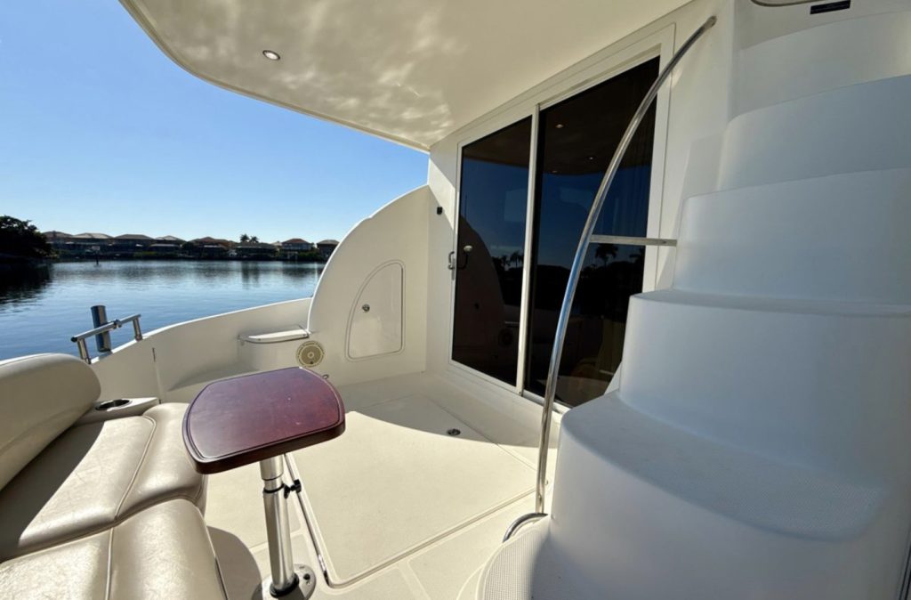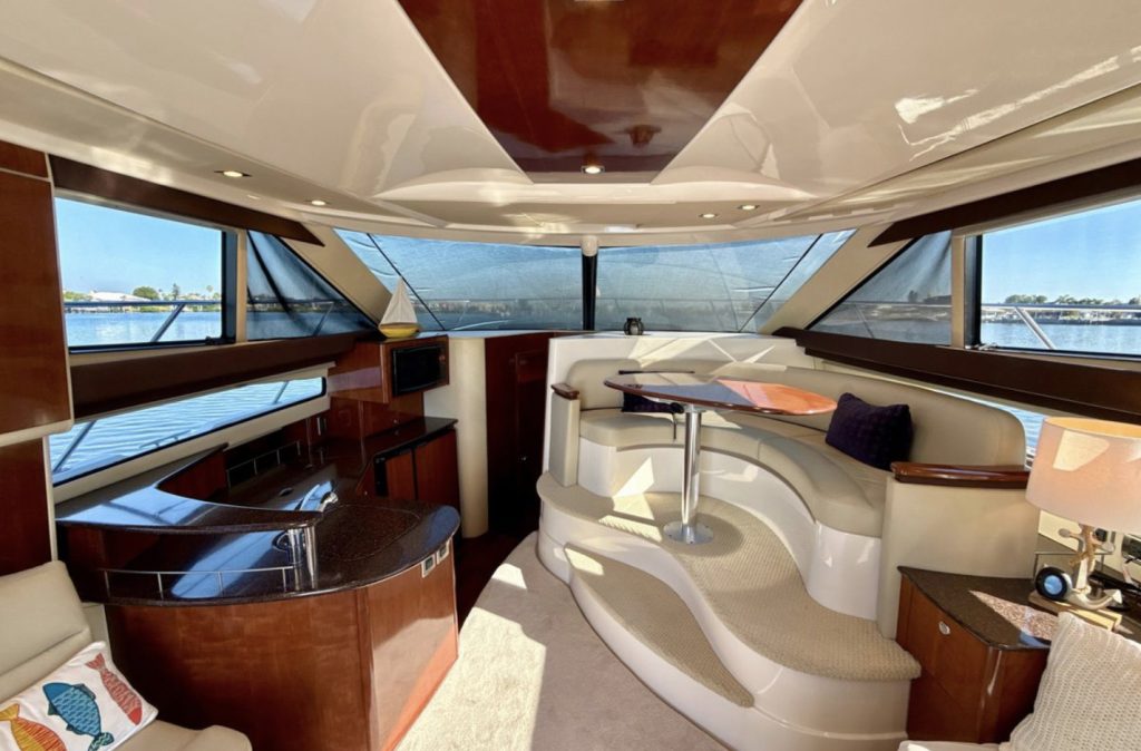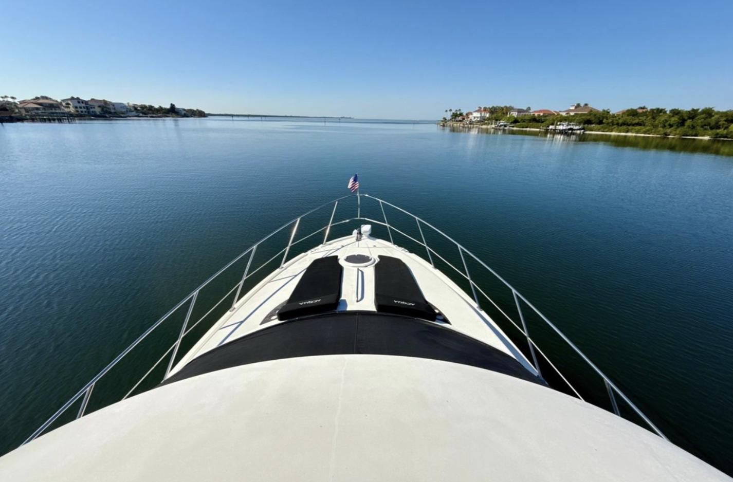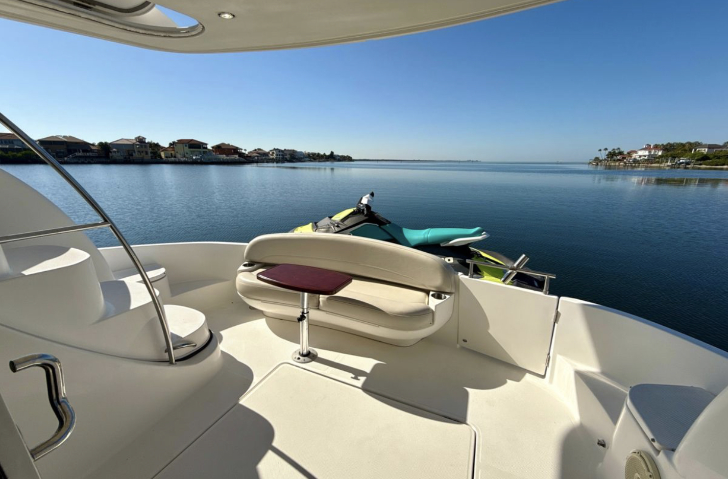 The helm is upgraded with Raymarine GPS, Autopilot, Radar, Mercury VesselView, onboard WiFi, and full digital monitoring. A full eisenglass flybridge enclosure and protective canvas covers keep the vessel in excellent condition.