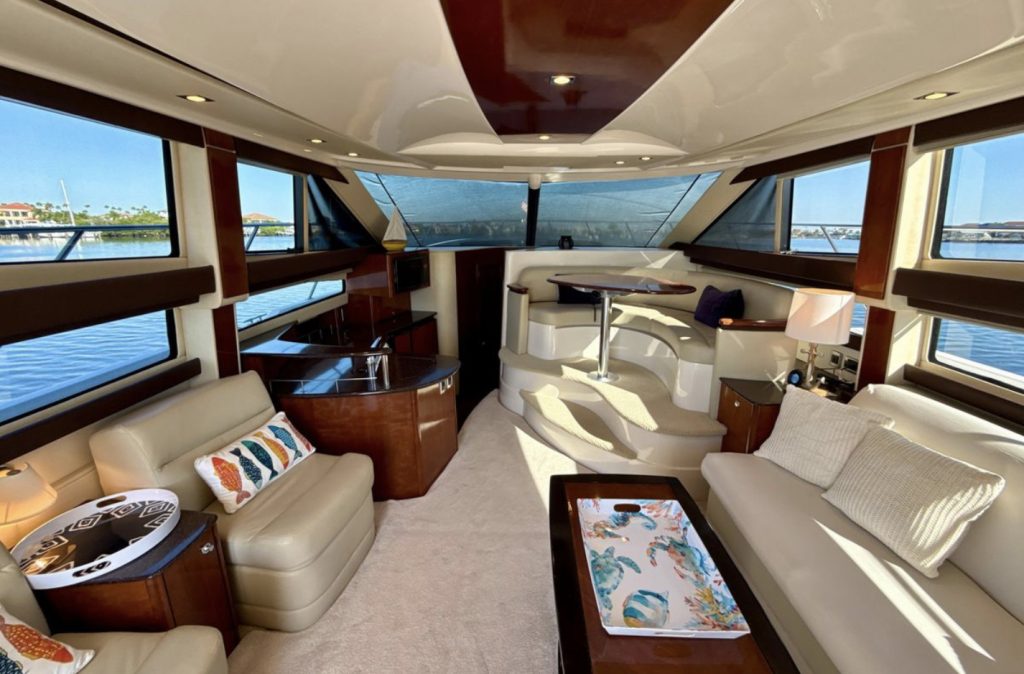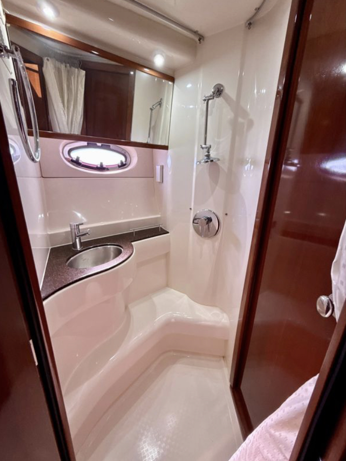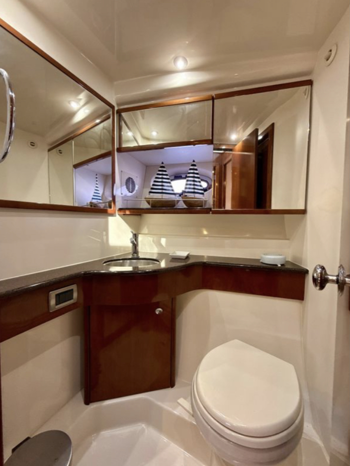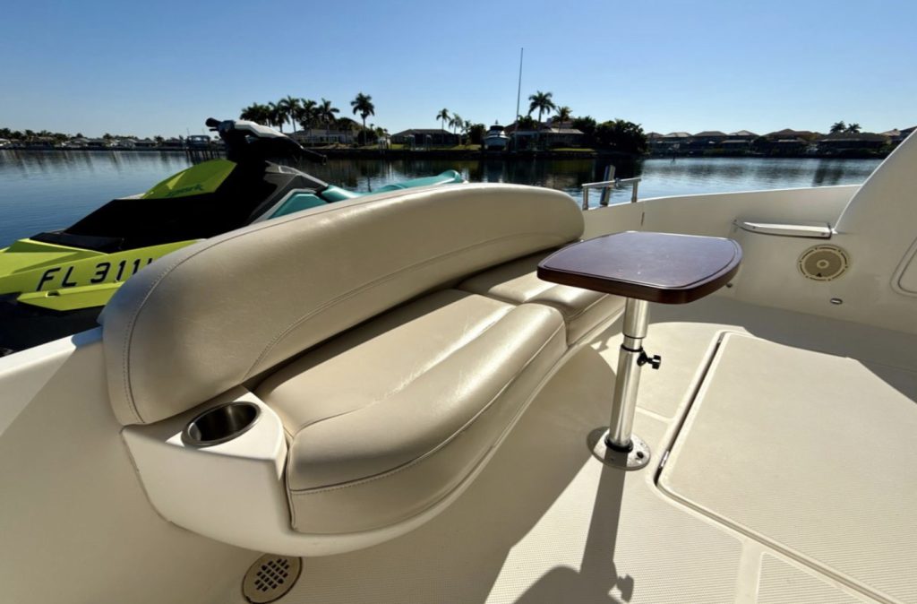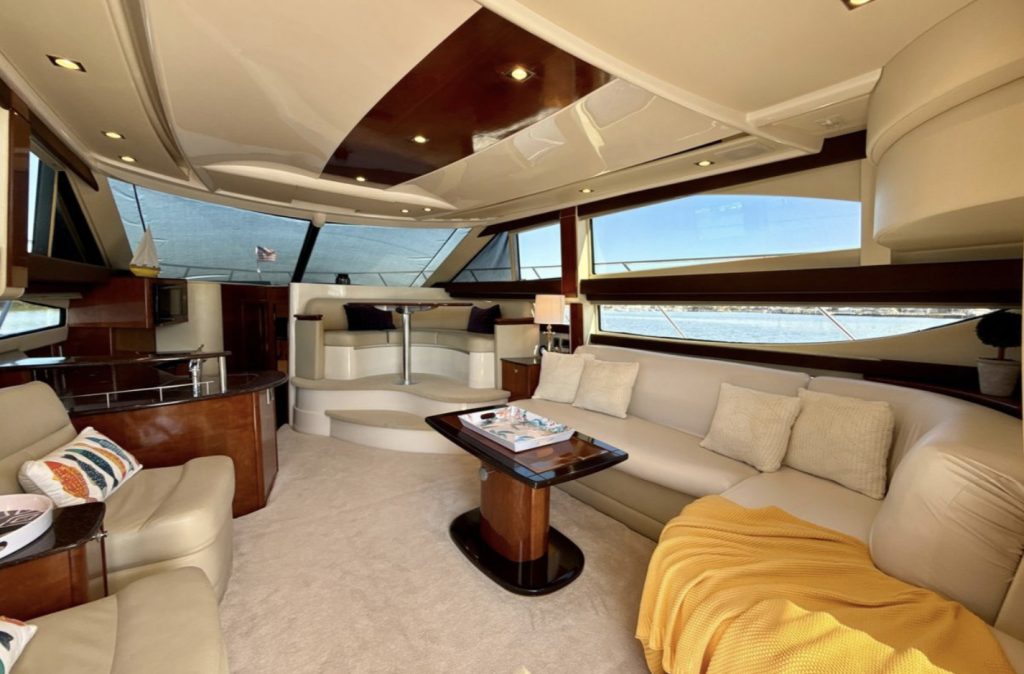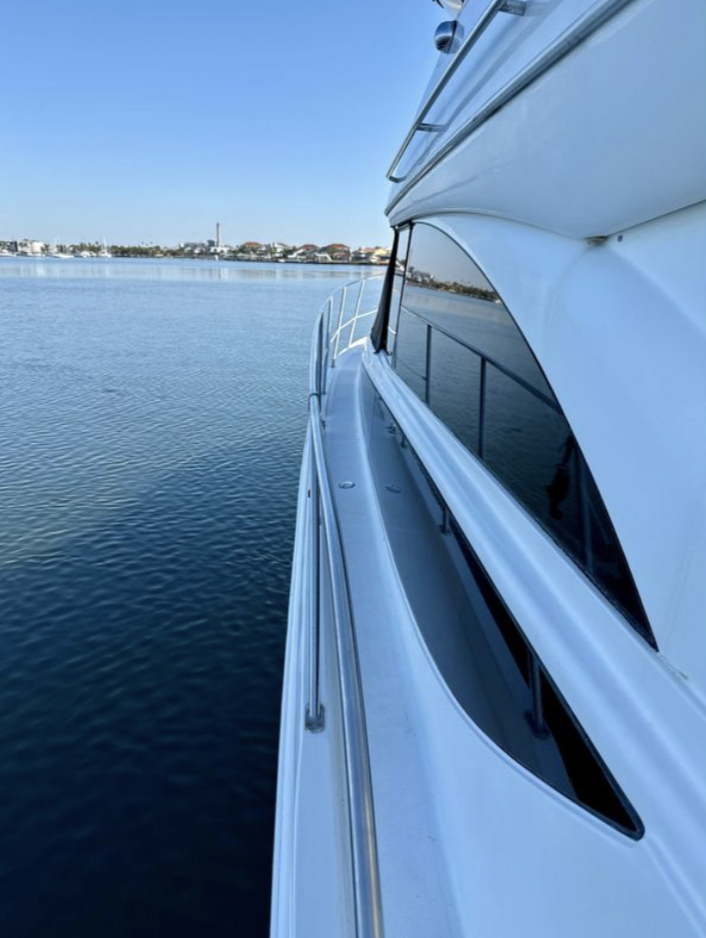 The helm is upgraded with Raymarine GPS, Autopilot, Radar, Mercury VesselView, onboard WiFi, and full digital monitoring. A full eisenglass flybridge enclosure and protective canvas covers keep the vessel in excellent condition.