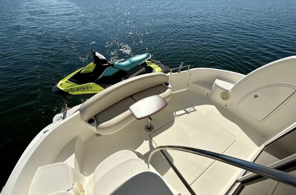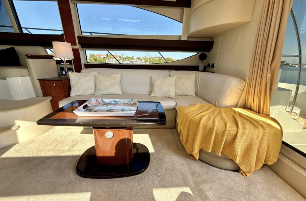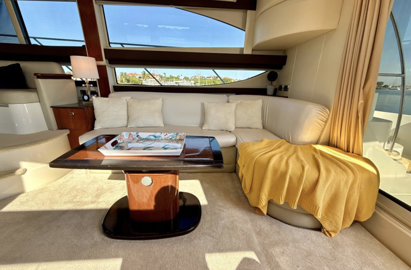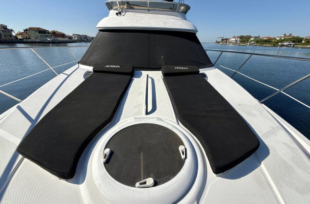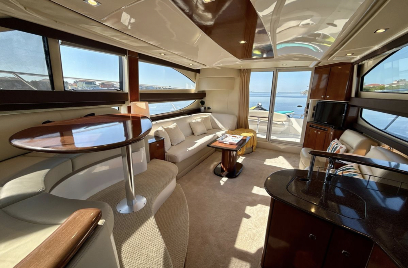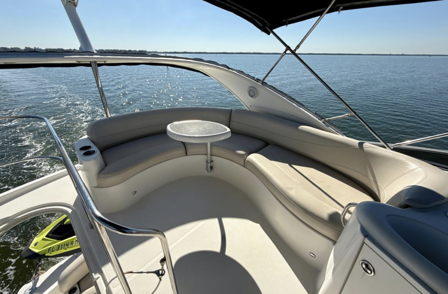 The helm is upgraded with Raymarine GPS, Autopilot, Radar, Mercury VesselView, onboard WiFi, and full digital monitoring. A full eisenglass flybridge enclosure and protective canvas covers keep the vessel in excellent condition.