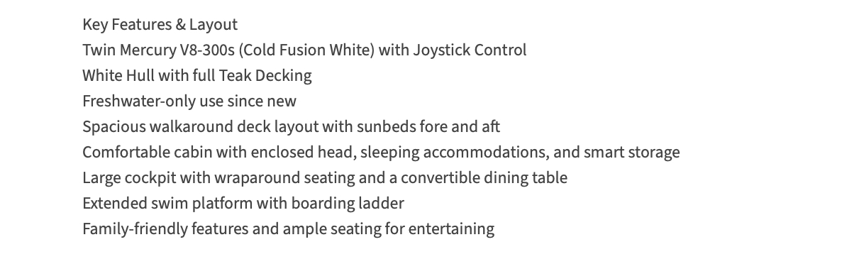 Le bateau qui est présenté sur cette page, l’est uniquement à titre d'information et n'est pas nécessairement toujours disponible à la vente et/ou à la location. Ce bateau est peut-être offert sous réserve, il faut vérifier sa disponibilité. Ce document ou cette annonce n'est pas contractuel. Les informations sur les bateaux affichées dans les résultats ci-dessus sont présentées en toute bonne foi et, bien qu'elles soient considérées comme correctes, elles ne sont pas garanties. Ita Yachts Canada et/ou ProprioBateau ne garantit pas et n'assume aucune responsabilité légale ou responsabilité pour l'exactitude, l'exhaustivité ou l'utilité des informations et/ou des images affichées, car elles peuvent ne pas être à jour ou encore êtres des images d'un bateau comparable. Toutes les informations sur les bateaux peuvent être modifiées sans préavis et sont sans garantie. Ce bateau est peut-être offert par un autre courtier ouvert au co-courtage (co-brokerage).