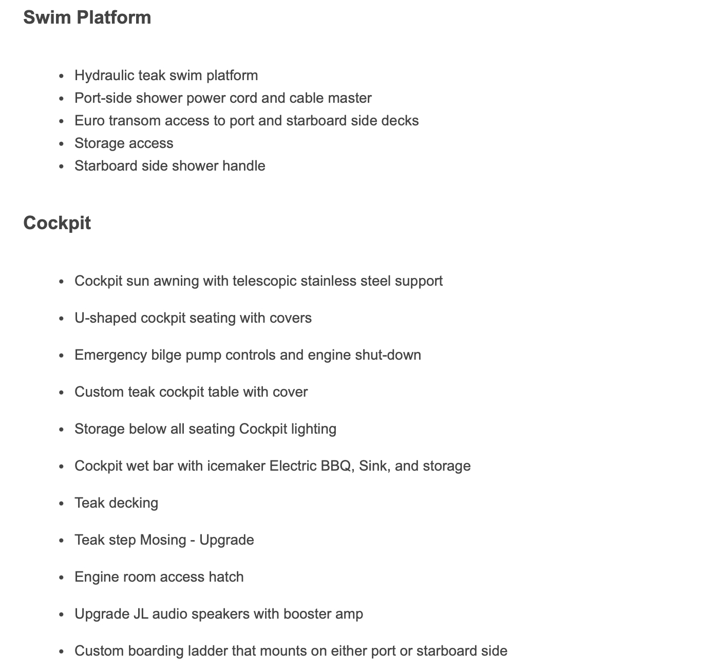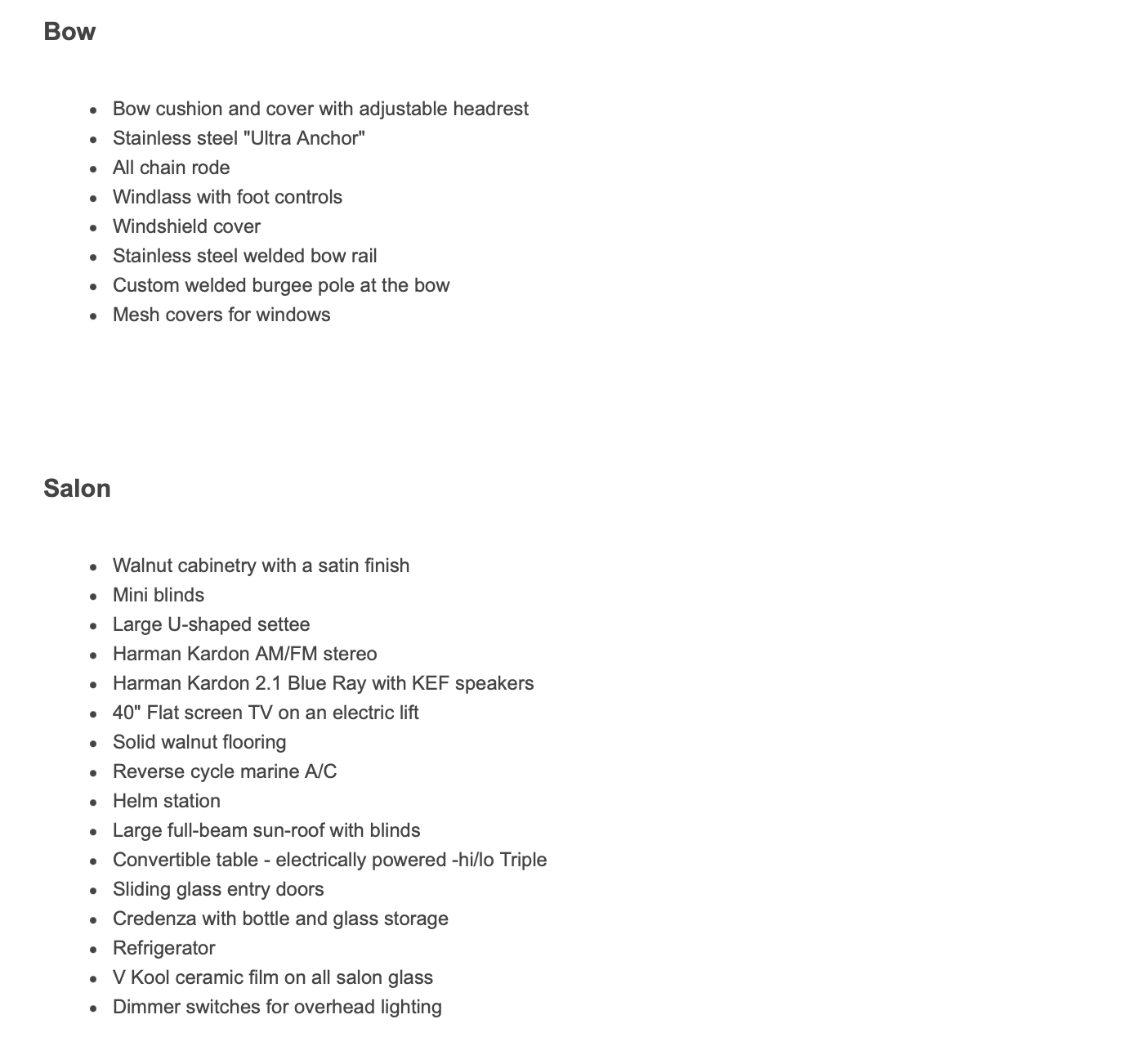 Le bateau qui est présenté sur cette page, l’est uniquement à titre d'information et n'est pas nécessairement toujours disponible à la vente et/ou à la location. Ce bateau est peut-être offert sous réserve, il faut vérifier sa disponibilité. Ce document ou cette annonce n'est pas contractuel. Les informations sur les bateaux affichées dans les résultats ci-dessus sont présentées en toute bonne foi et, bien qu'elles soient considérées comme correctes, elles ne sont pas garanties. Ita Yachts Canada et/ou ProprioBateau ne garantit pas et n'assume aucune responsabilité légale ou responsabilité pour l'exactitude, l'exhaustivité ou l'utilité des informations et/ou des images affichées, car elles peuvent ne pas être à jour ou encore êtres des images d'un bateau comparable. Toutes les informations sur les bateaux peuvent être modifiées sans préavis et sont sans garantie. Ce bateau est peut-être offert par un autre courtier ouvert au co-courtage (co-brokerage).