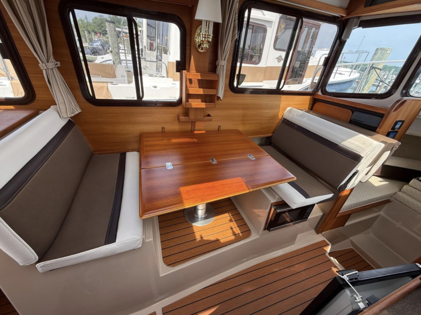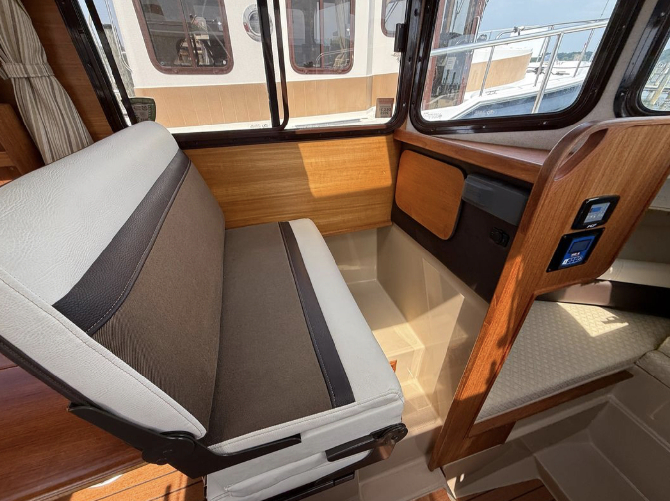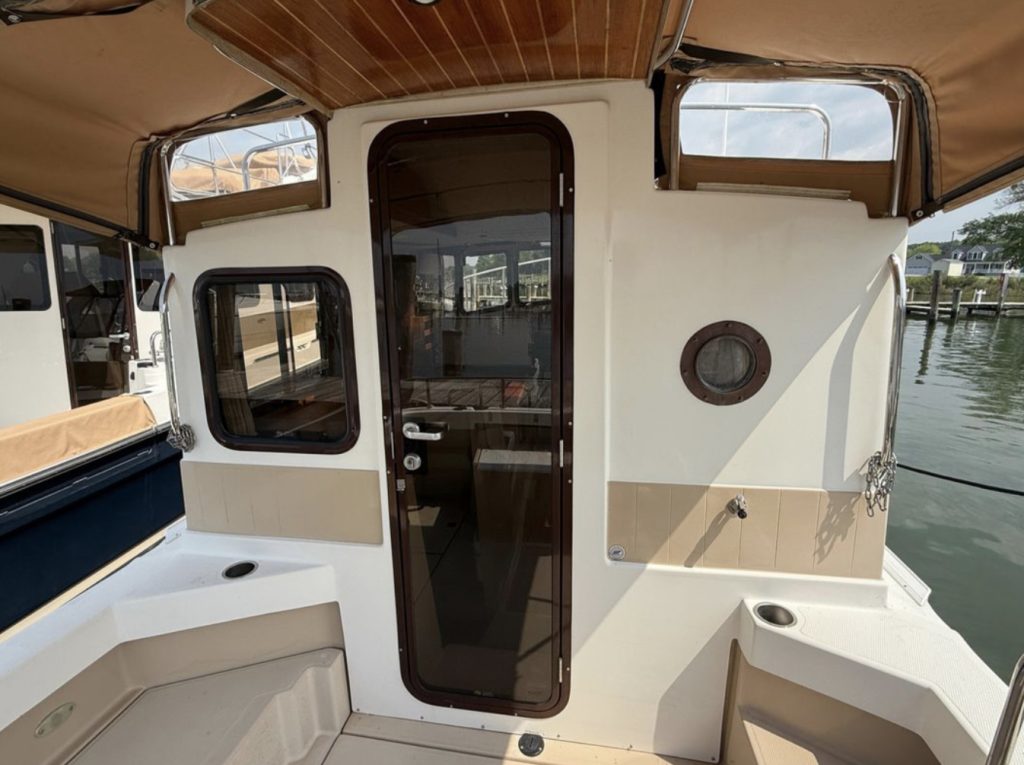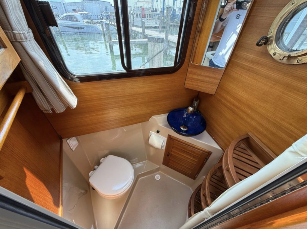 The spacious front v-berth sleeps two adults and is over 6’5″ in length. Cooks will love the standard galley which includes a sink, refrigerator, inverter, microwave and a combination propane stove/oven. The marine head is standard with an electric flush toilet, glass vessel sink and shower.