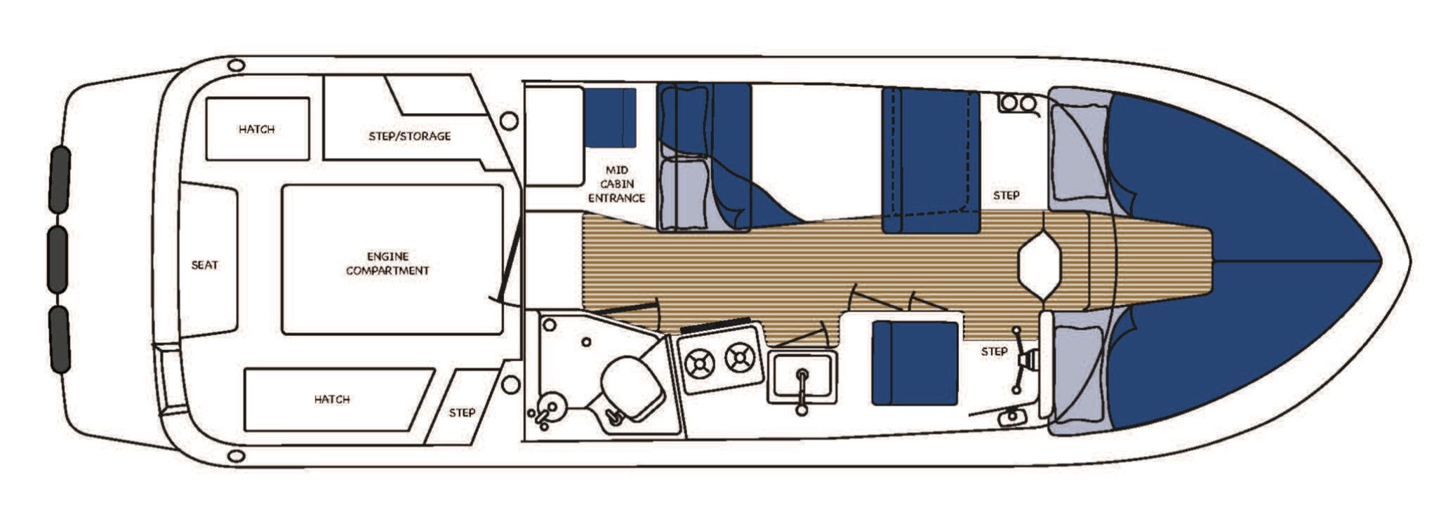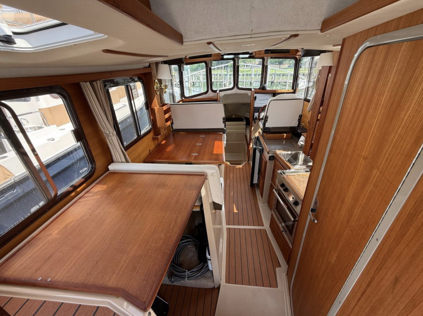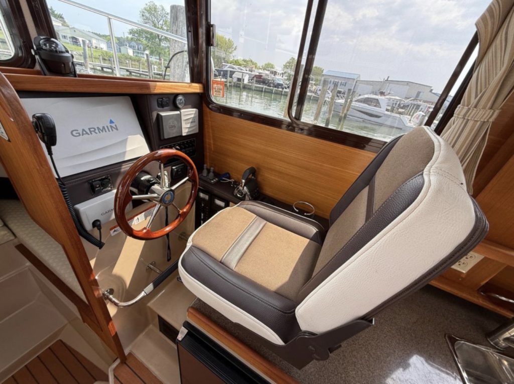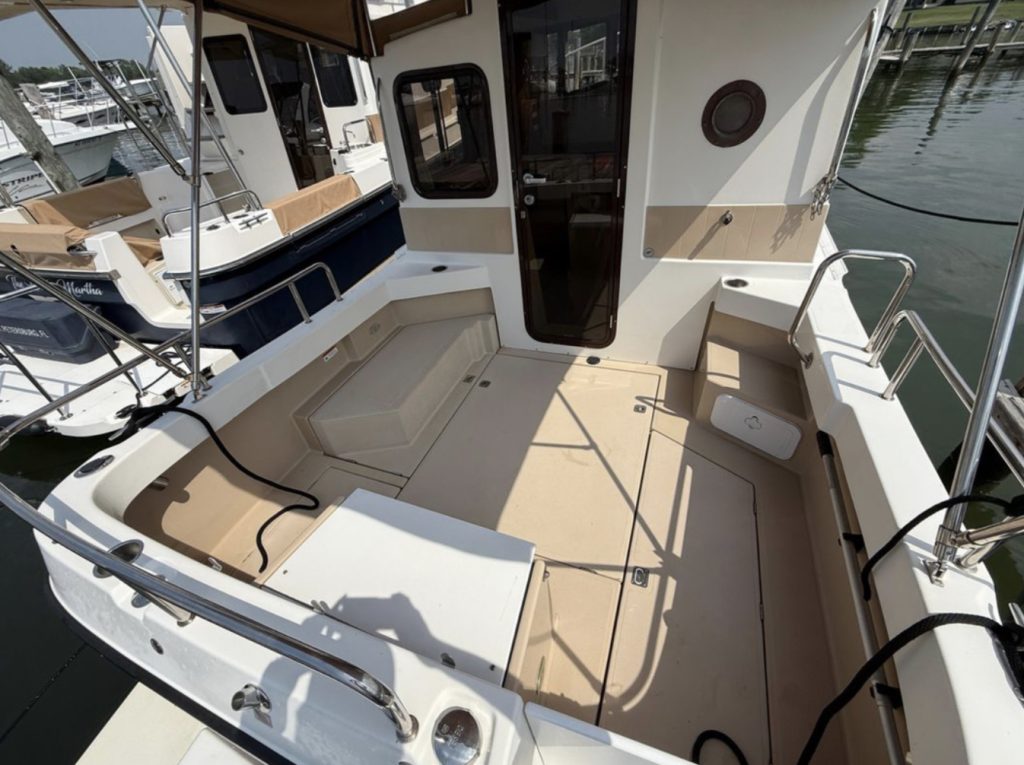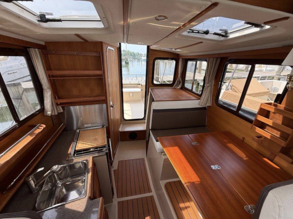The R-27 has nearly 50 Sq ft of aft deck space allowing for easy access to the standard 200 HP Volvo diesel while keeping engine noise out of the cabin. The well appointed cabin has a midship office with desk and seat, this space also converts to a berth that sleeps two. The dinette table is on a hydraulic piston that allows for an easy conversion to a berth or lounging area.