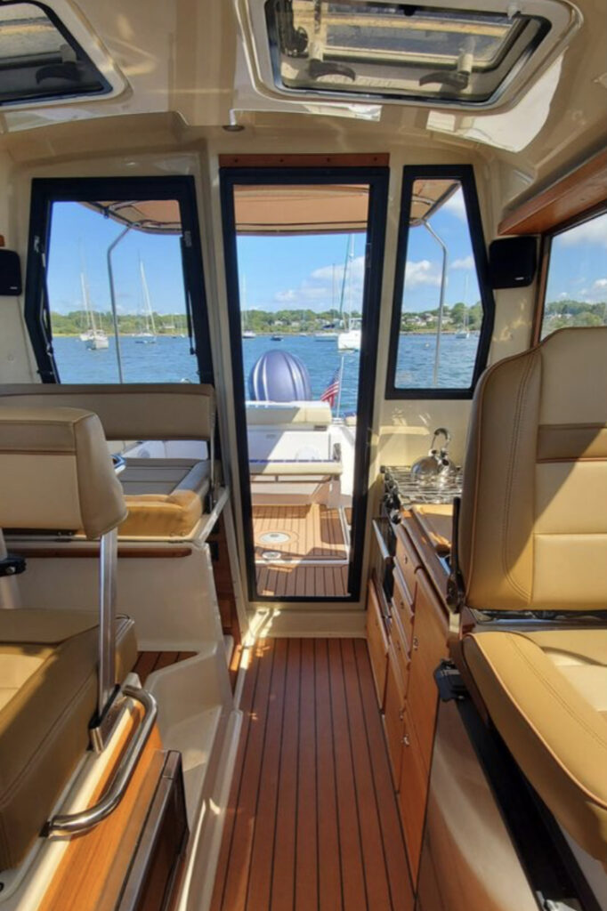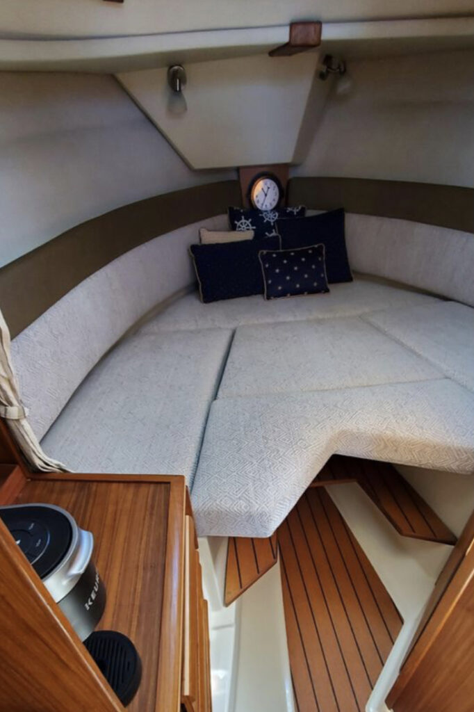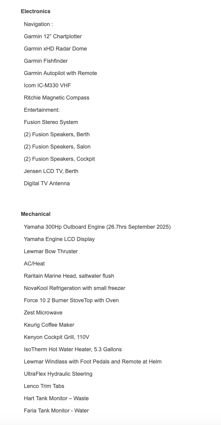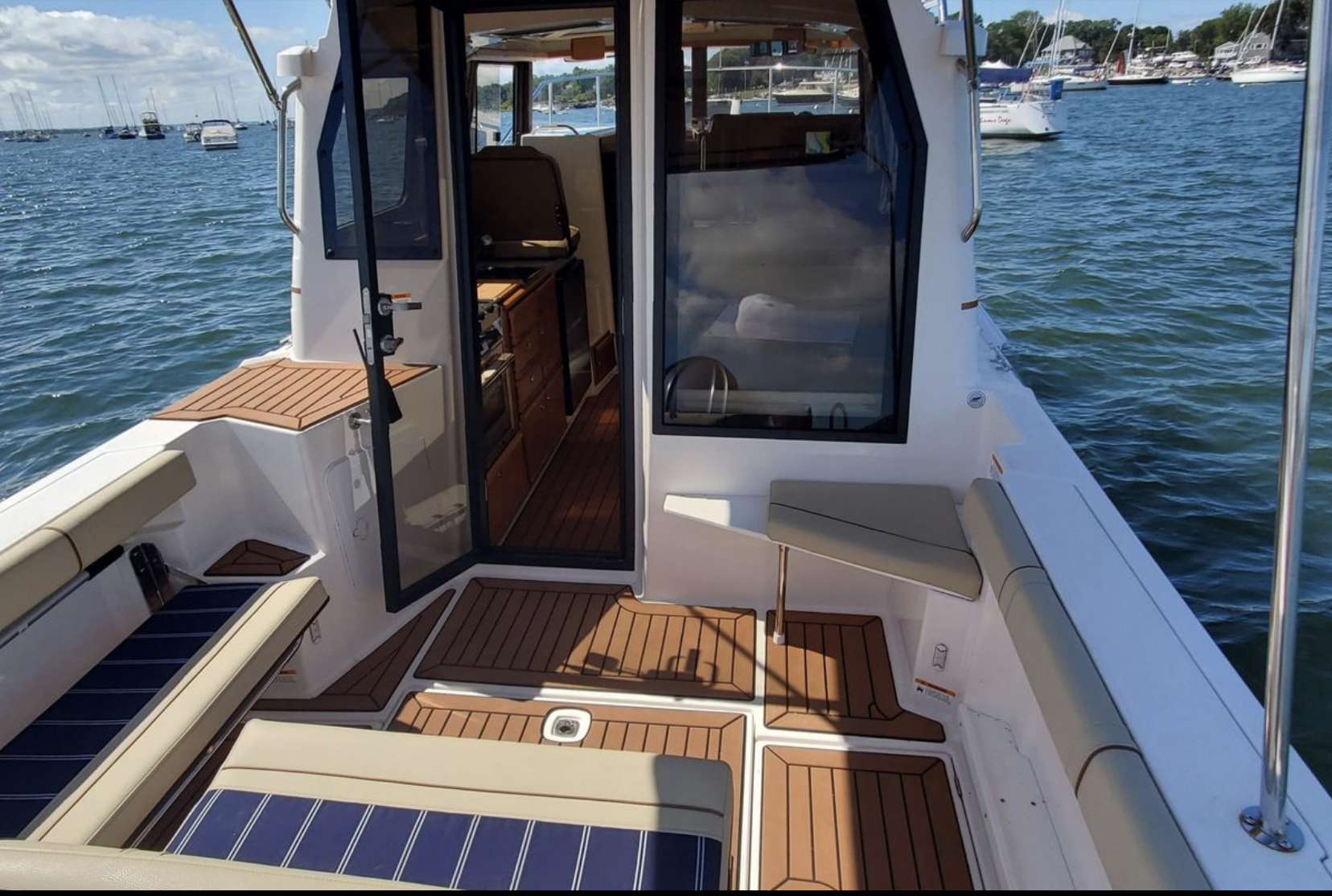 Powered by a Yamaha F300 outboard motor, the R-27 ensures swift journeys to your next destination. She comes fully equipped with a comprehensive suite of Garmin electronics, including a plotter, radar, fishfinder, and autopilot, as well as a Fusion stereo system with speakers throughout the boat. Additional features include a bow thruster, thoughtfully designed low-level and accent lighting, and underwater lights.