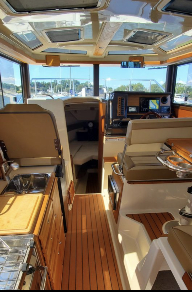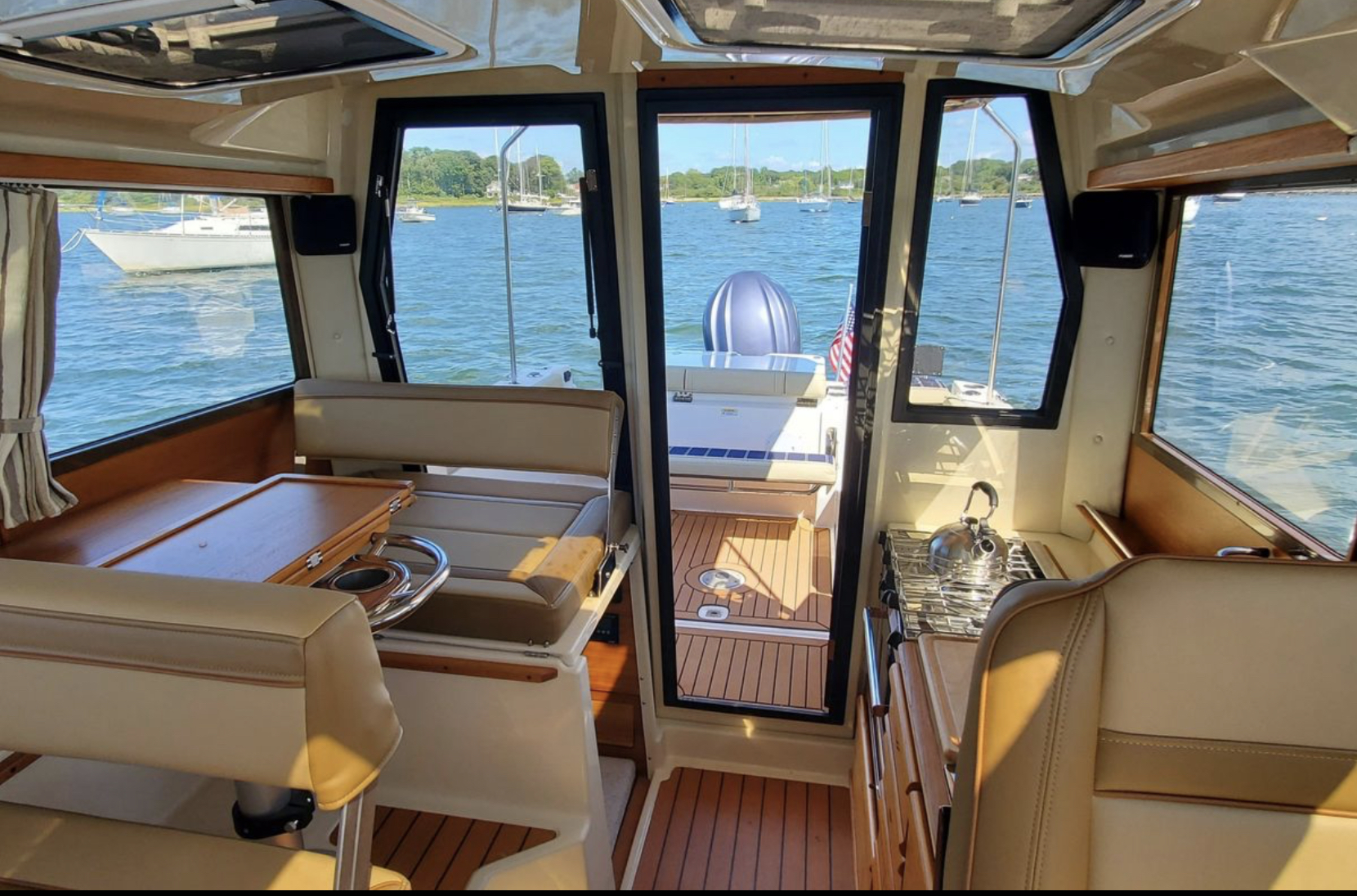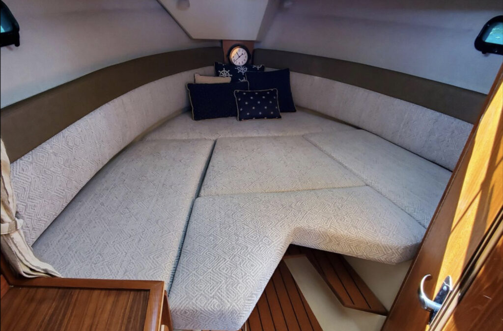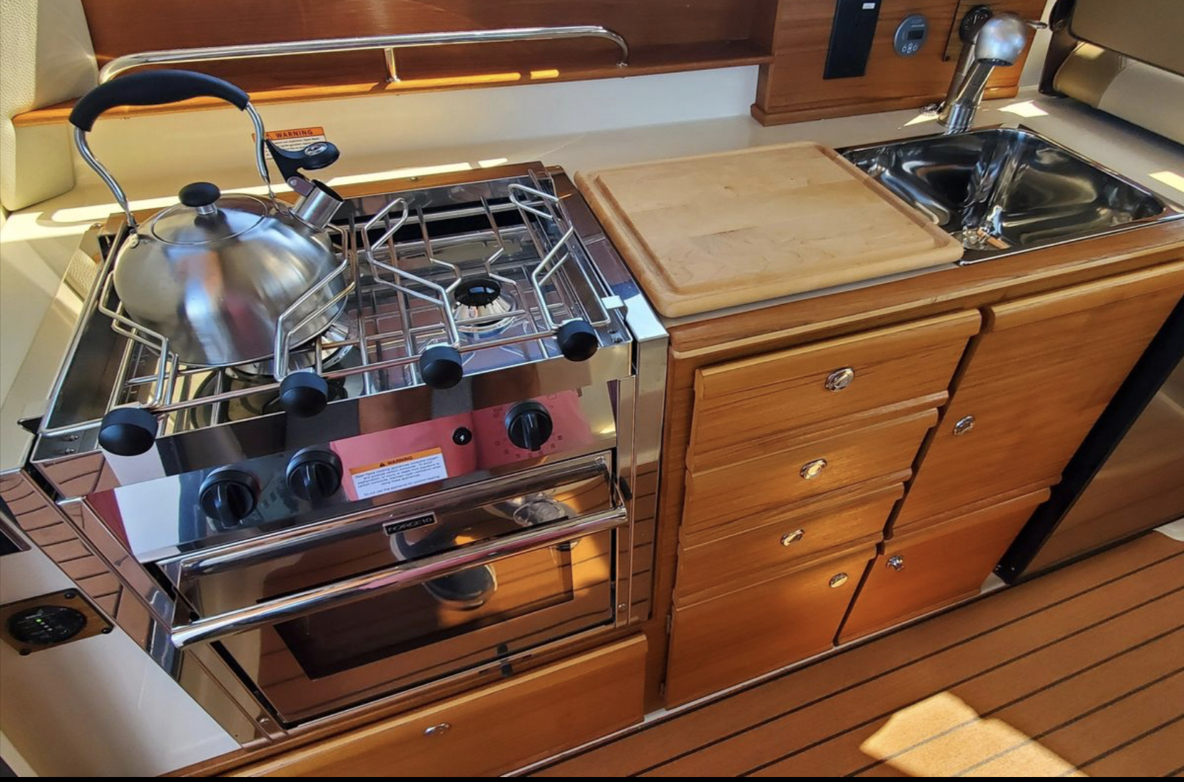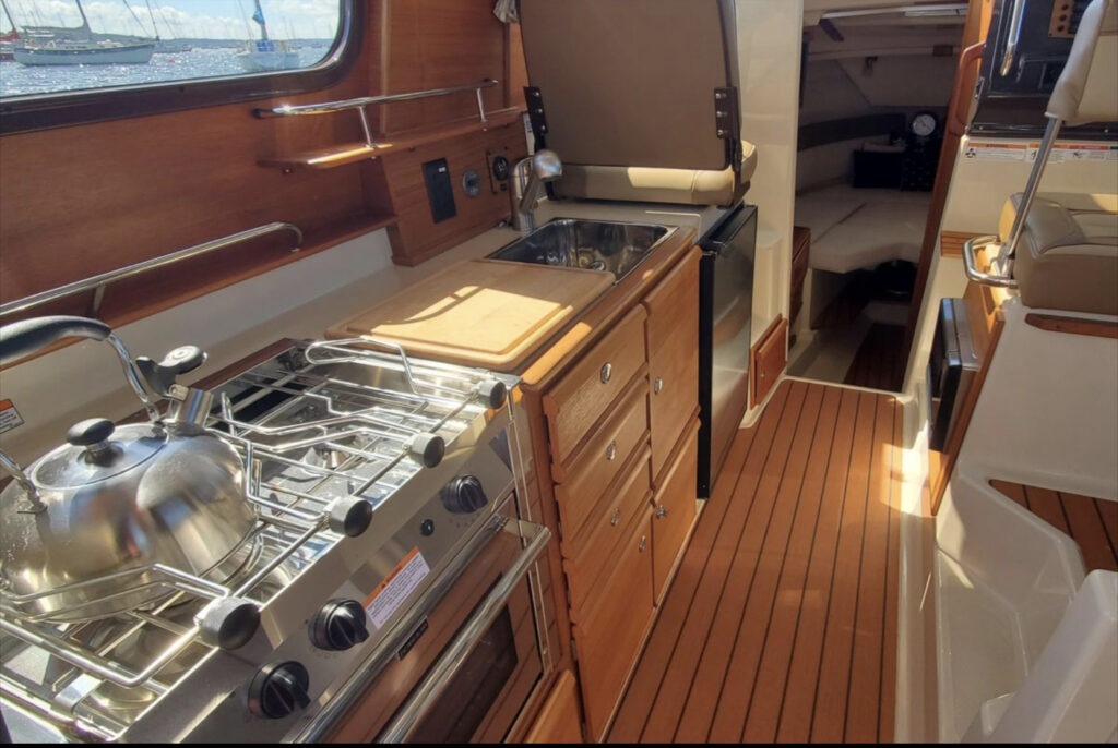 The full galley and removable electric Kenyon grill are perfect for culinary enthusiasts, while the spacious cockpit and double bow lounge seat offer ideal spots to enjoy a sunset.