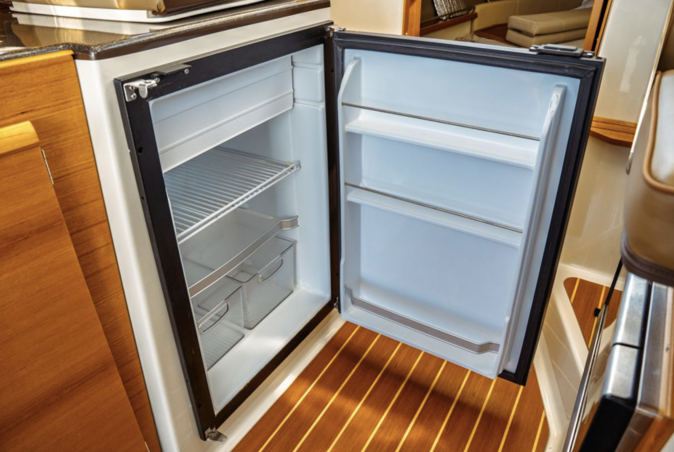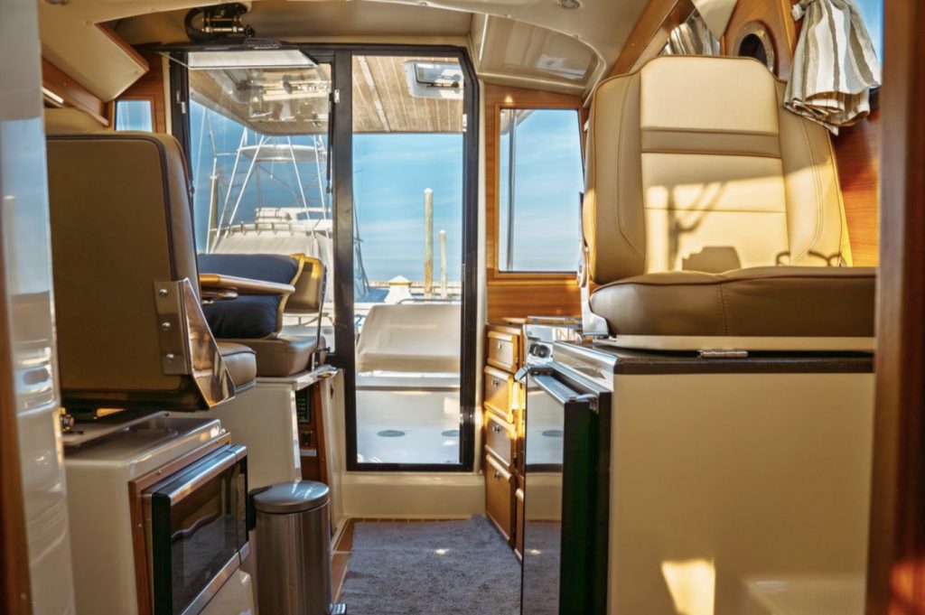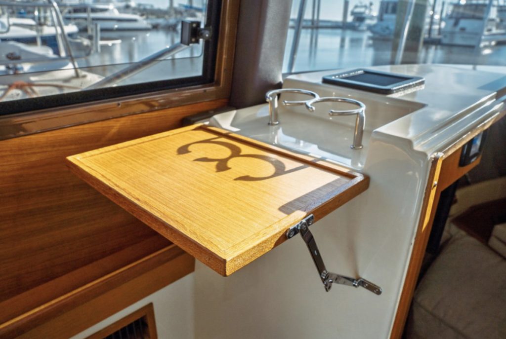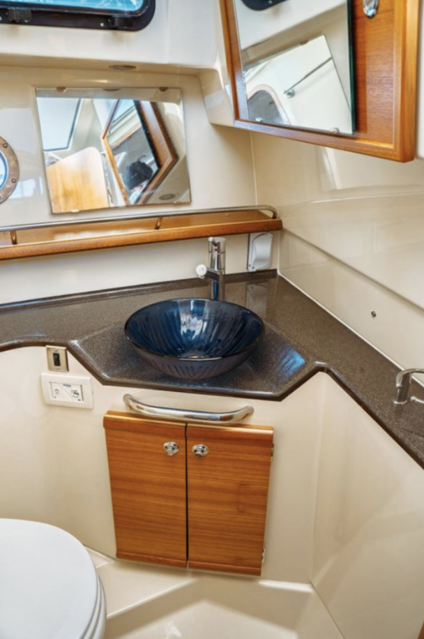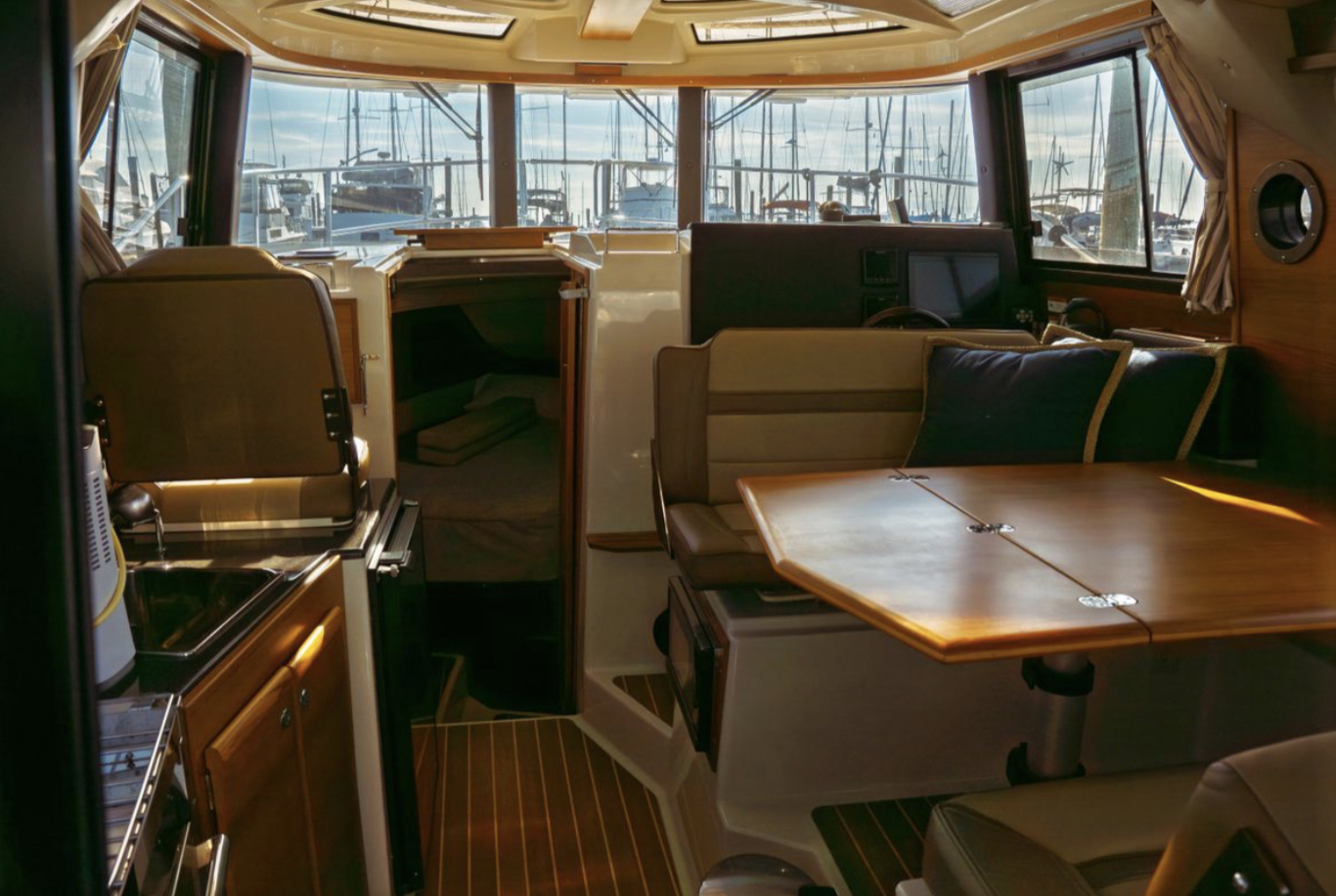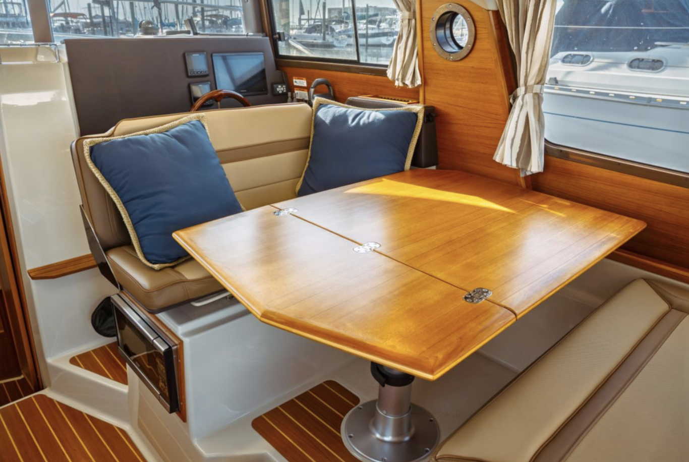 The Ranger R-29S (sedan) is another masterpiece of innovation. The more modern styling features a curved front window and an overhead glass atrium that provides exceptional visibility from the helm station and salon area. An ingenious aft cockpit seating arrangement includes a reversible seat, port and starboard jump seats and a teak table for outside dining. The opening cabin bulkhead with reversible seat also provides additional cockpit seating while bringing the outside-in.