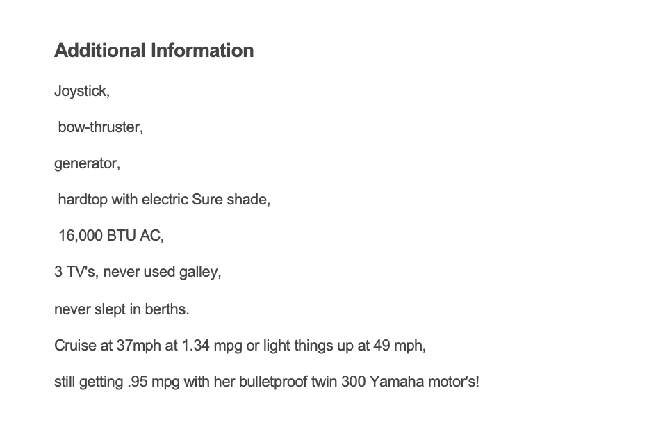 Le bateau qui est présenté sur cette page, l’est uniquement à titre d'information et n'est pas nécessairement toujours disponible à la vente et/ou à la location. Ce bateau est peut-être offert sous réserve, il faut vérifier sa disponibilité. Ce document ou cette annonce n'est pas contractuel. Les informations sur les bateaux affichées dans les résultats ci-dessus sont présentées en toute bonne foi et, bien qu'elles soient considérées comme correctes, elles ne sont pas garanties. Ita Yachts Canada et/ou ProprioBateau ne garantit pas et n'assume aucune responsabilité légale ou responsabilité pour l'exactitude, l'exhaustivité ou l'utilité des informations et/ou des images affichées, car elles peuvent ne pas être à jour ou encore êtres des images d'un bateau comparable. Toutes les informations sur les bateaux peuvent être modifiées sans préavis et sont sans garantie. Ce bateau est peut-être offert par un autre courtier ouvert au co-courtage (co-brokerage).
