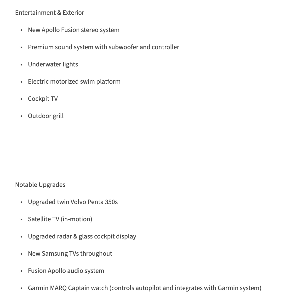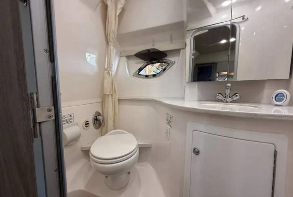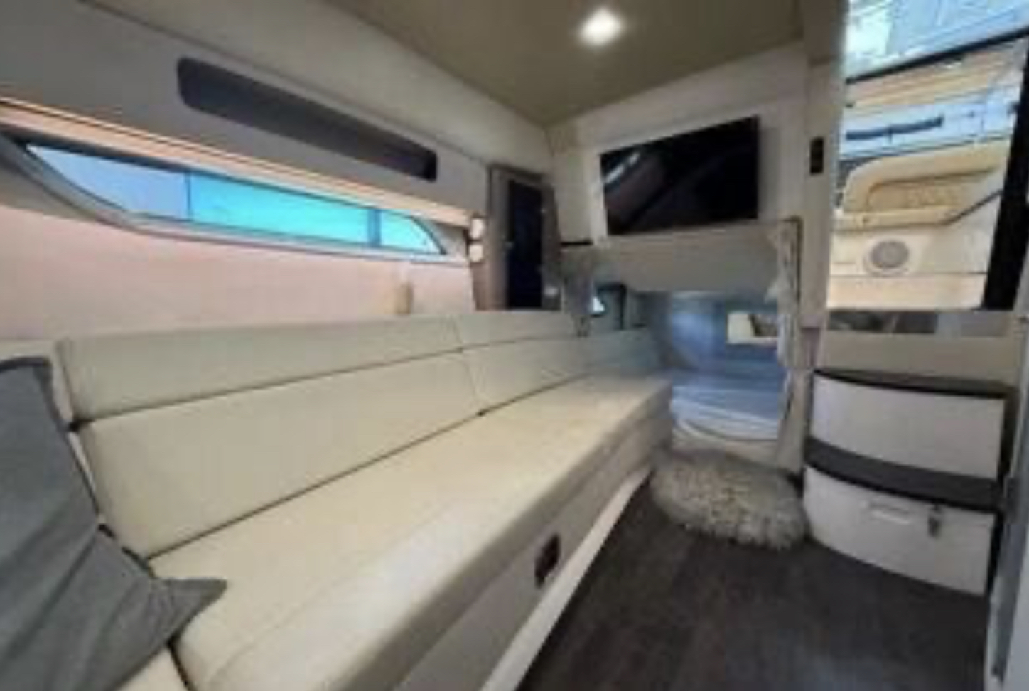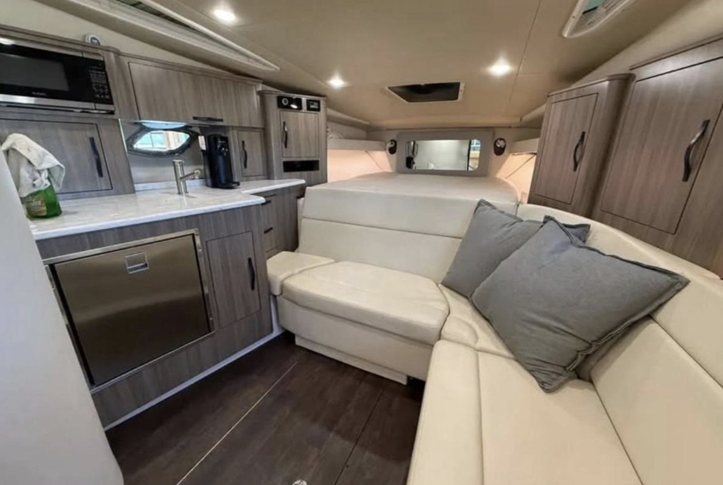 Powered by upgraded twin Volvo Penta 350 V8 gasoline engines (standard is 300s) with stainless steel DuoProps, the boat delivers excellent performance, efficiency, and reliability. Engines, and drives have 518 hours and have been consistently maintained to a high standard.