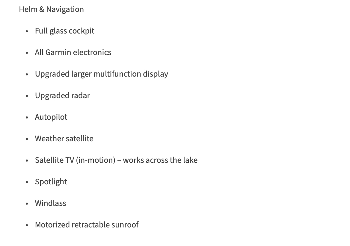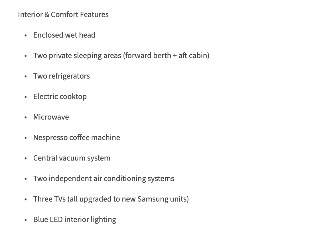 Le bateau qui est présenté sur cette page, l’est uniquement à titre d'information et n'est pas nécessairement toujours disponible à la vente et/ou à la location. Ce bateau est peut-être offert sous réserve, il faut vérifier sa disponibilité. Ce document ou cette annonce n'est pas contractuel. Les informations sur les bateaux affichées dans les résultats ci-dessus sont présentées en toute bonne foi et, bien qu'elles soient considérées comme correctes, elles ne sont pas garanties. Ita Yachts Canada et/ou ProprioBateau ne garantit pas et n'assume aucune responsabilité légale ou responsabilité pour l'exactitude, l'exhaustivité ou l'utilité des informations et/ou des images affichées, car elles peuvent ne pas être à jour ou encore êtres des images d'un bateau comparable. Toutes les informations sur les bateaux peuvent être modifiées sans préavis et sont sans garantie. Ce bateau est peut-être offert par un autre courtier ouvert au co-courtage (co-brokerage).