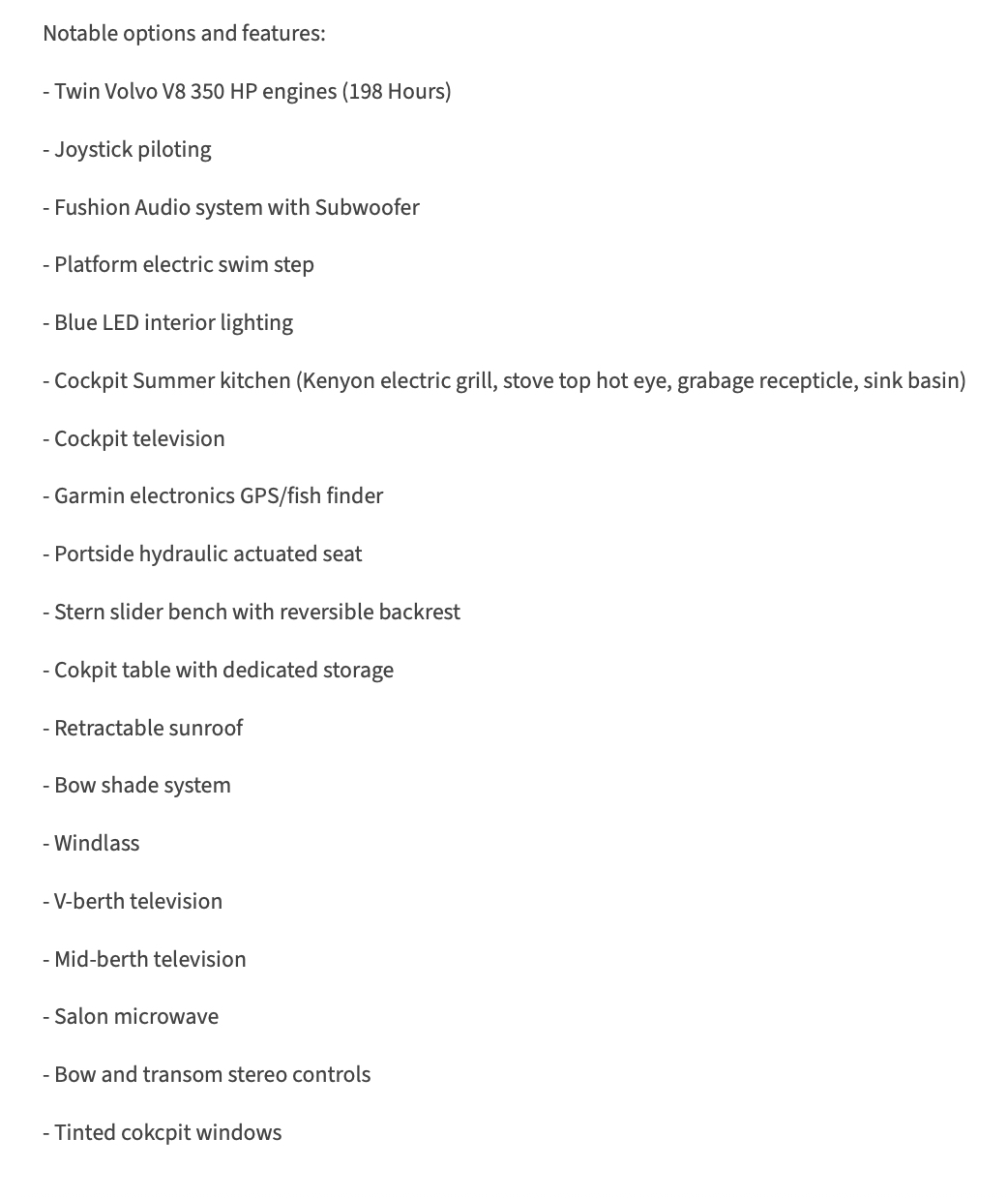 Le bateau qui est présenté sur cette page, l’est uniquement à titre d'information et n'est pas nécessairement toujours disponible à la vente et/ou à la location. Ce bateau est peut-être offert sous réserve, il faut vérifier sa disponibilité. Ce document ou cette annonce n'est pas contractuel. Les informations sur les bateaux affichées dans les résultats ci-dessus sont présentées en toute bonne foi et, bien qu'elles soient considérées comme correctes, elles ne sont pas garanties. Ita Yachts Canada et/ou ProprioBateau ne garantit pas et n'assume aucune responsabilité légale ou responsabilité pour l'exactitude, l'exhaustivité ou l'utilité des informations et/ou des images affichées, car elles peuvent ne pas être à jour ou encore êtres des images d'un bateau comparable. Toutes les informations sur les bateaux peuvent être modifiées sans préavis et sont sans garantie. Ce bateau est peut-être offert par un autre courtier ouvert au co-courtage (co-brokerage).