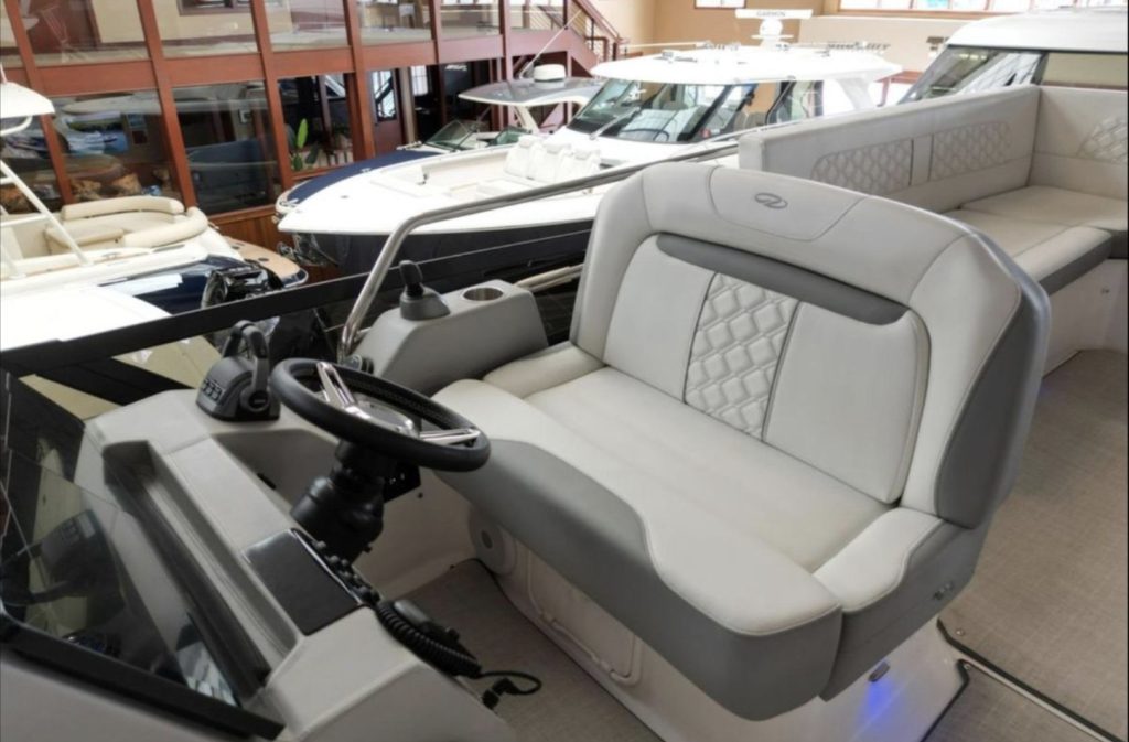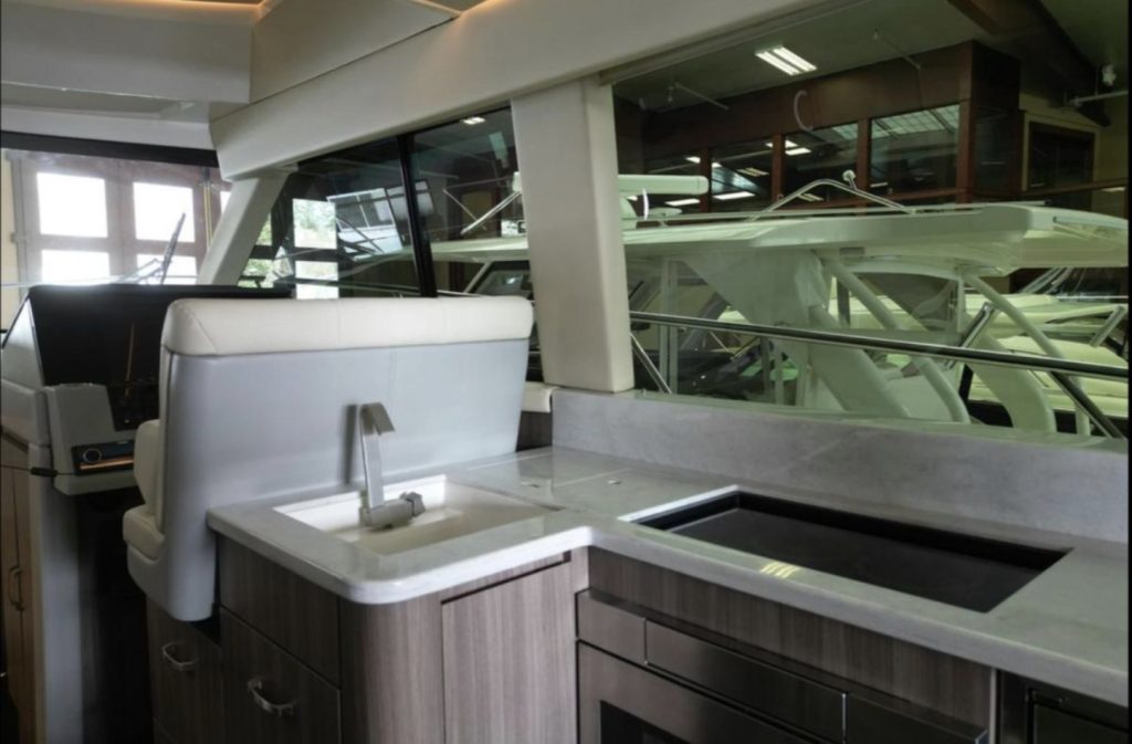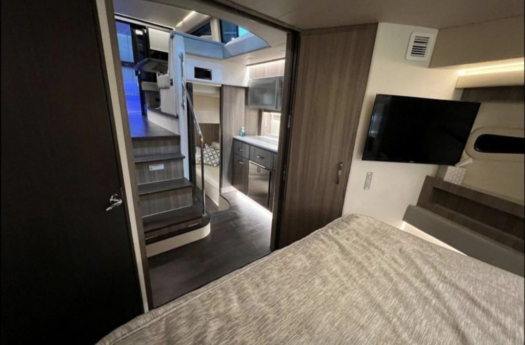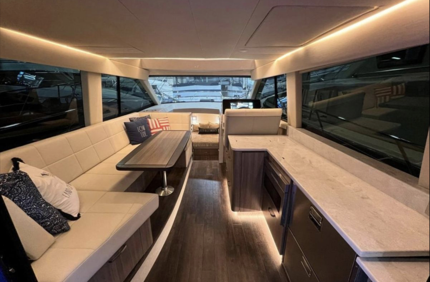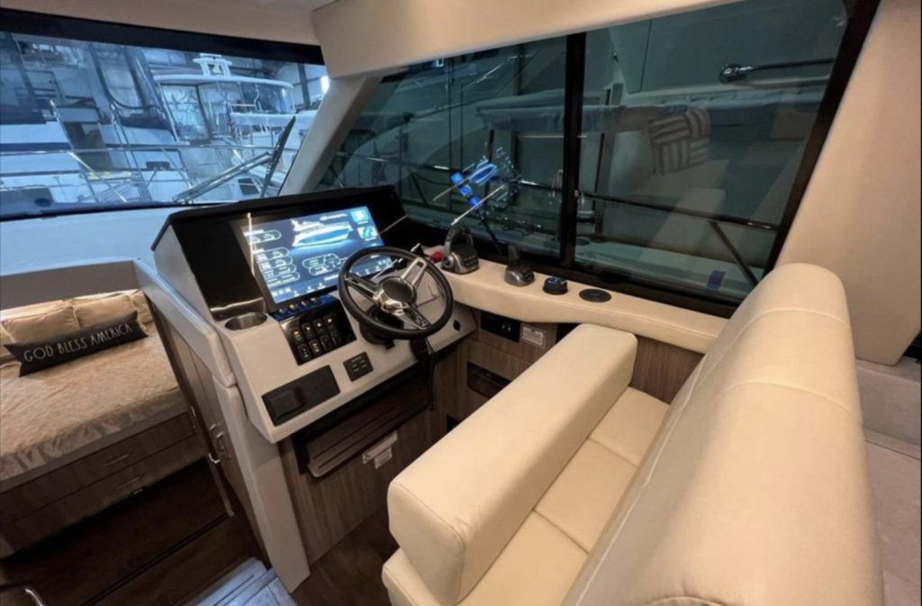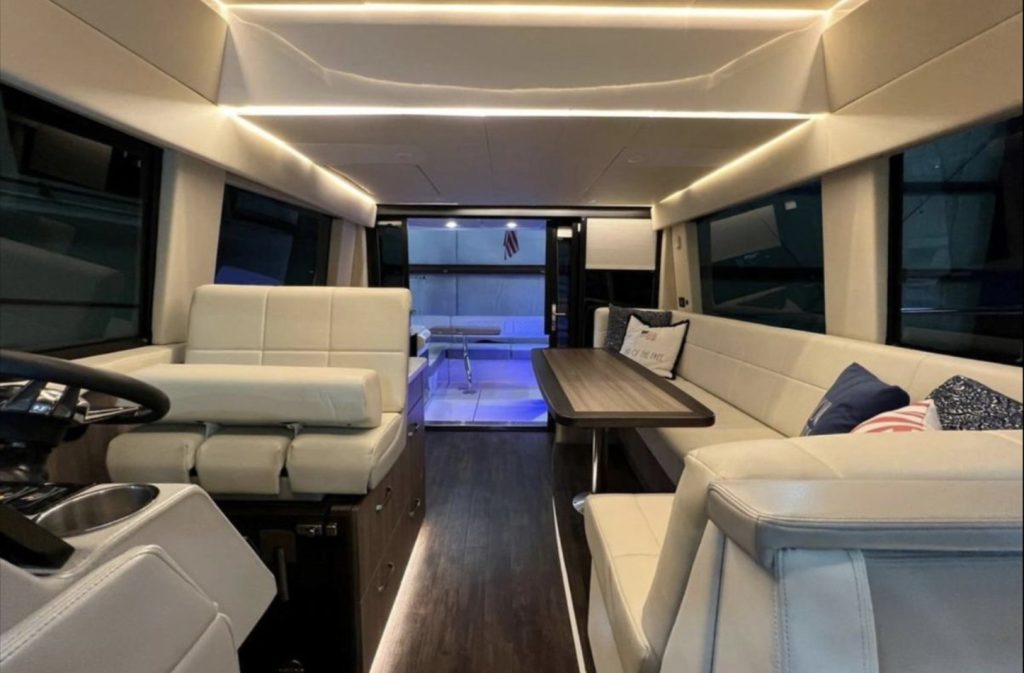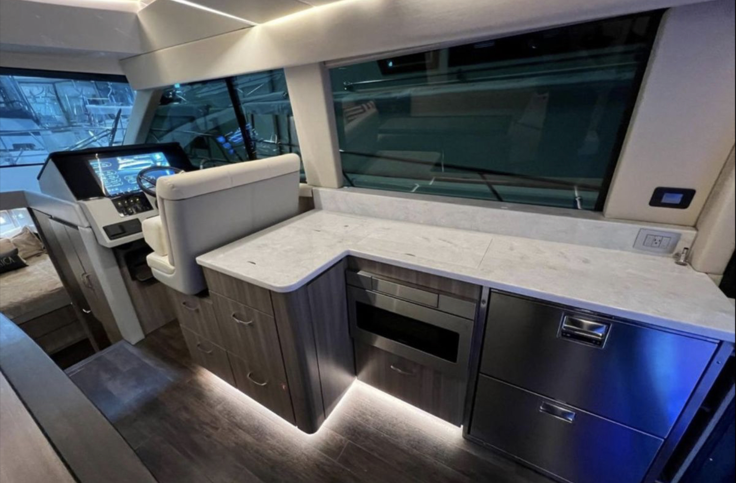 Inside, the salon is warm and inviting with Maple Rum flooring, custom wood accents, and large windows that flood the space with natural light. The well-appointed galley and refreshment center feature premium finishes, mosaic countertops, refrigeration, and smart storage. The aft cabin privacy door enhances livability for overnight stays, while the Seakeeper 3 stabilization system ensures a smooth ride underway or at anchor.