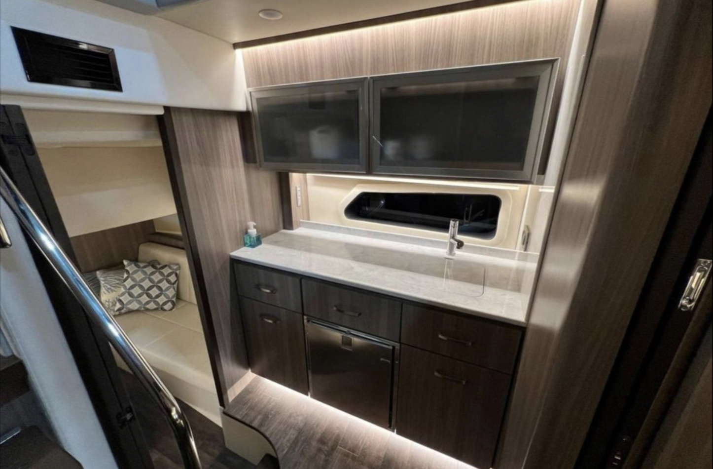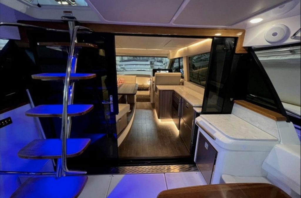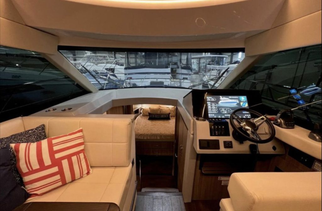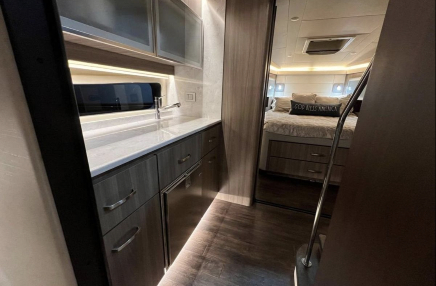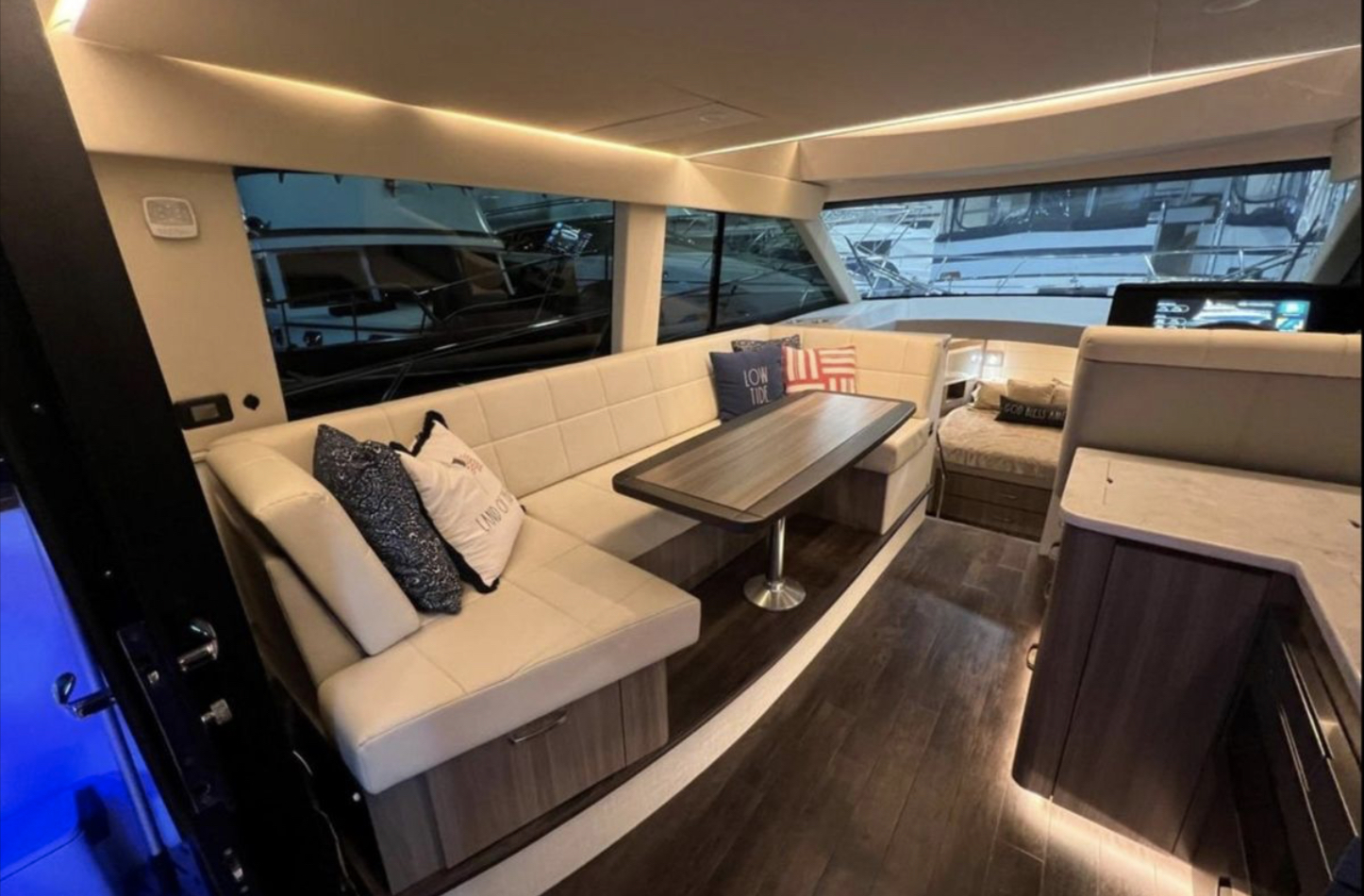 Inside, the salon is warm and inviting with Maple Rum flooring, custom wood accents, and large windows that flood the space with natural light. The well-appointed galley and refreshment center feature premium finishes, mosaic countertops, refrigeration, and smart storage. The aft cabin privacy door enhances livability for overnight stays, while the Seakeeper 3 stabilization system ensures a smooth ride underway or at anchor.