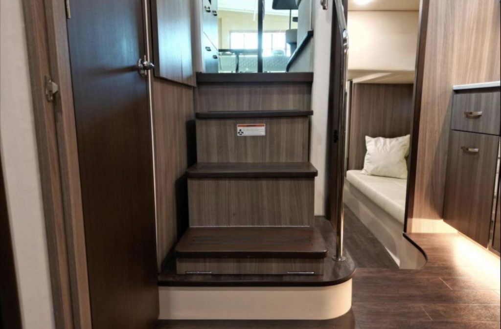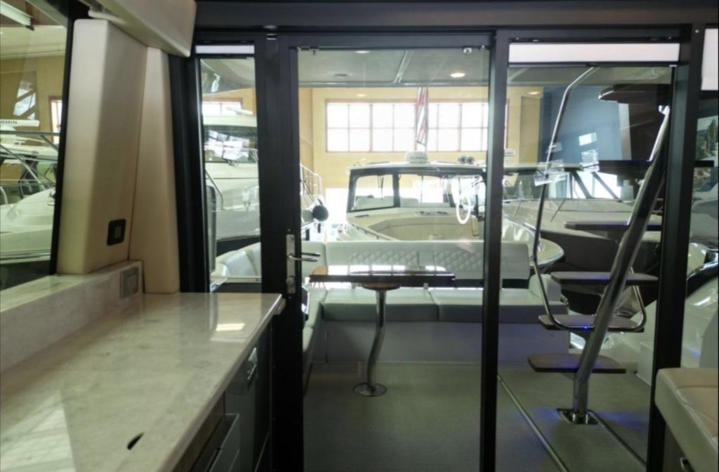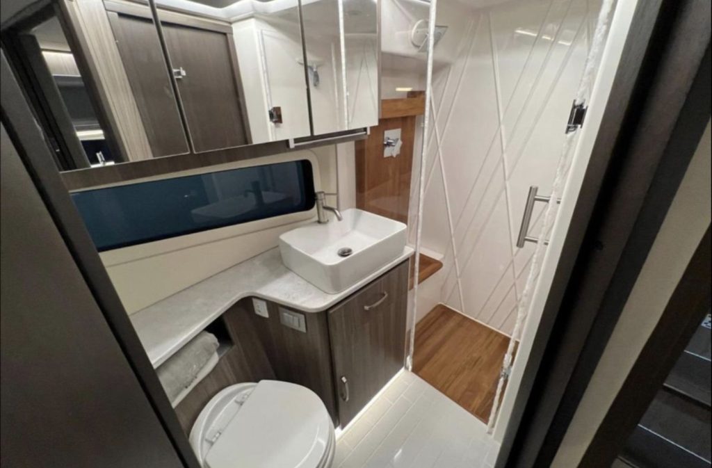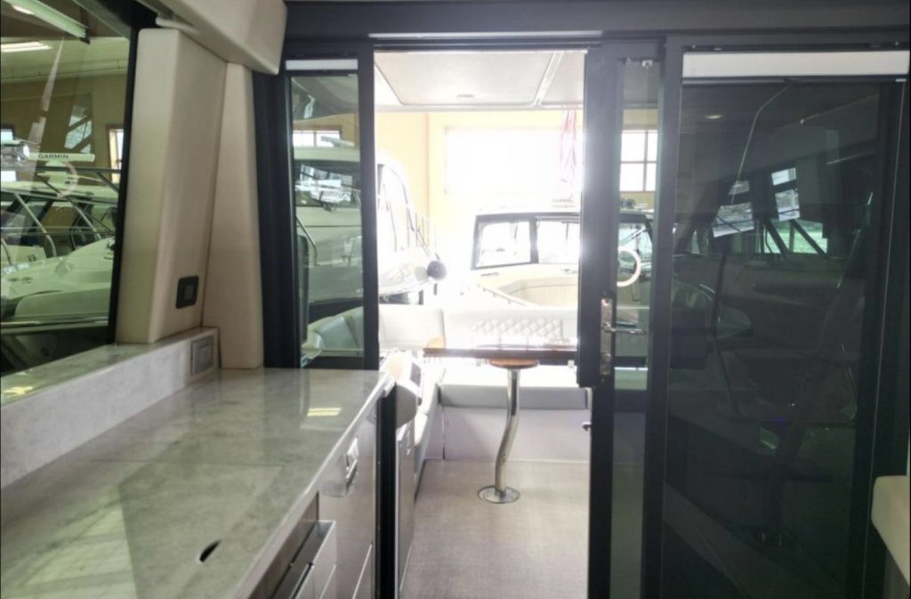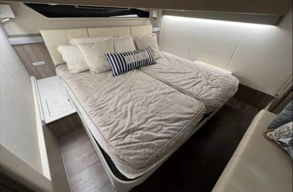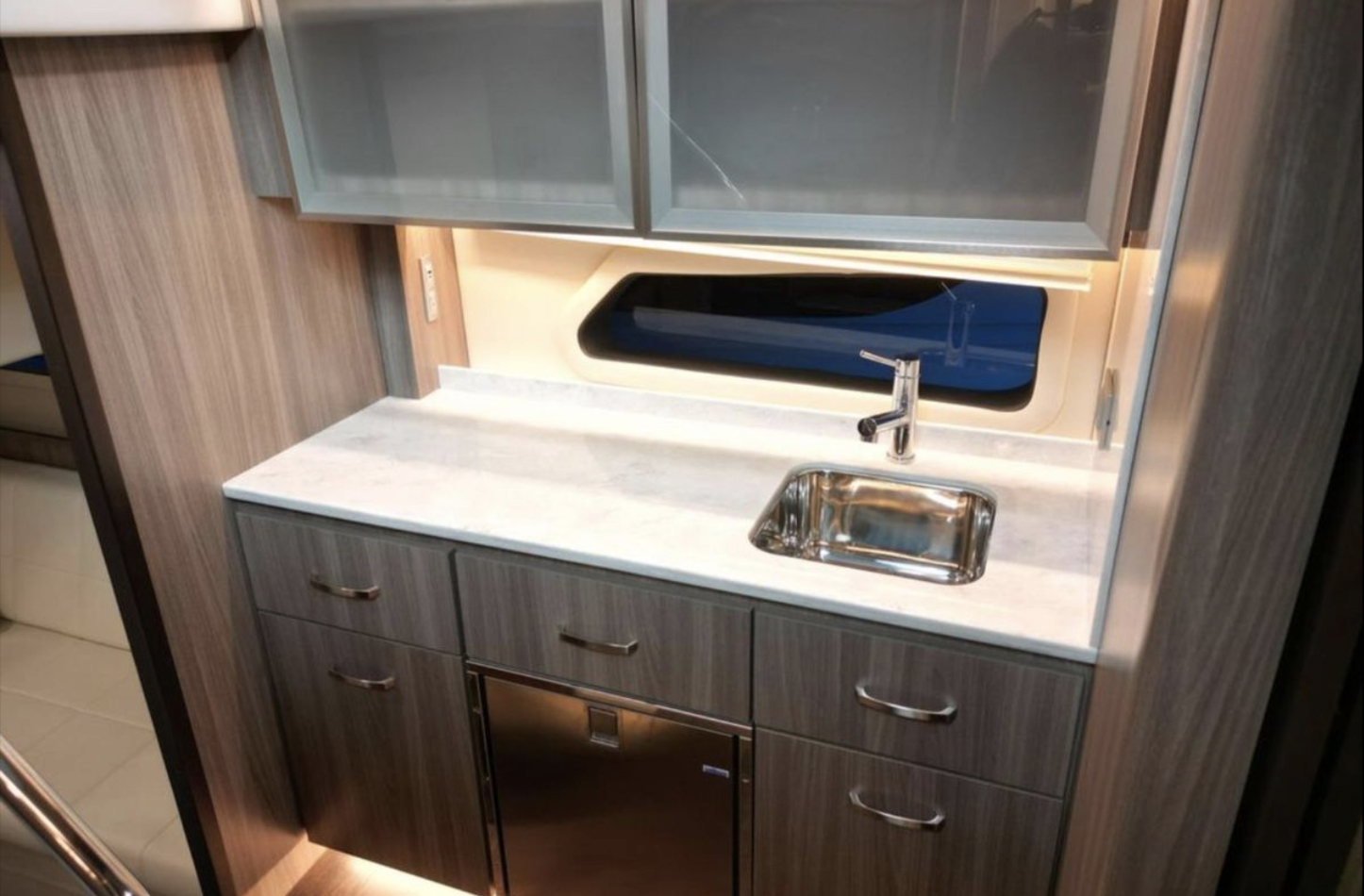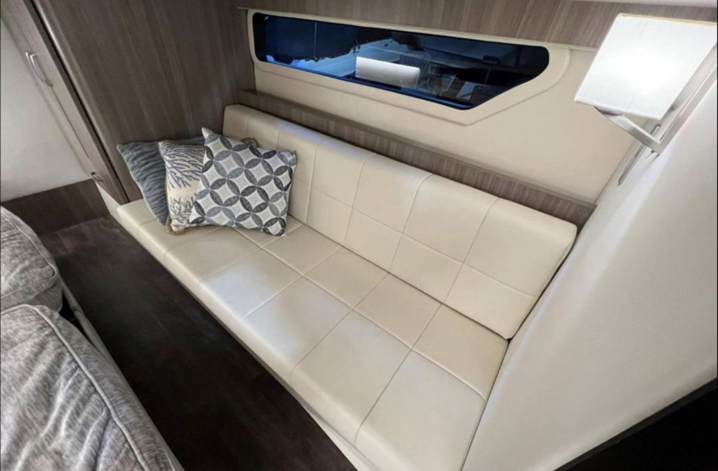 Inside, the salon is warm and inviting with Maple Rum flooring, custom wood accents, and large windows that flood the space with natural light. The well-appointed galley and refreshment center feature premium finishes, mosaic countertops, refrigeration, and smart storage. The aft cabin privacy door enhances livability for overnight stays, while the Seakeeper 3 stabilization system ensures a smooth ride underway or at anchor.