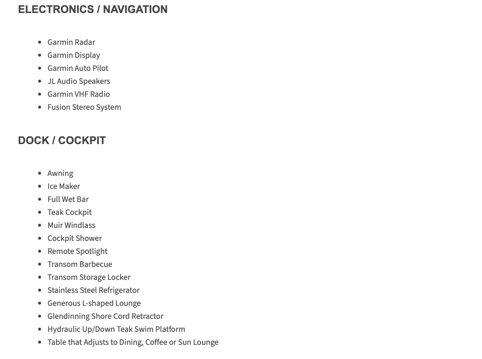 Le bateau qui est présenté sur cette page, l’est uniquement à titre d'information et n'est pas nécessairement toujours disponible à la vente et/ou à la location. Ce bateau est peut-être offert sous réserve, il faut vérifier sa disponibilité. Ce document ou cette annonce n'est pas contractuel. Les informations sur les bateaux affichées dans les résultats ci-dessus sont présentées en toute bonne foi et, bien qu'elles soient considérées comme correctes, elles ne sont pas garanties. Ita Yachts Canada et/ou ProprioBateau ne garantit pas et n'assume aucune responsabilité légale ou responsabilité pour l'exactitude, l'exhaustivité ou l'utilité des informations et/ou des images affichées, car elles peuvent ne pas être à jour ou encore êtres des images d'un bateau comparable. Toutes les informations sur les bateaux peuvent être modifiées sans préavis et sont sans garantie. Ce bateau est peut-être offert par un autre courtier ouvert au co-courtage (co-brokerage).