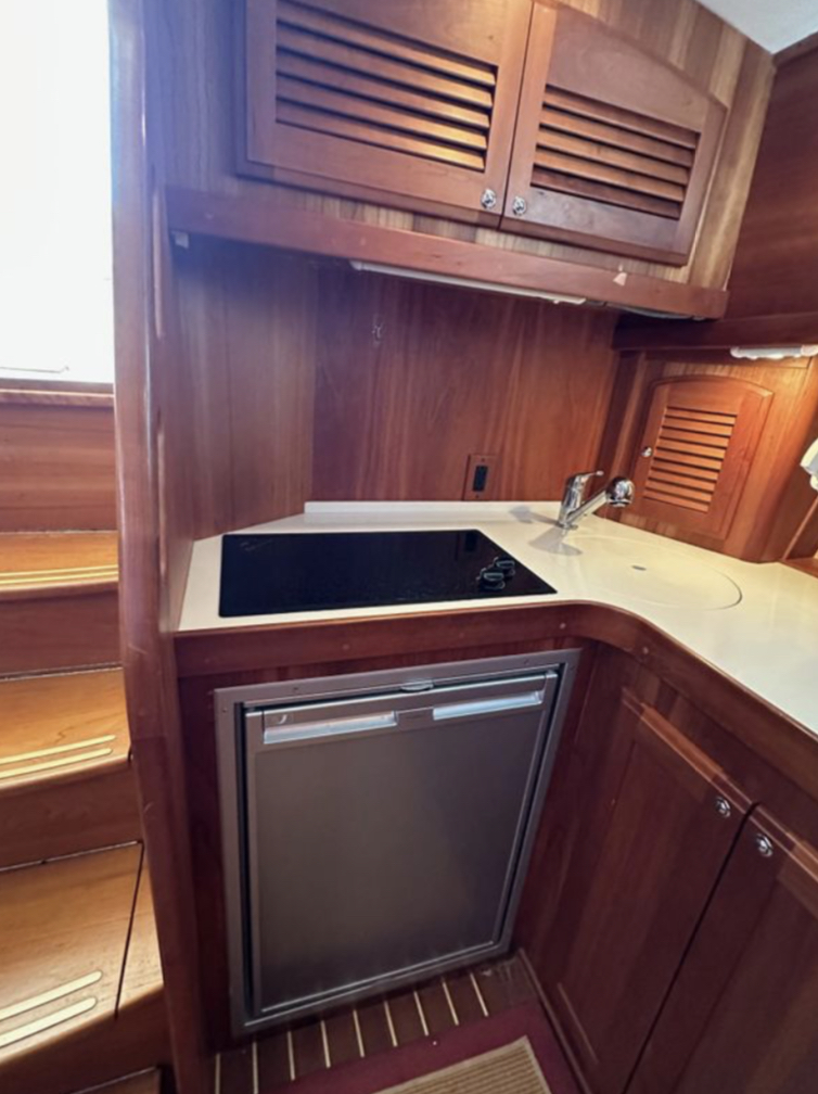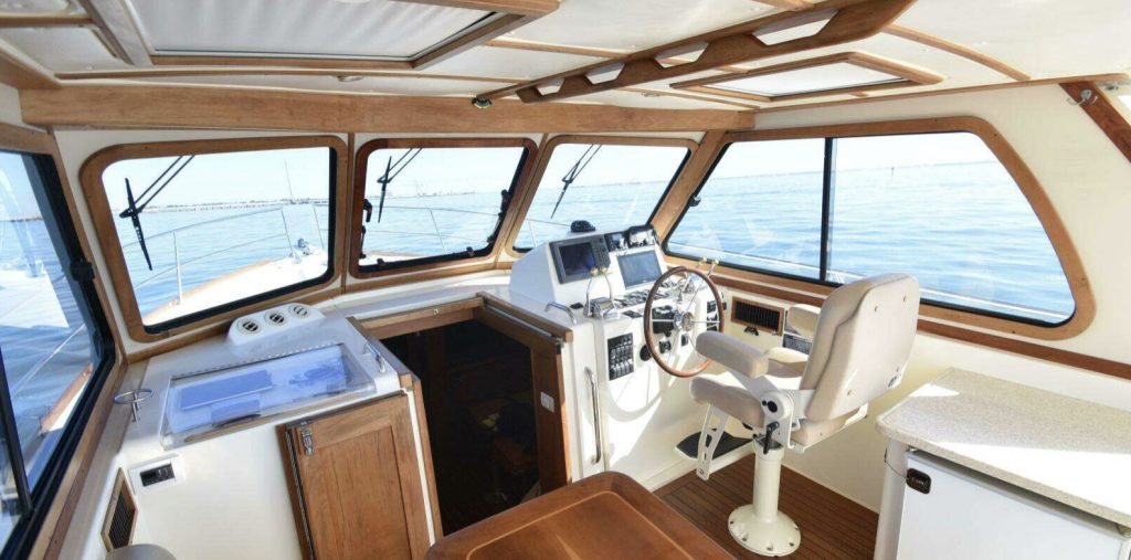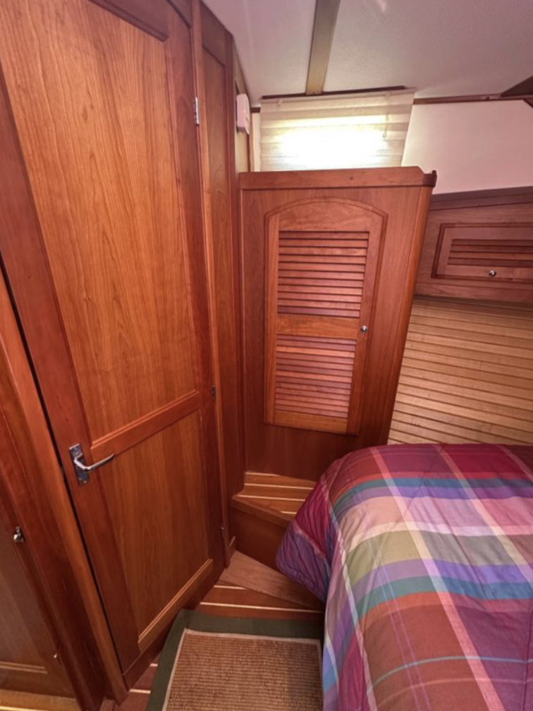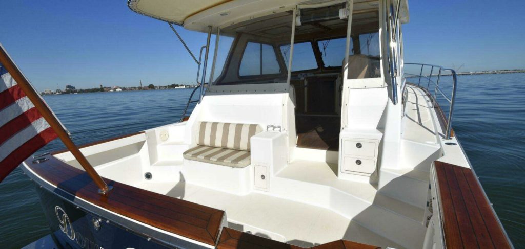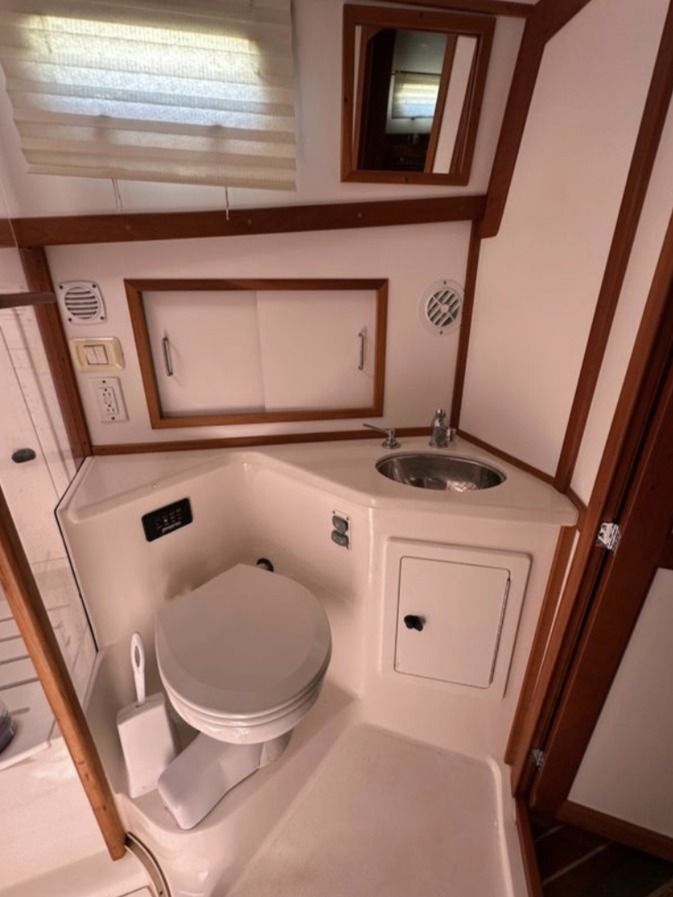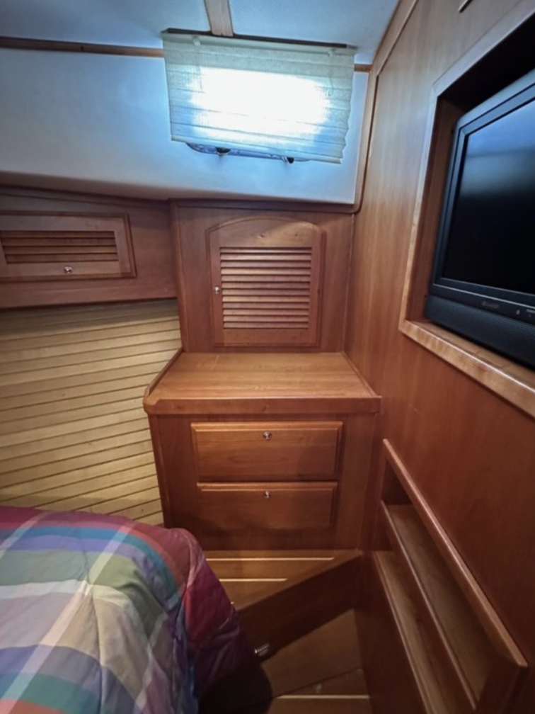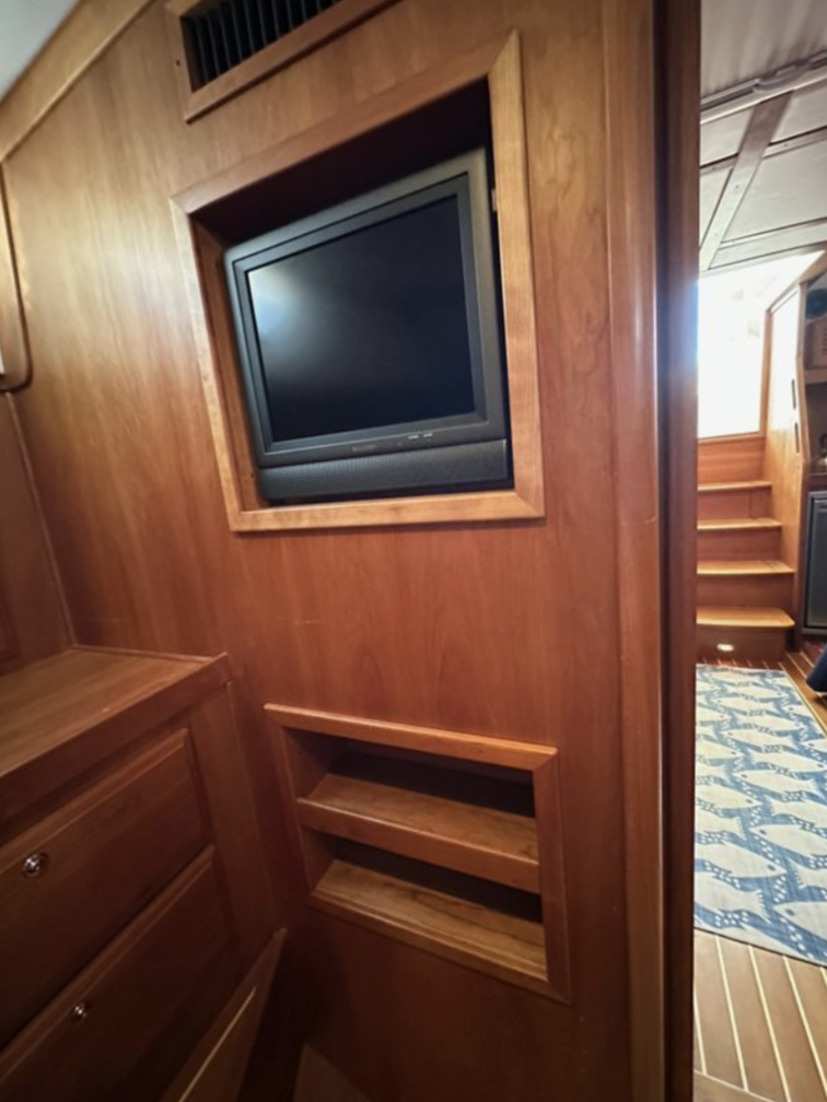 Bow and stern thrusters make her a breeze for docking. And she brings the simplicity of direct drive. (Not everyone wants pod drives.)She is designed and built in the Maine tradition for comfort, whether underway or at rest.