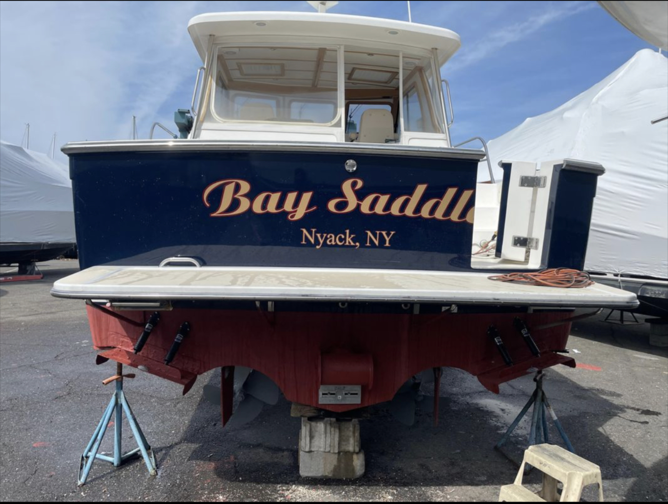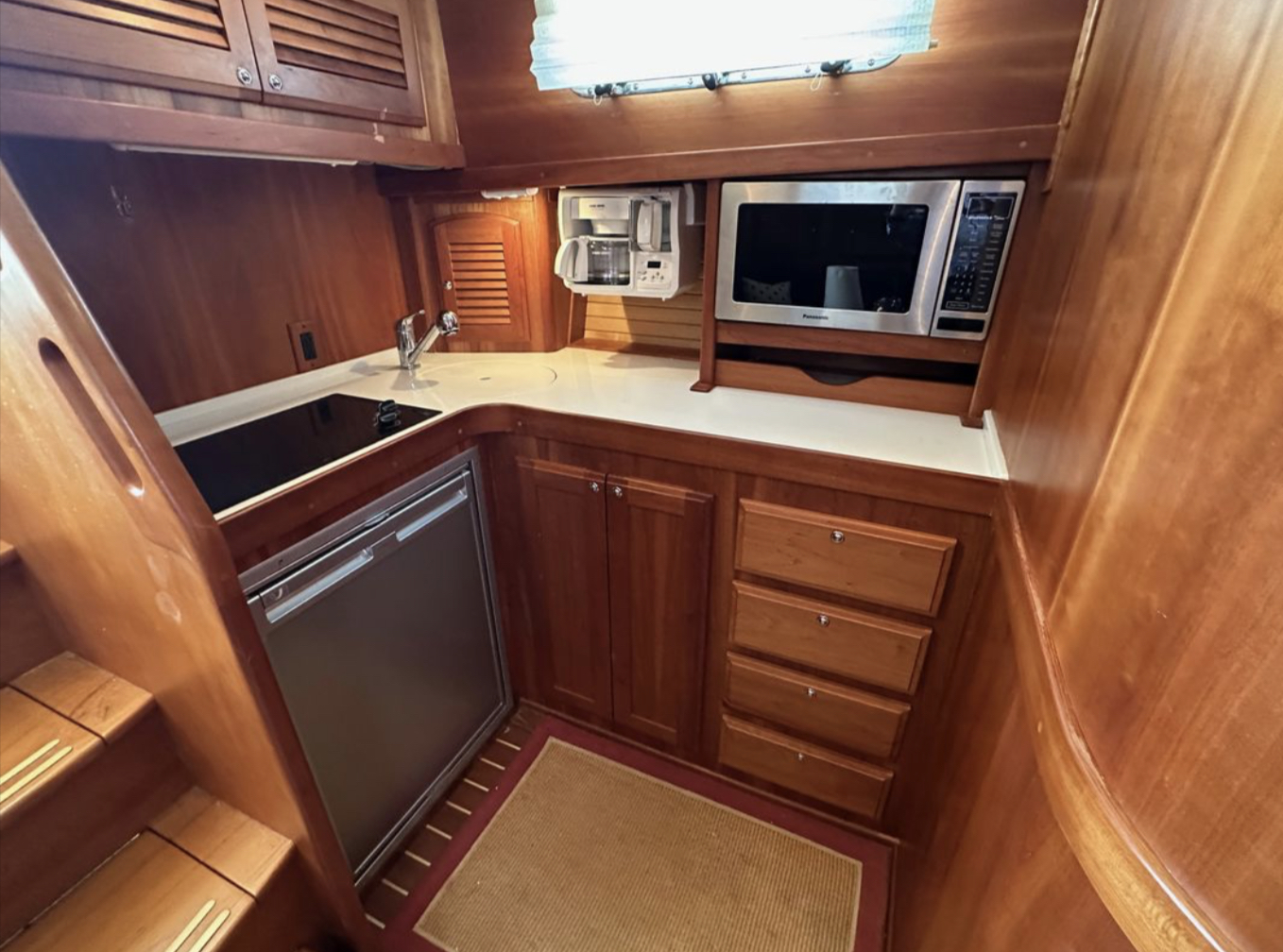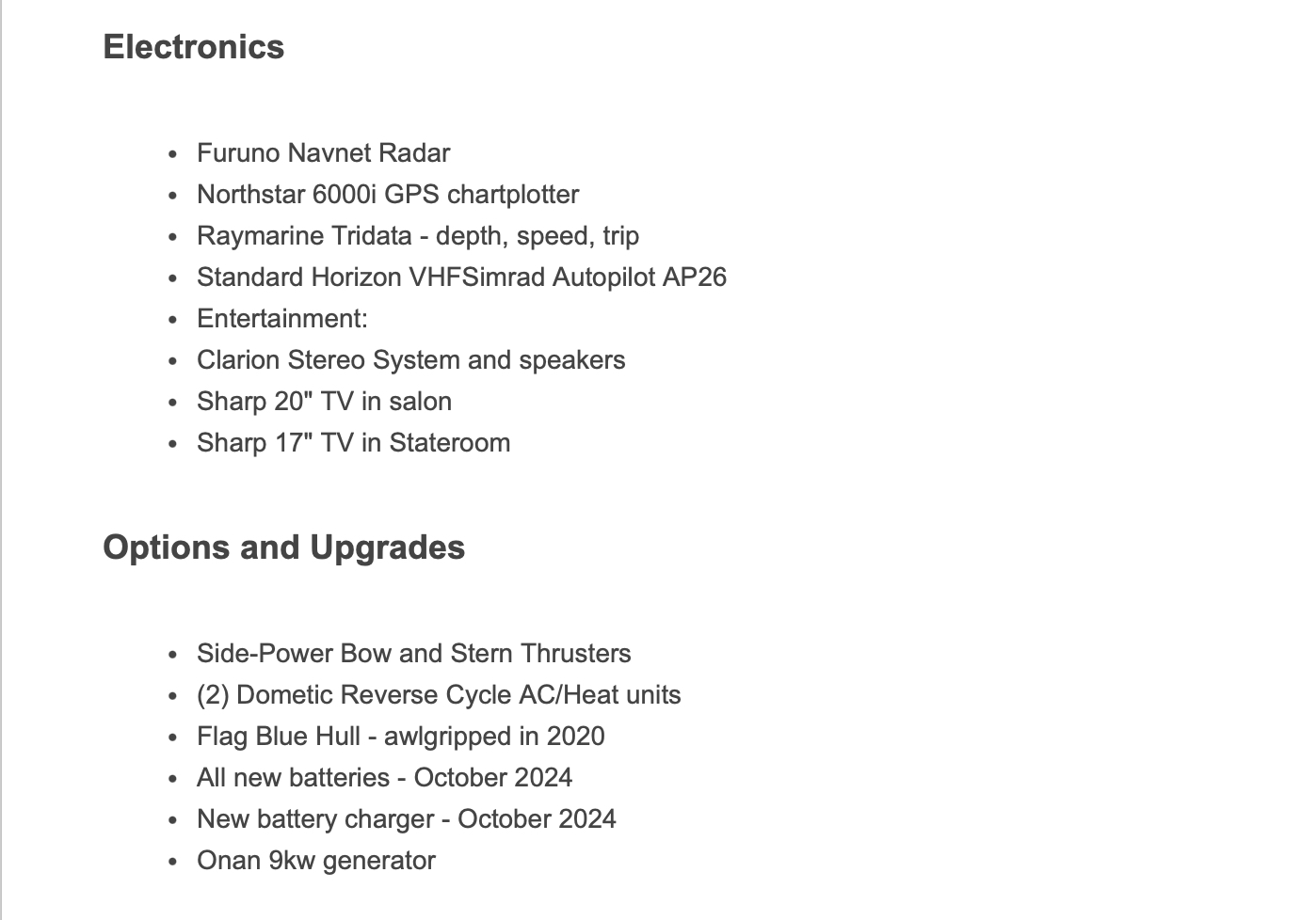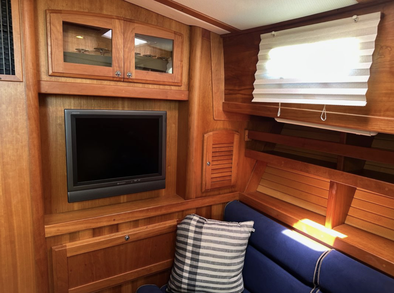 Bow and stern thrusters make her a breeze for docking. And she brings the simplicity of direct drive. (Not everyone wants pod drives.)She is designed and built in the Maine tradition for comfort, whether underway or at rest.