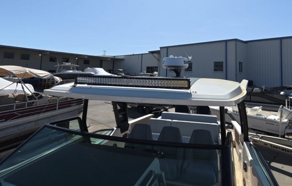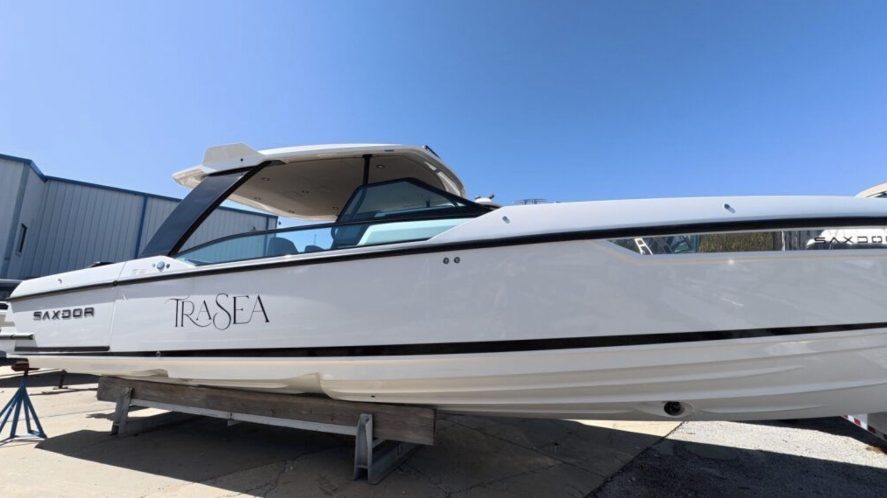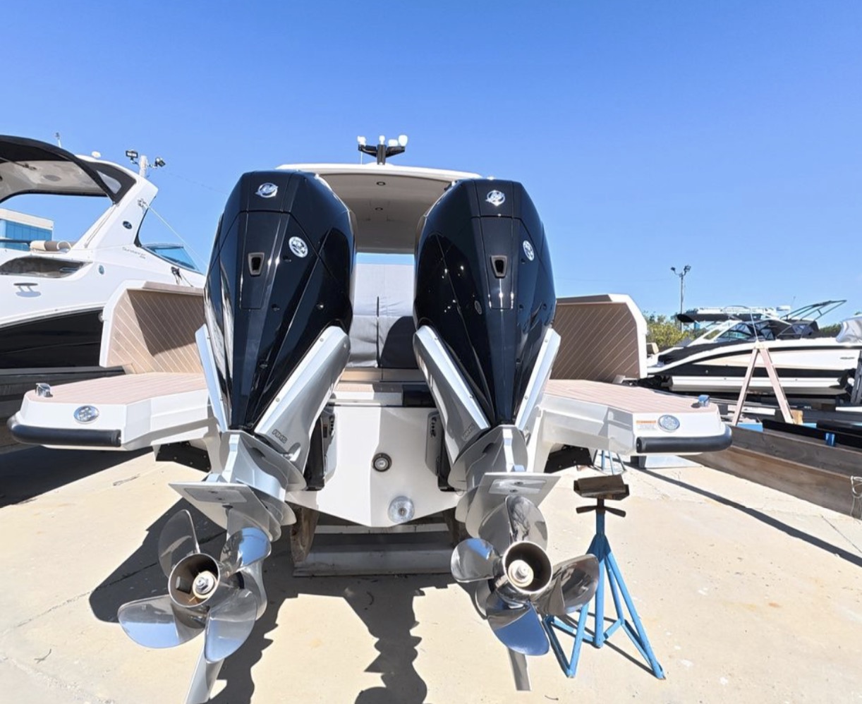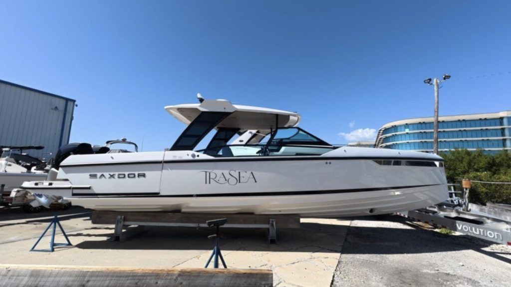 TRASEA is a like-new 2025 Saxdor SX320 GTO with only 20 hours on twin Mercury 300 V8 engines with Joystick Piloting, delivering exceptional performance and effortless docking.