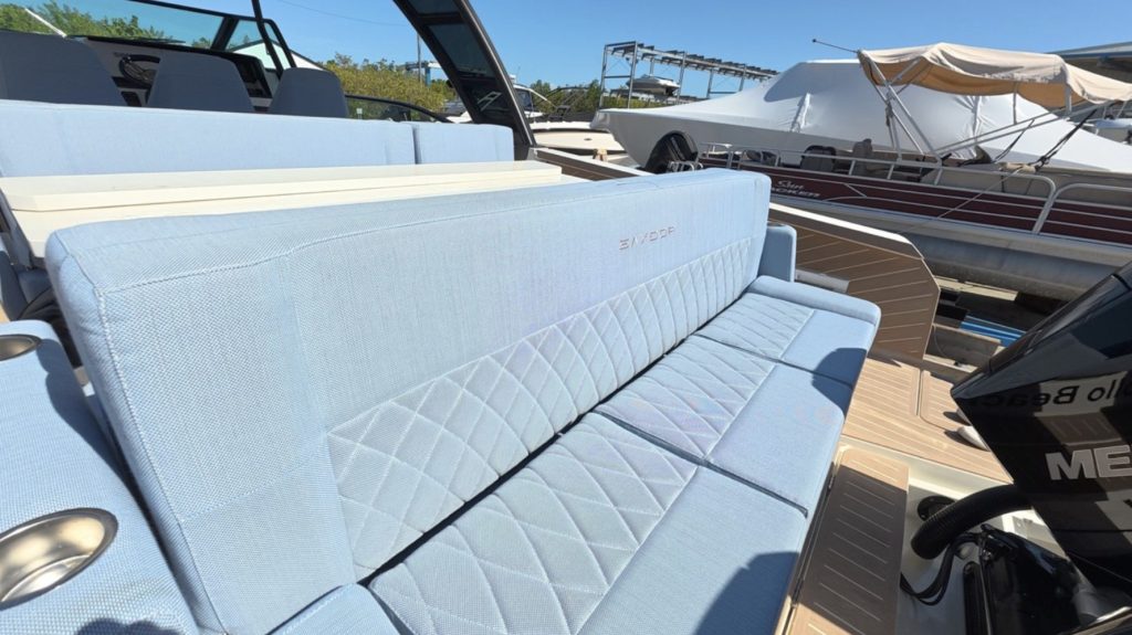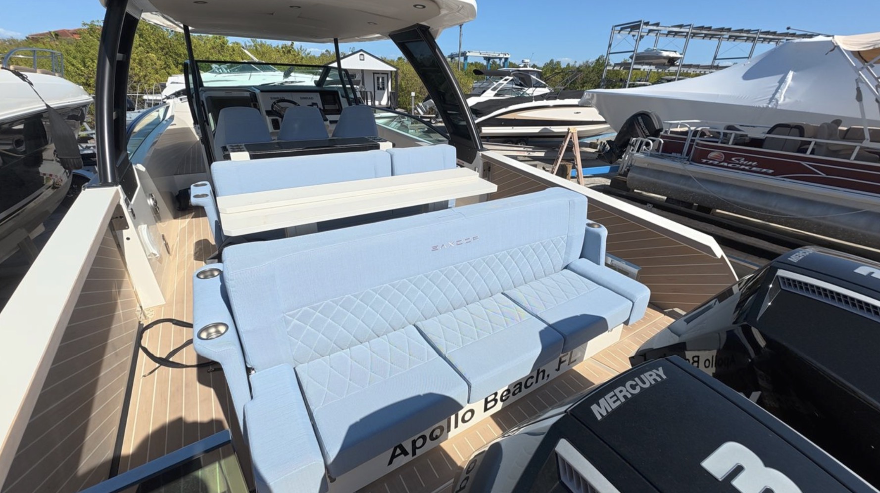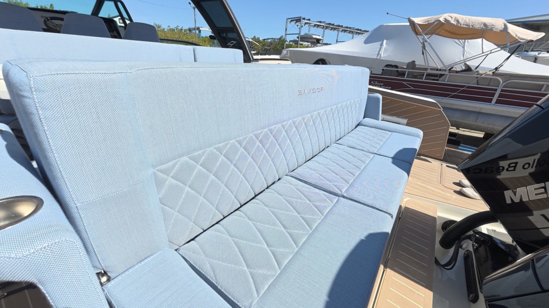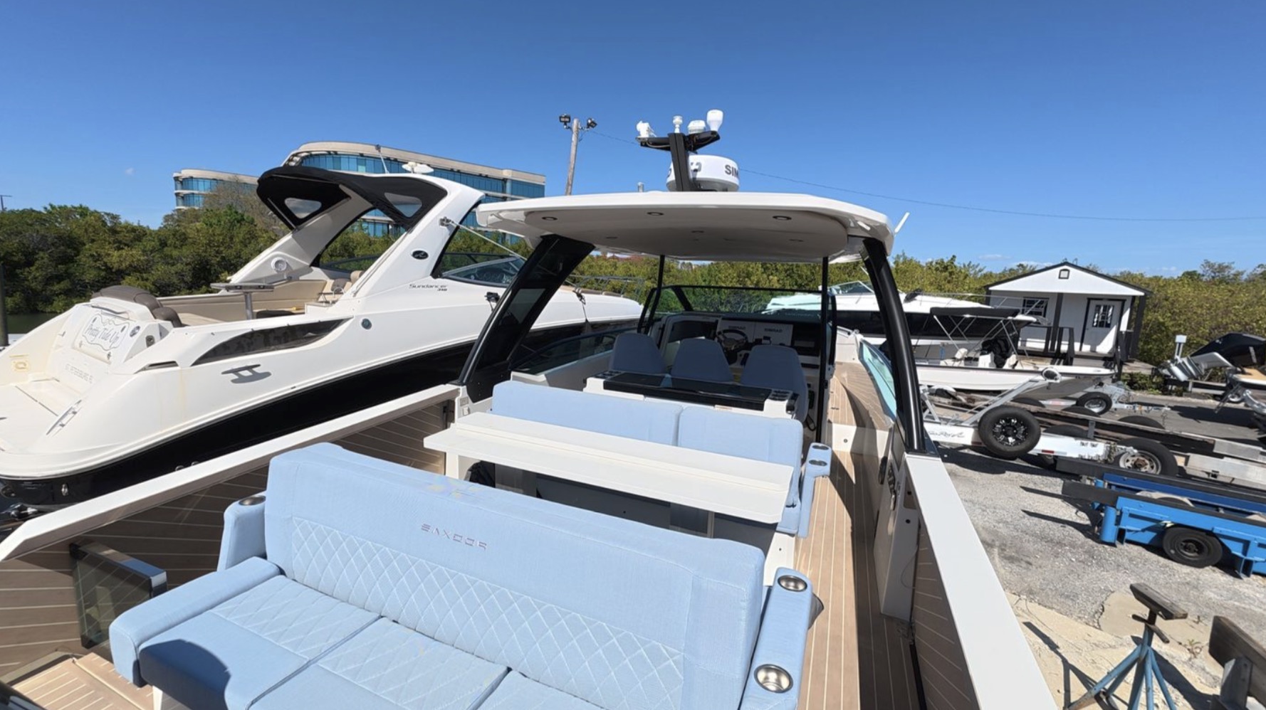 TRASEA is a like-new 2025 Saxdor SX320 GTO with only 20 hours on twin Mercury 300 V8 engines with Joystick Piloting, delivering exceptional performance and effortless docking.