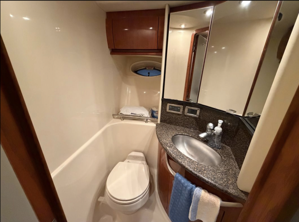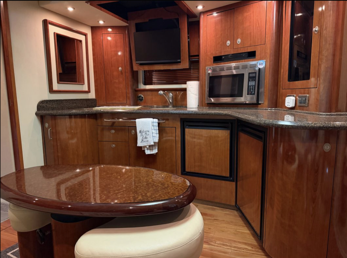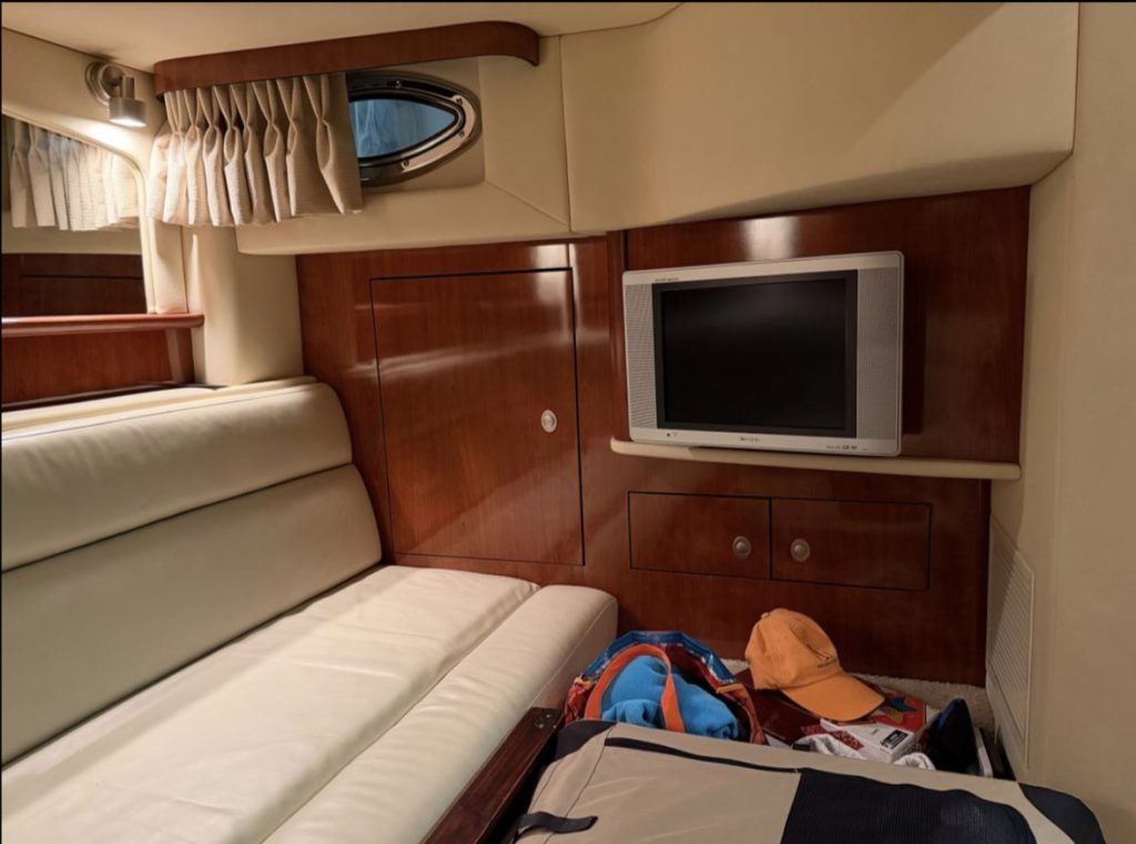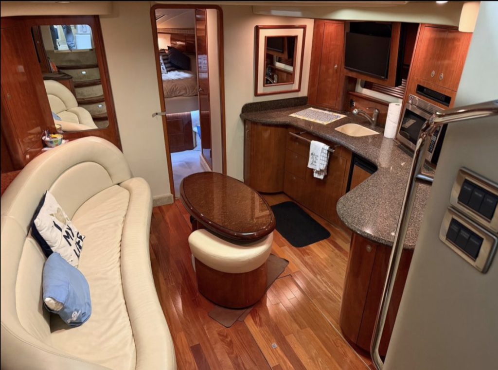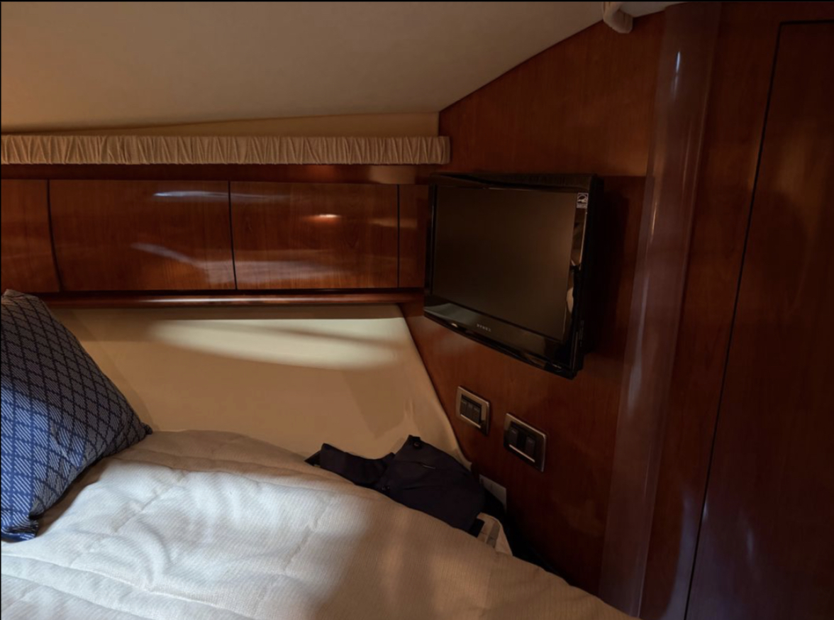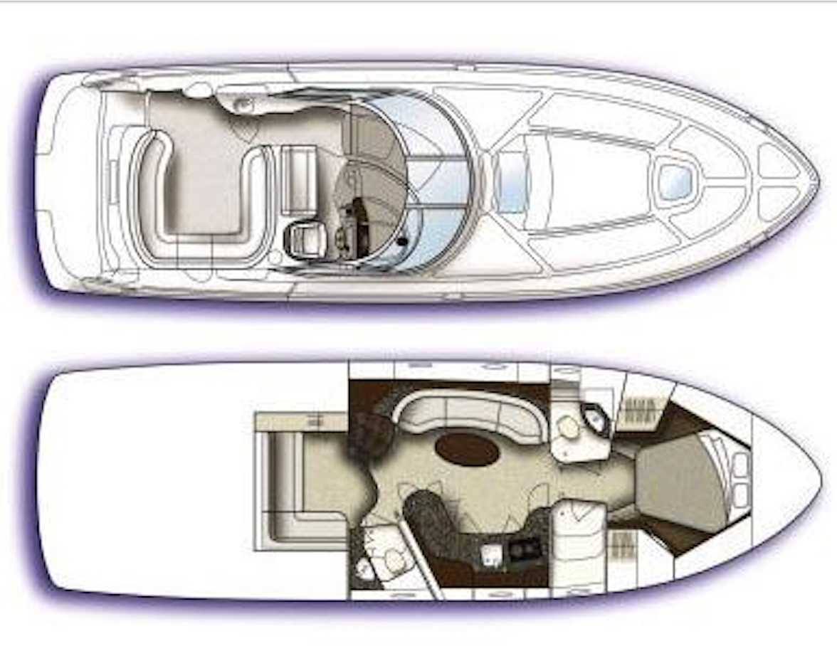 Queen berth forward with two closets and tv/dvd with it’s own AC/Heat cabin control, head to port forward and shower to starboard forward, salon to port, galley to starboard, midcabin aft with combo head, large cockpit with wraparound seating, helm chair and passenger seat, cockpit wet bar with refrig, large deck forward with sunpads.