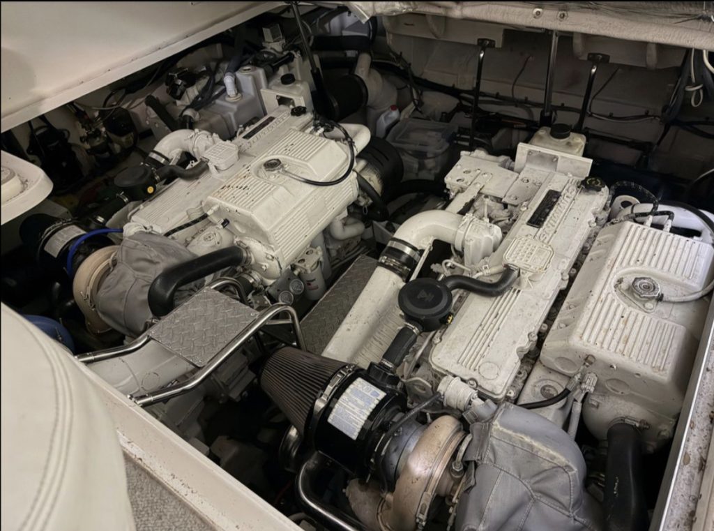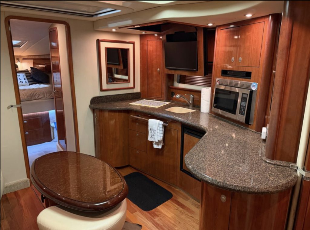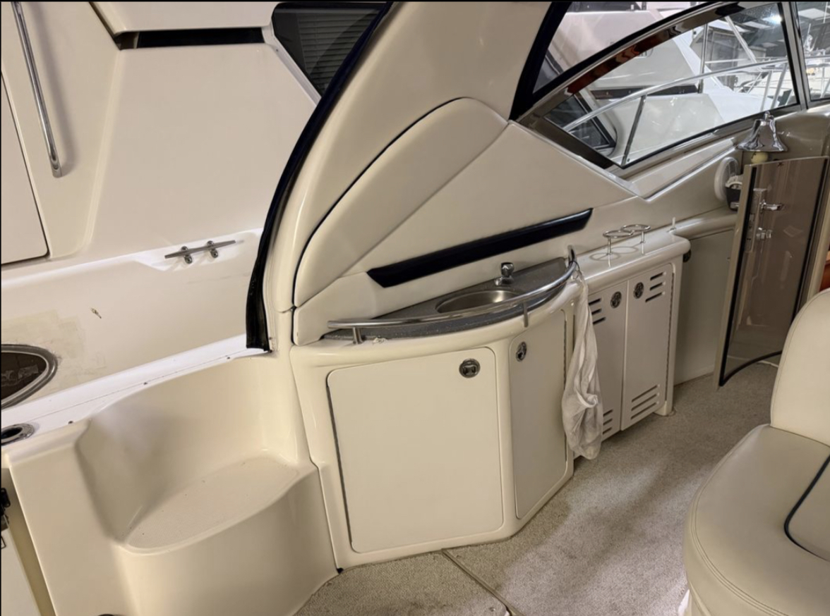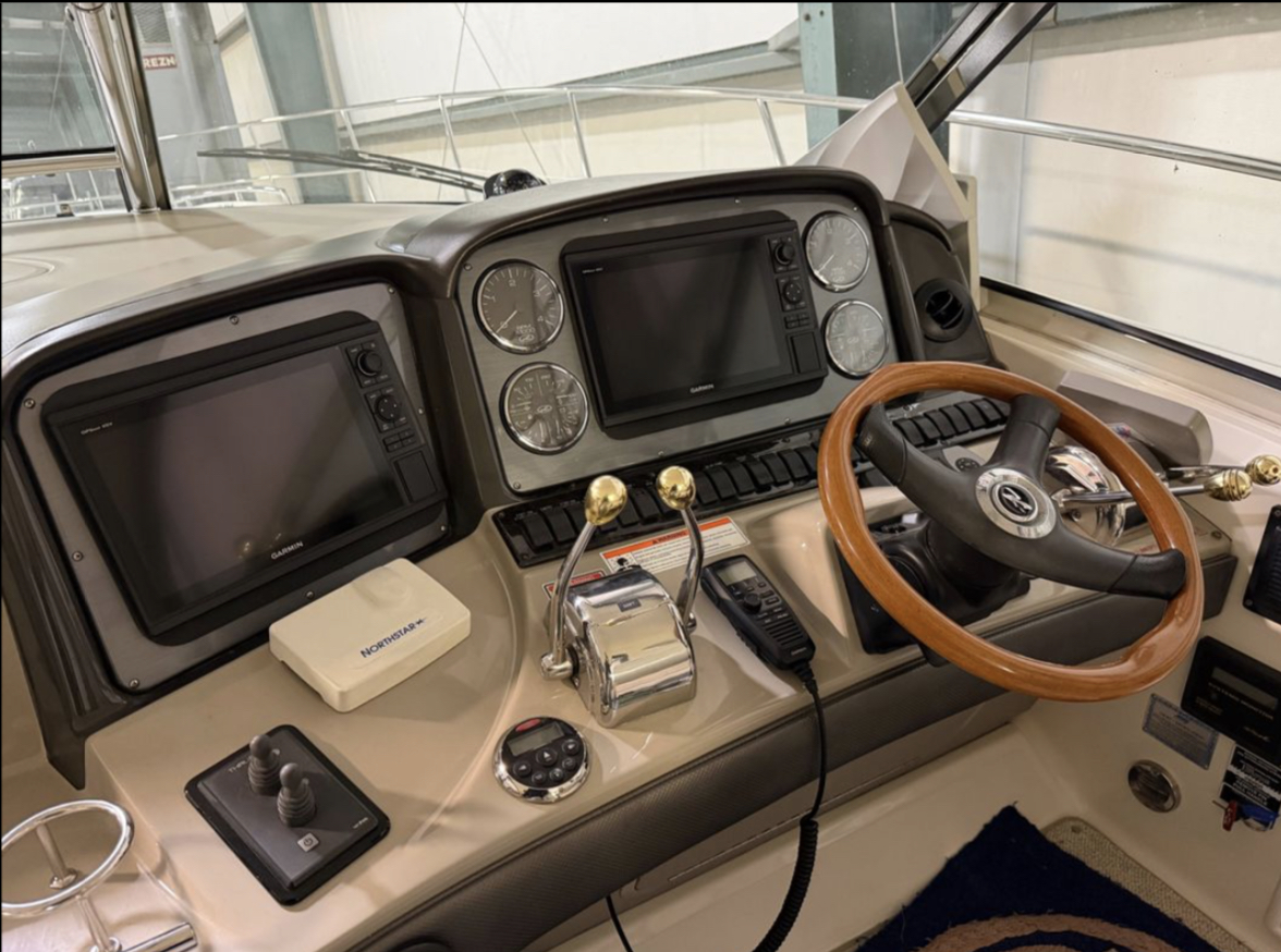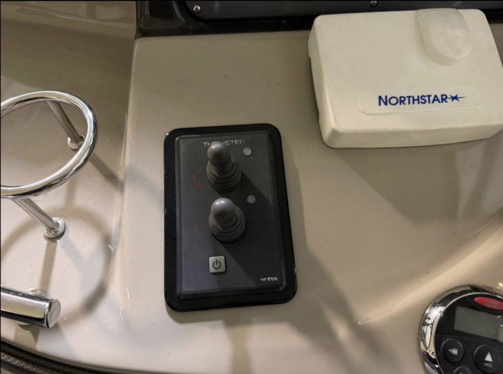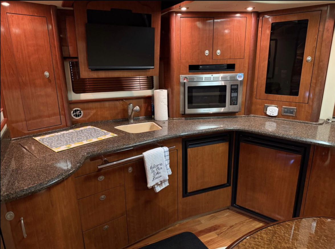 Queen berth forward with two closets and tv/dvd with it’s own AC/Heat cabin control, head to port forward and shower to starboard forward, salon to port, galley to starboard, midcabin aft with combo head, large cockpit with wraparound seating, helm chair and passenger seat, cockpit wet bar with refrig, large deck forward with sunpads.