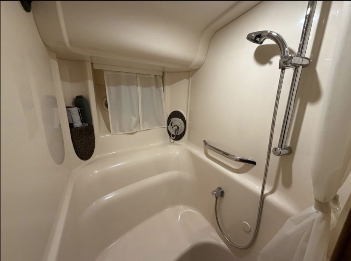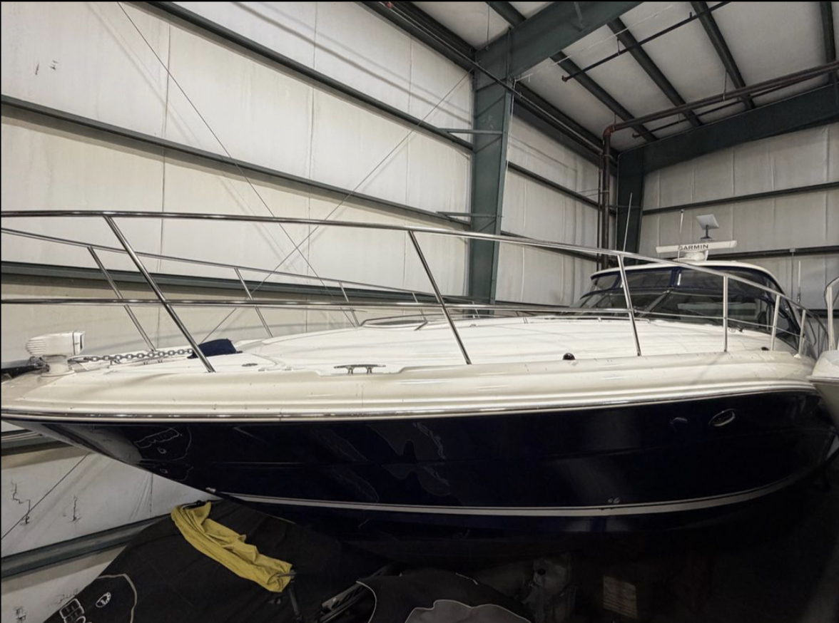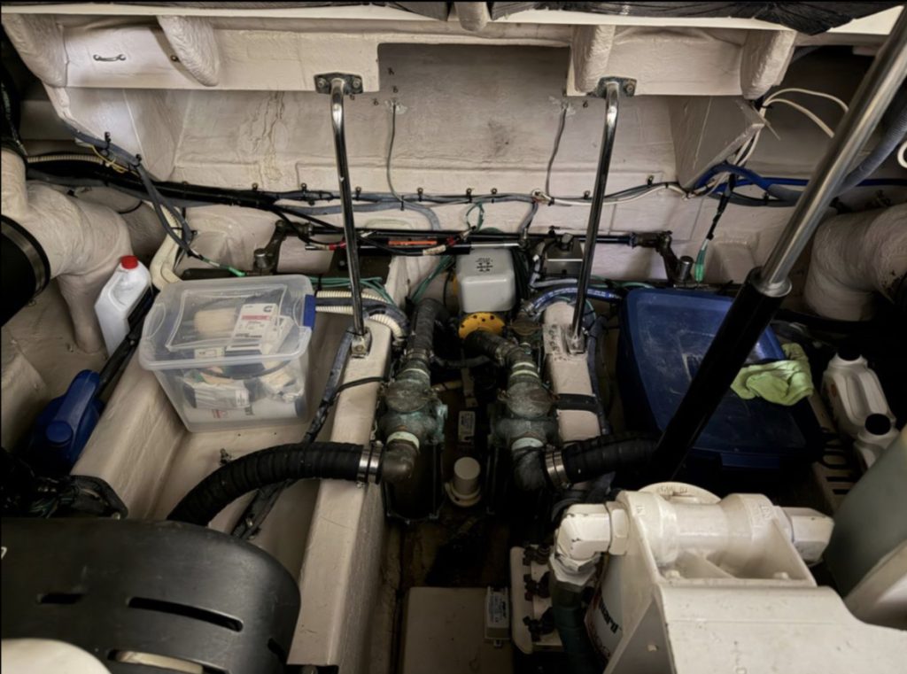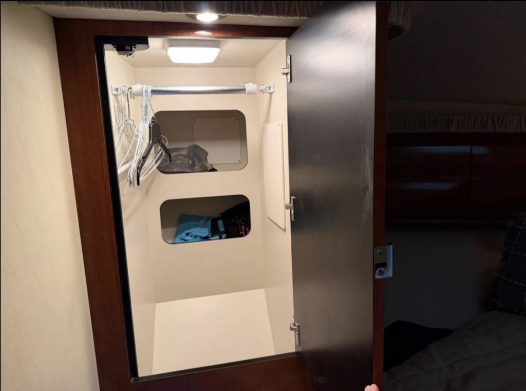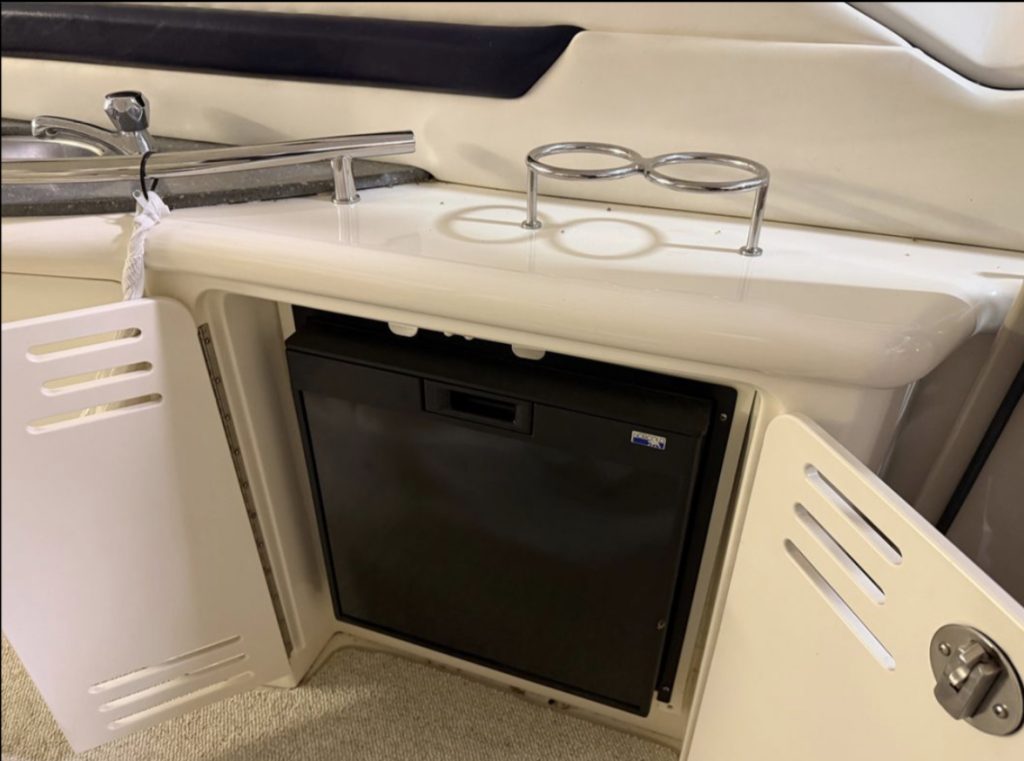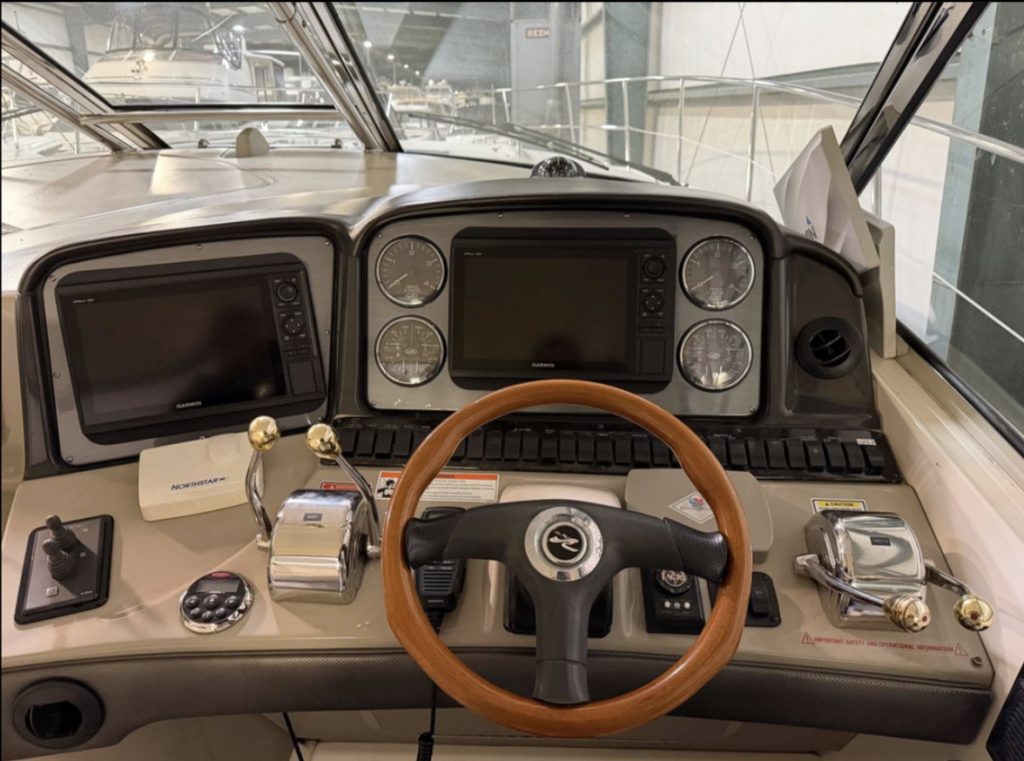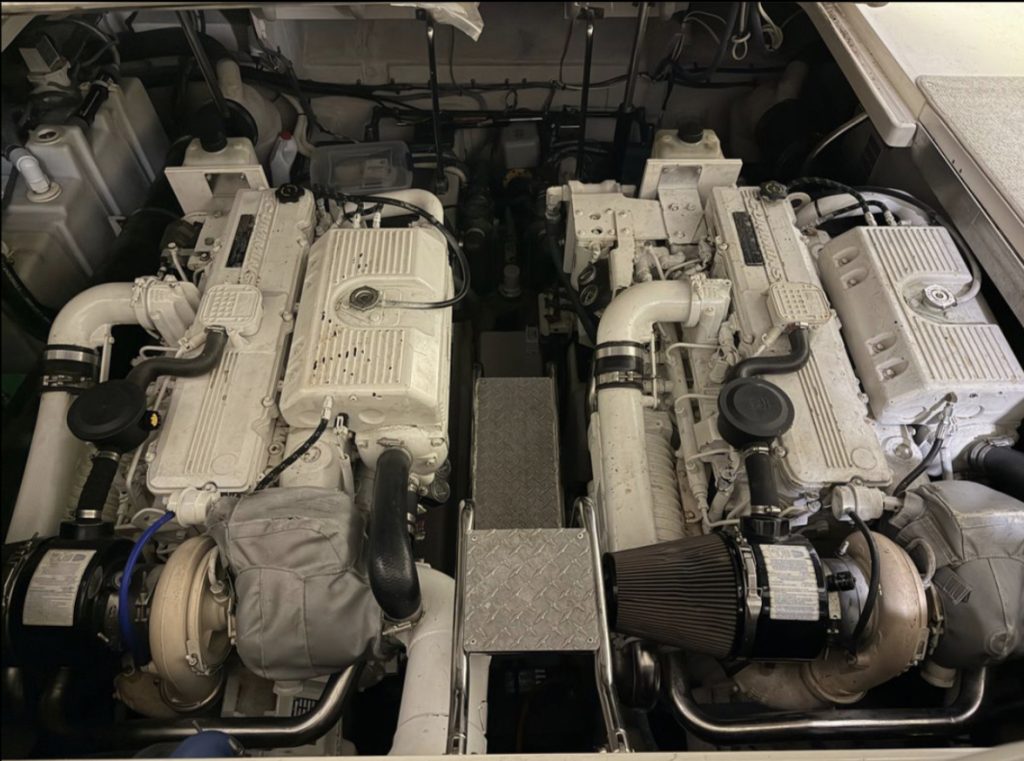 Queen berth forward with two closets and tv/dvd with it’s own AC/Heat cabin control, head to port forward and shower to starboard forward, salon to port, galley to starboard, midcabin aft with combo head, large cockpit with wraparound seating, helm chair and passenger seat, cockpit wet bar with refrig, large deck forward with sunpads.