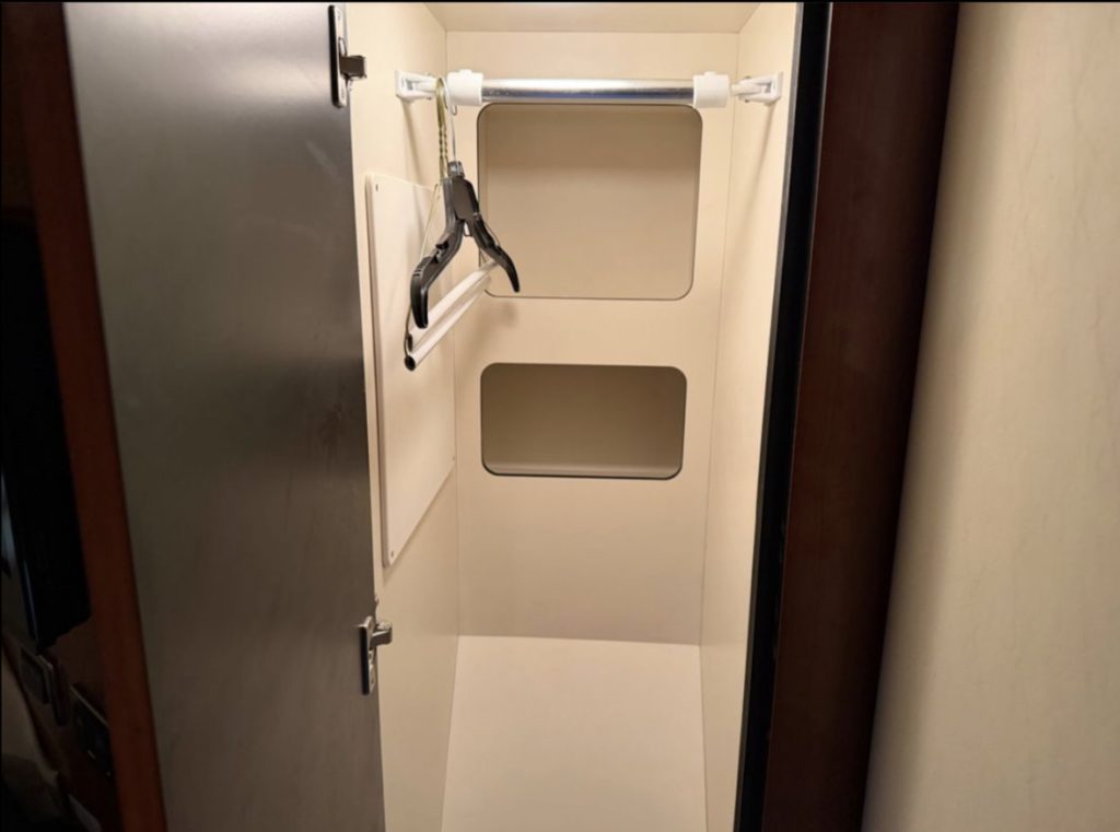 Cherrywood cabinetry, sink, fold down tv for salon watching, refrig and freezer, coffee maker, microwave, 2 burner stove top, storage with waste basket.