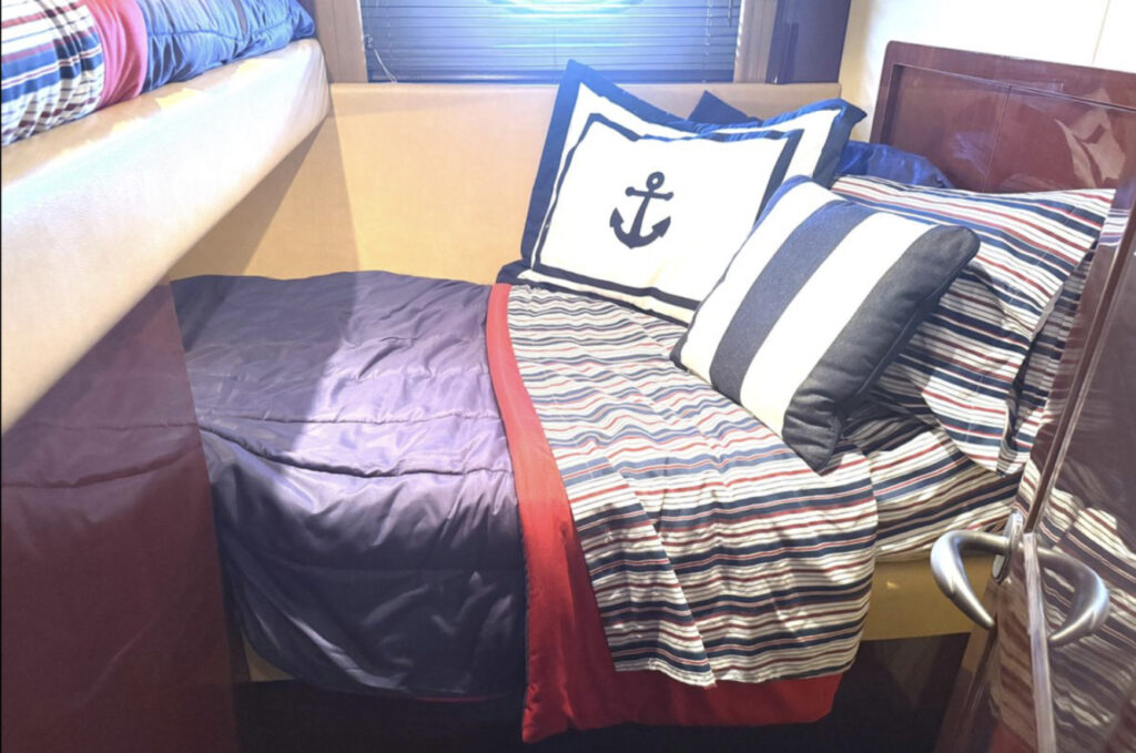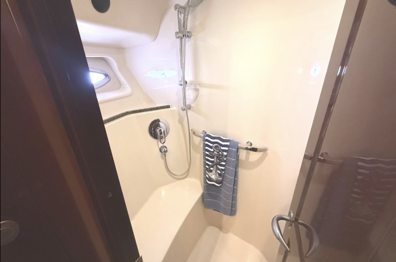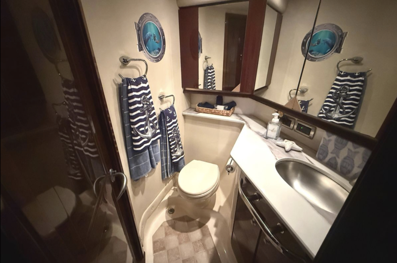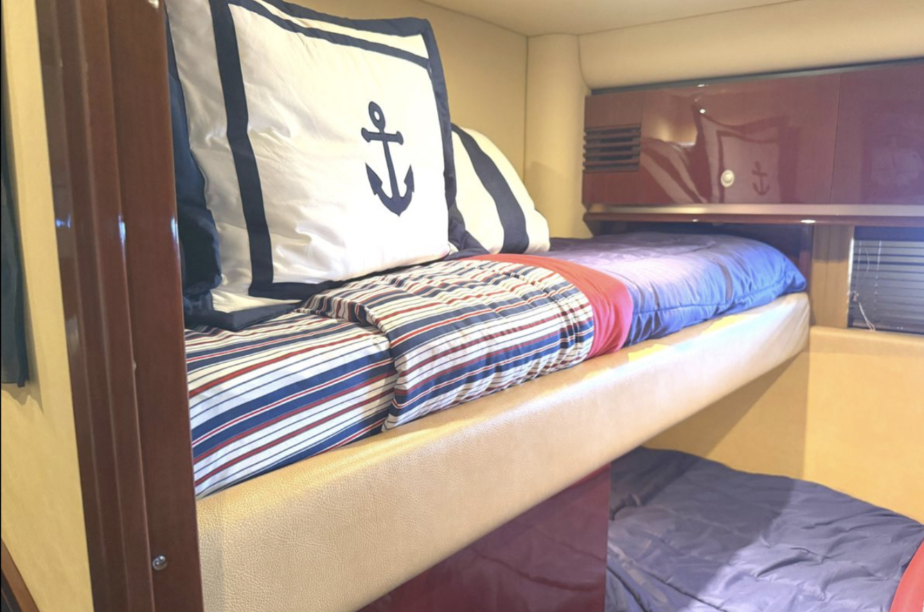 A spacious VIP stateroom forward contains a queen bed, and the second guest stateroom has angled bunk beds. Additional features of the 580 Sedan Bridge include flybridge air conditioning, standard bow thruster, built-in cockpit seating, extended swim platform with hydraulic lift, and a state of the art entertainment system.