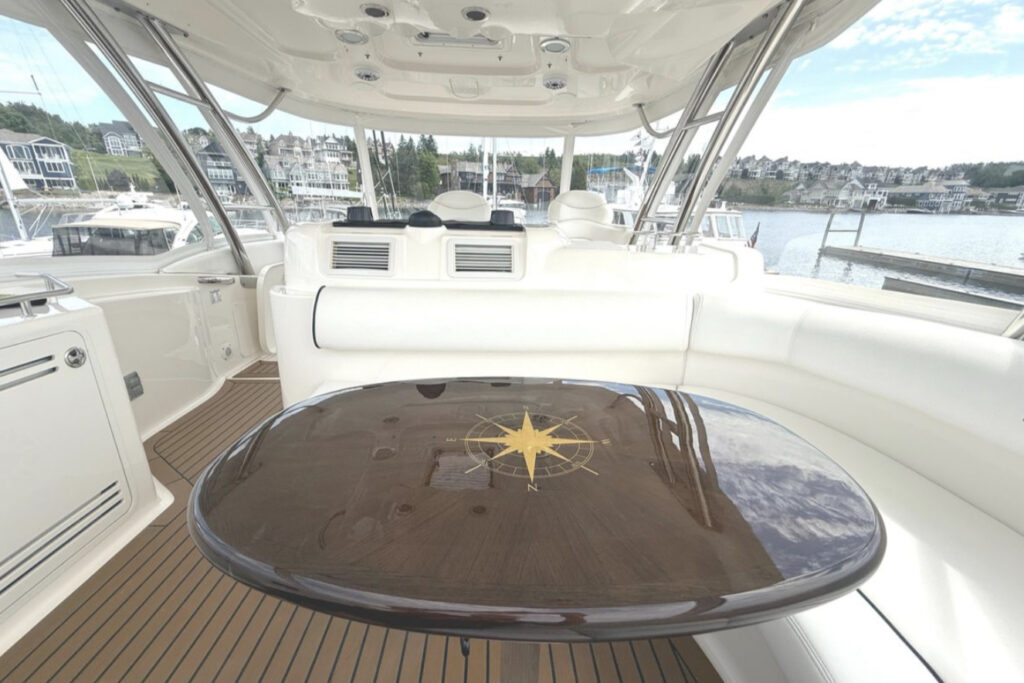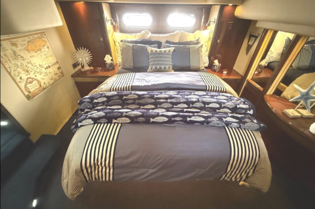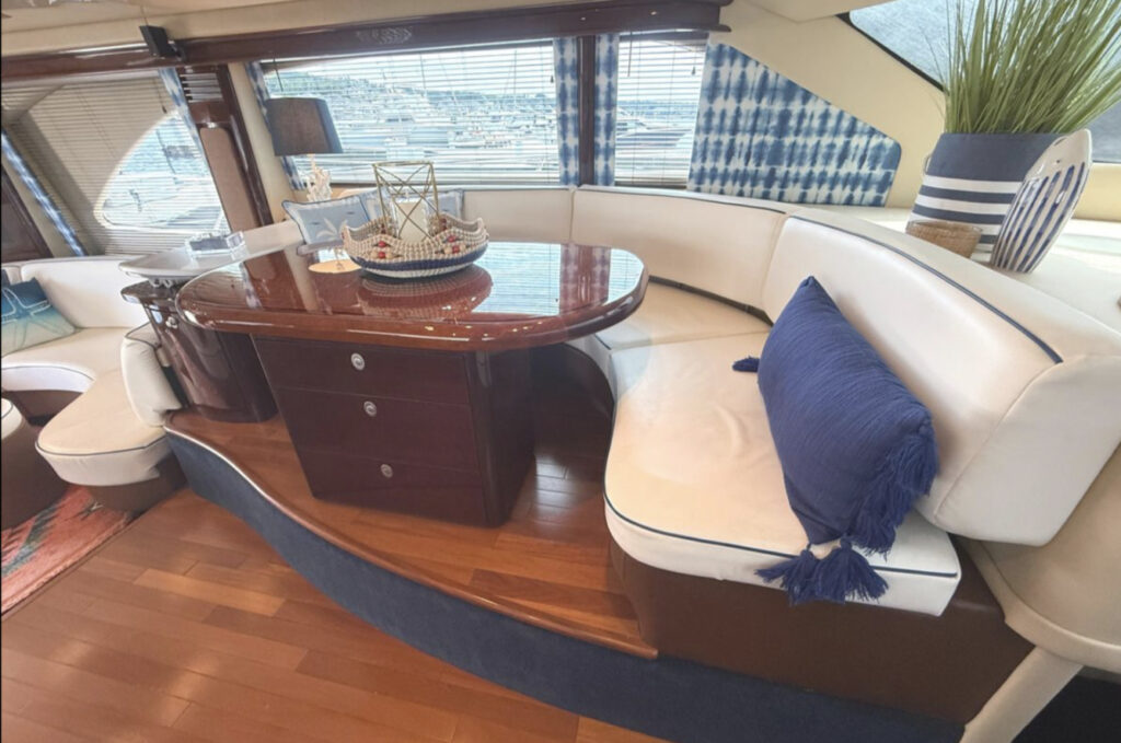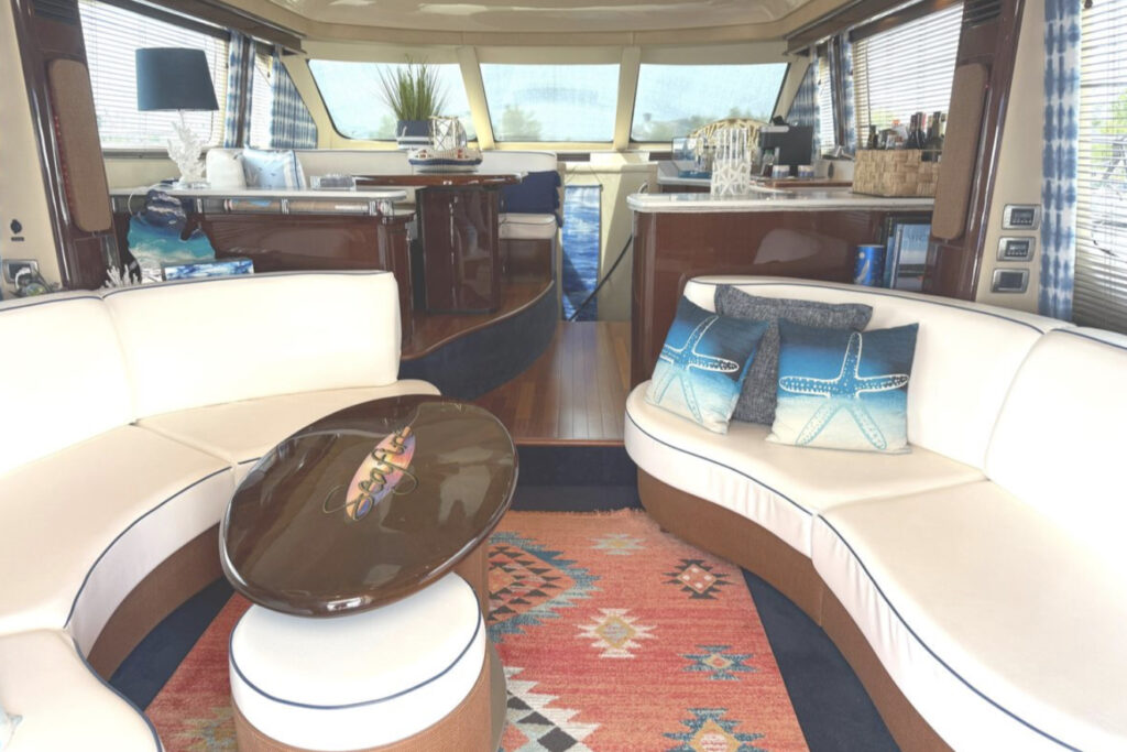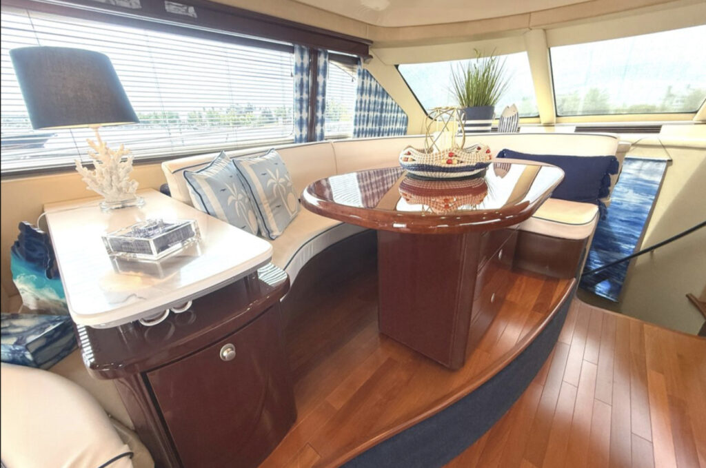 A gourmet galley (with Sub-Zero refrigeration) is forward of the salon, opposite a wraparound dinette with storage below. On the lower level, the 580’s opulent full-beam master stateroom features twin end tables and tons of storage.