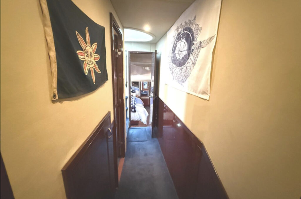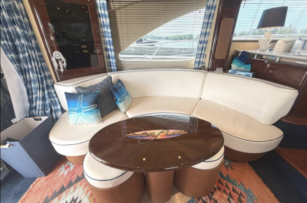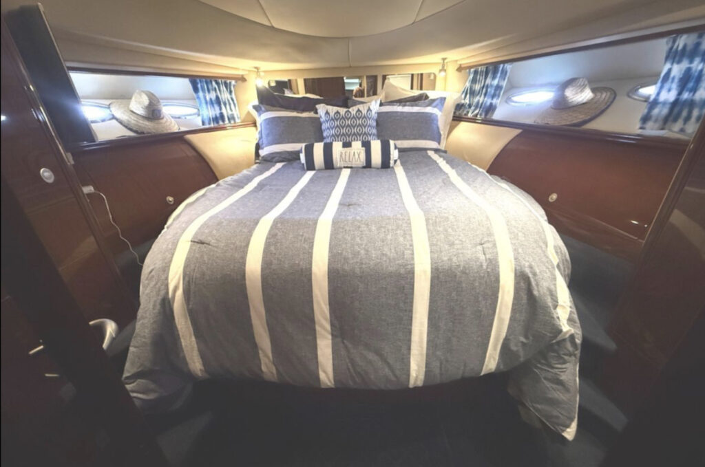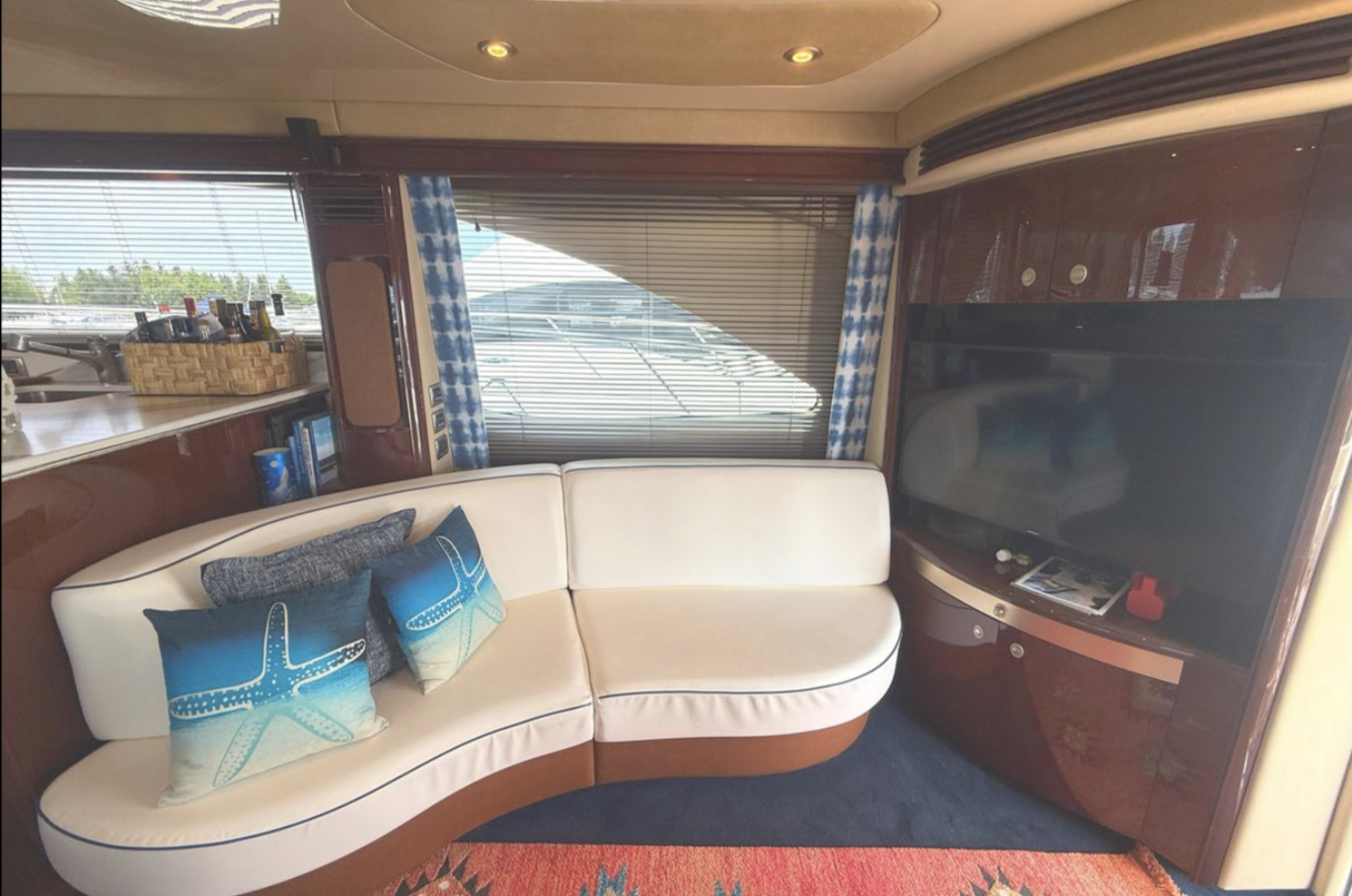 A gourmet galley (with Sub-Zero refrigeration) is forward of the salon, opposite a wraparound dinette with storage below. On the lower level, the 580’s opulent full-beam master stateroom features twin end tables and tons of storage.