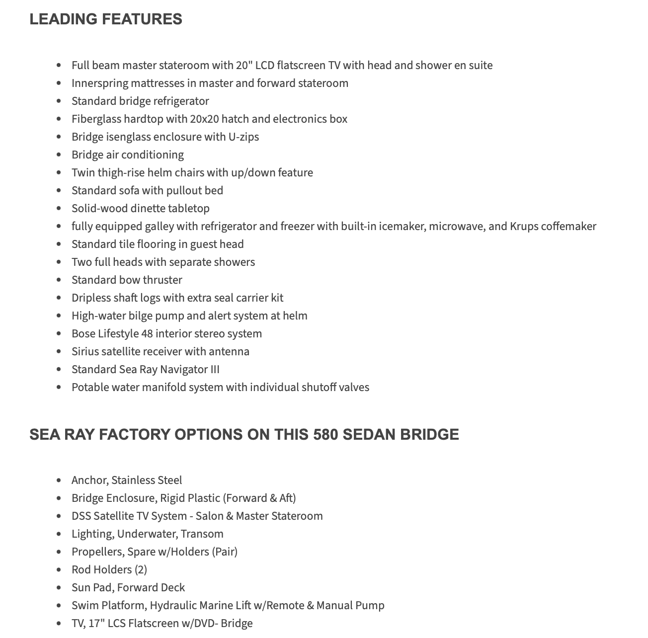 PowerBoat Guide says: With her bold styling, solid performance, and spacious three stateroom accommodations, the Sea Ray 580 Sedan Bridge (called the 550 Sedan Bridge in 2005) went a long way toward defining luxury in the American sportboat market during her production years.