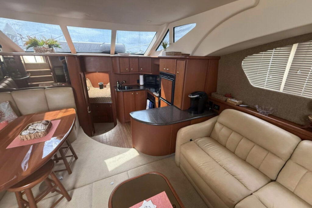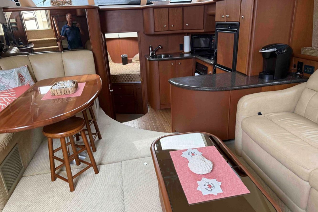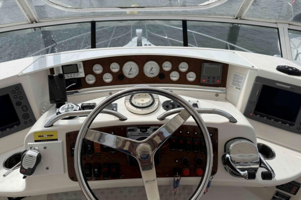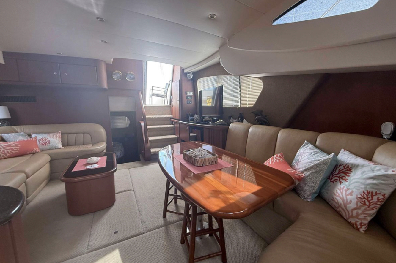Top-grade interior hardware has been installed, and Flexsteel sofas and settees are included with UltraLeather surfaces. Up above, the SideWalk system reduces the number of steps, but certainly not the safe and easy access. Top-grade marine vinyl with Starboard backing and PreFixx coatings resist mildew and UV damage.