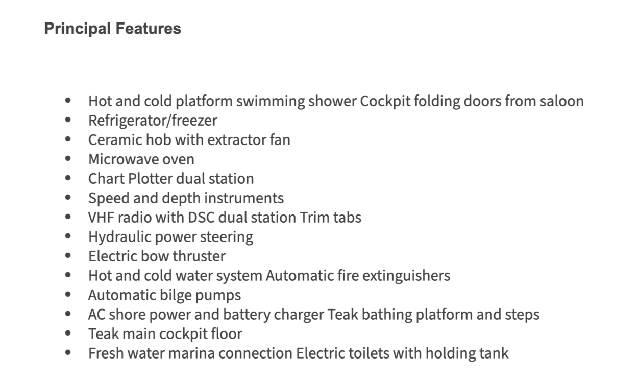 Le bateau qui est présenté sur cette page, l’est uniquement à titre d'information et n'est pas nécessairement toujours disponible à la vente et/ou à la location. Ce bateau est peut-être offert sous réserve, il faut vérifier sa disponibilité. Ce document ou cette annonce n'est pas contractuel. Les informations sur les bateaux affichées dans les résultats ci-dessus sont présentées en toute bonne foi et, bien qu'elles soient considérées comme correctes, elles ne sont pas garanties. Ita Yachts Canada et/ou ProprioBateau ne garantit pas et n'assume aucune responsabilité légale ou responsabilité pour l'exactitude, l'exhaustivité ou l'utilité des informations et/ou des images affichées, car elles peuvent ne pas être à jour ou encore êtres des images d'un bateau comparable. Toutes les informations sur les bateaux peuvent être modifiées sans préavis et sont sans garantie. Ce bateau est peut-être offert par un autre courtier ouvert au co-courtage (co-brokerage).