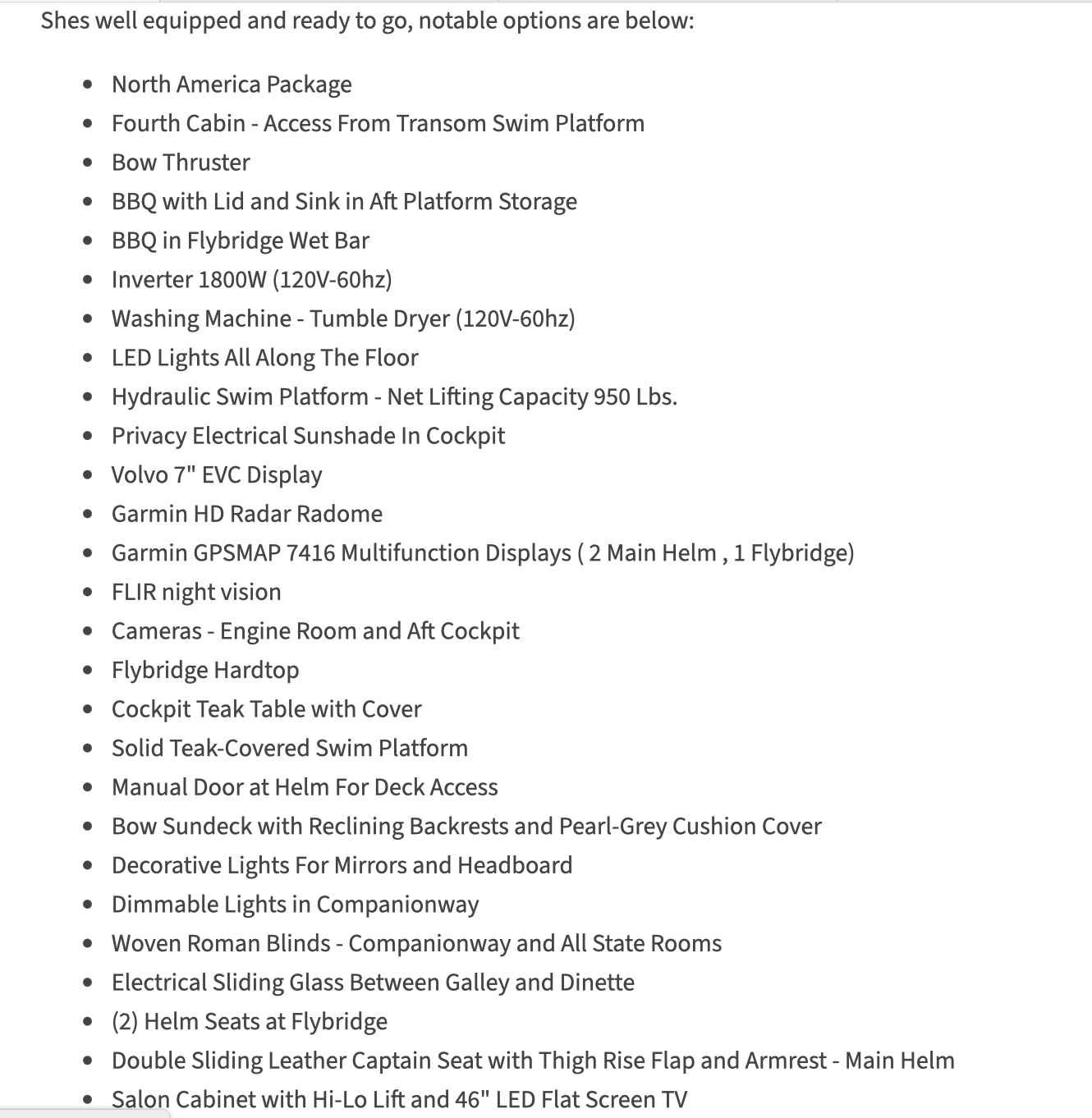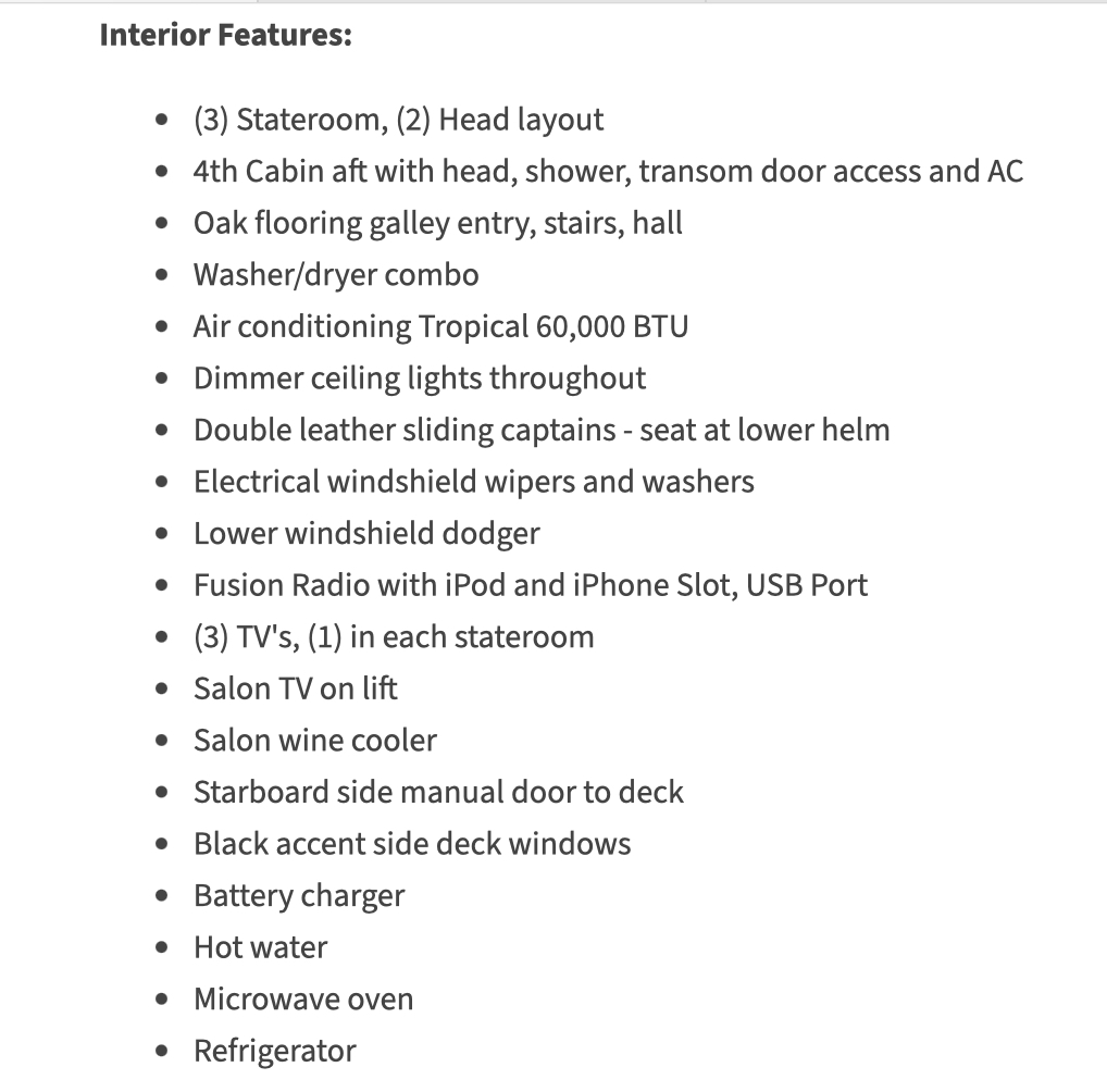 Featuring 4 staterooms, (Including the crew cabin), 3 heads, huge open salon and galley, fabulous aft deck and flybridge, make this the perfect cruising yacht for your family and friends!