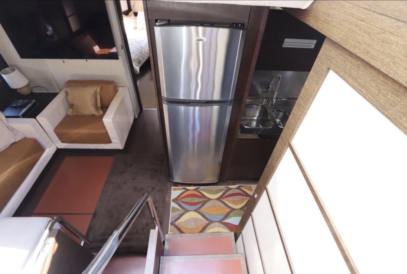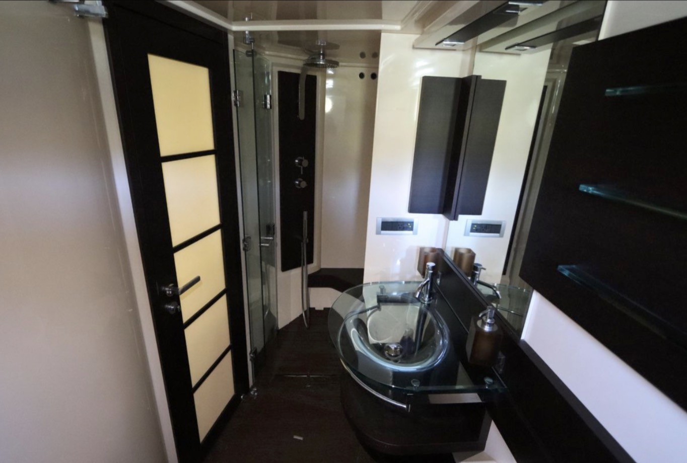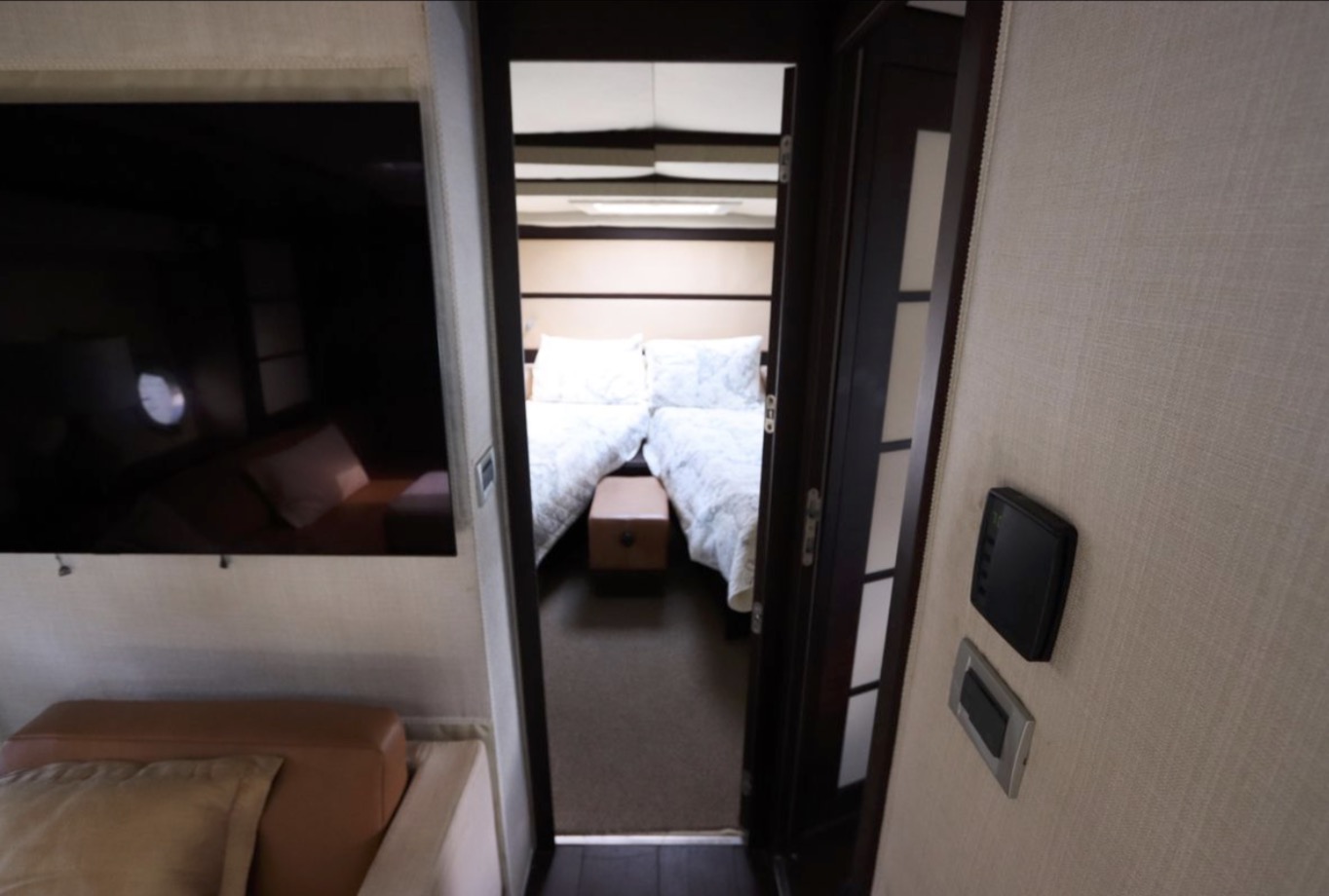 tiered side windows, the main deck layout includes a big salon with a power sunroof above. Offered with two or three staterooms, the two-stateroom floorplan replaces the second guest cabin with a versatile lower salon/lounge with self-contained galley. Both layouts feature a truly opulent amidships owner’s suite with