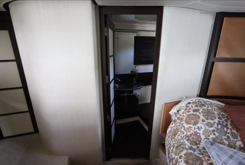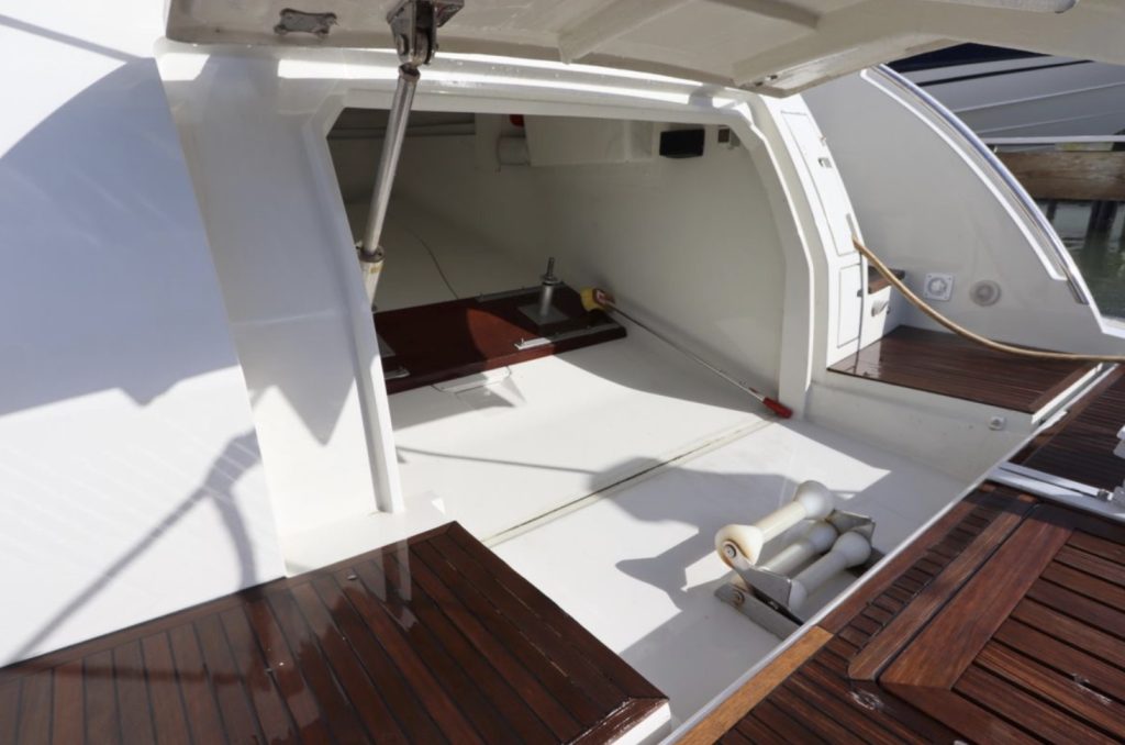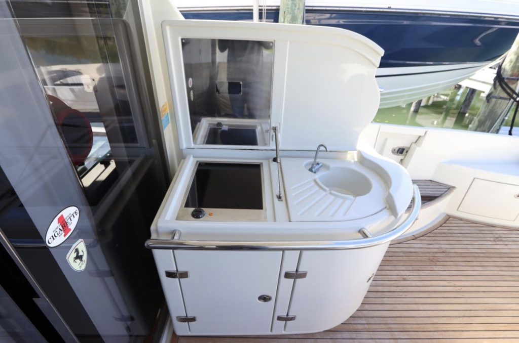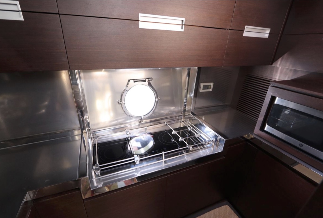 six hull windows on either side. Note that the island berth in the forward VIP cabin splits apart into V-berths—an innovative touch indeed. There’s also a small crew cabin aft, next to the transom garage. Sliding glass doors open from the salon to the aft deck with its centerline sun pad, wet bar and grill. The garage can stow
