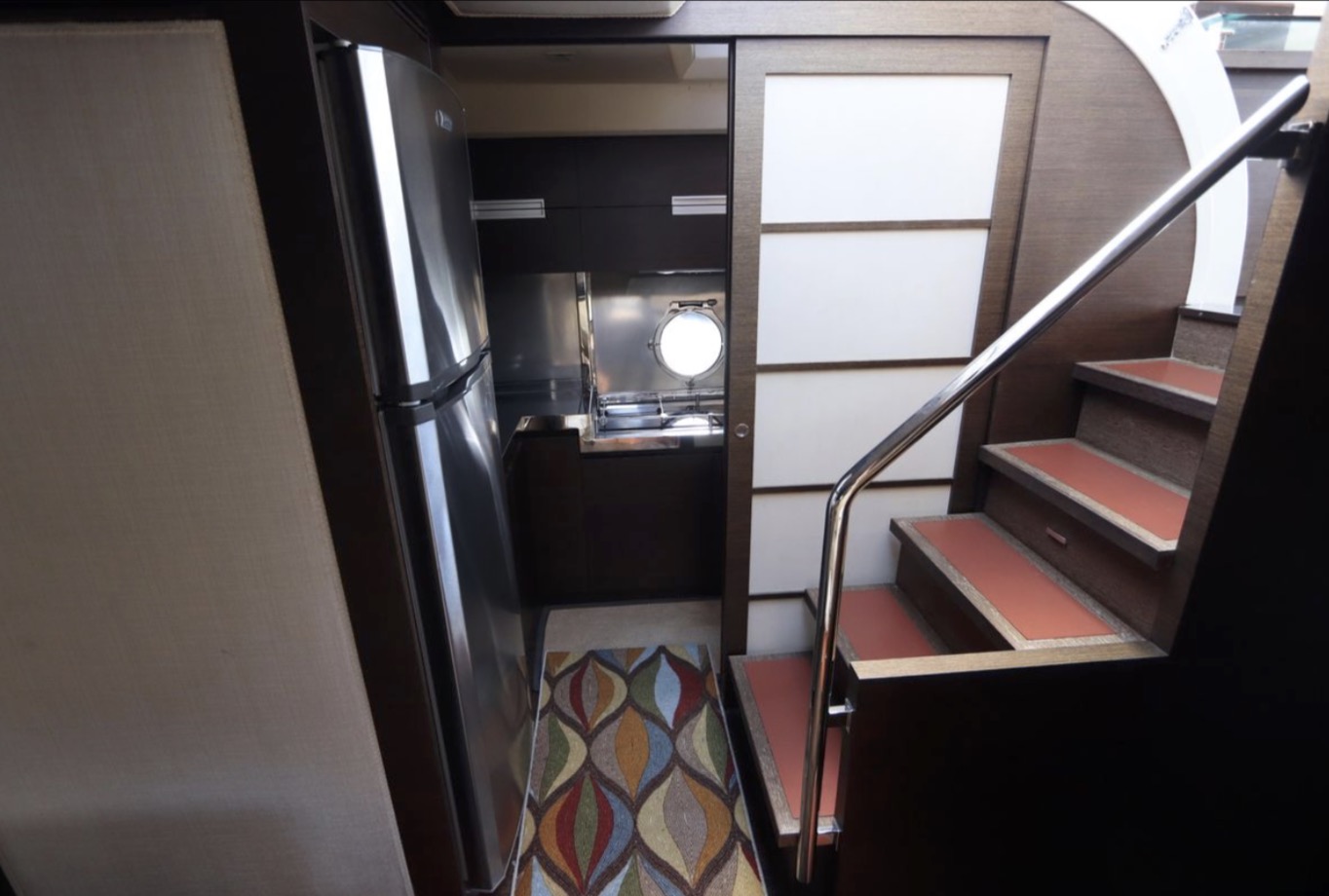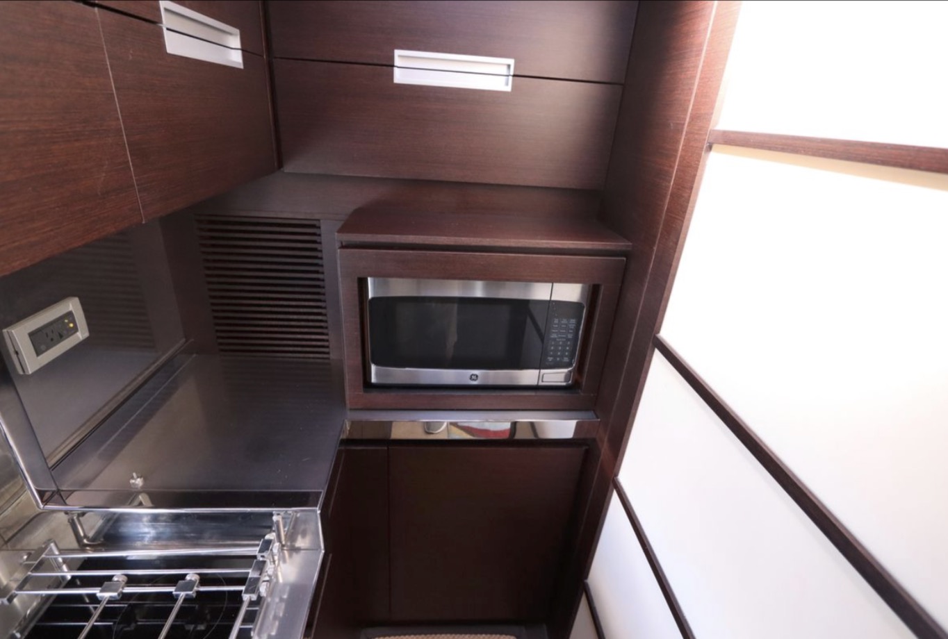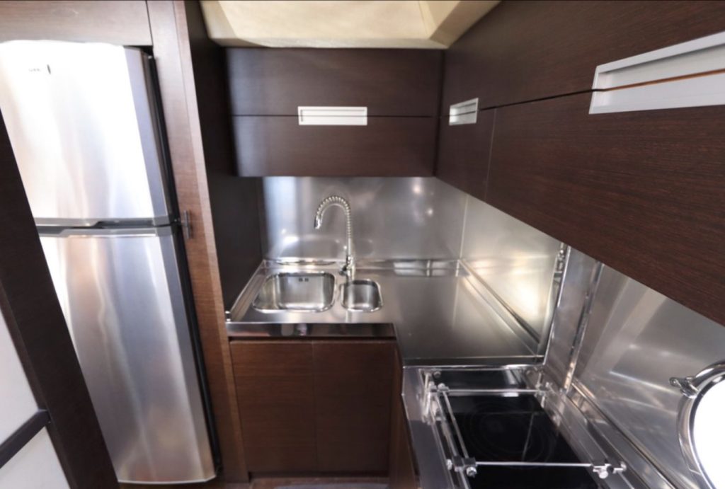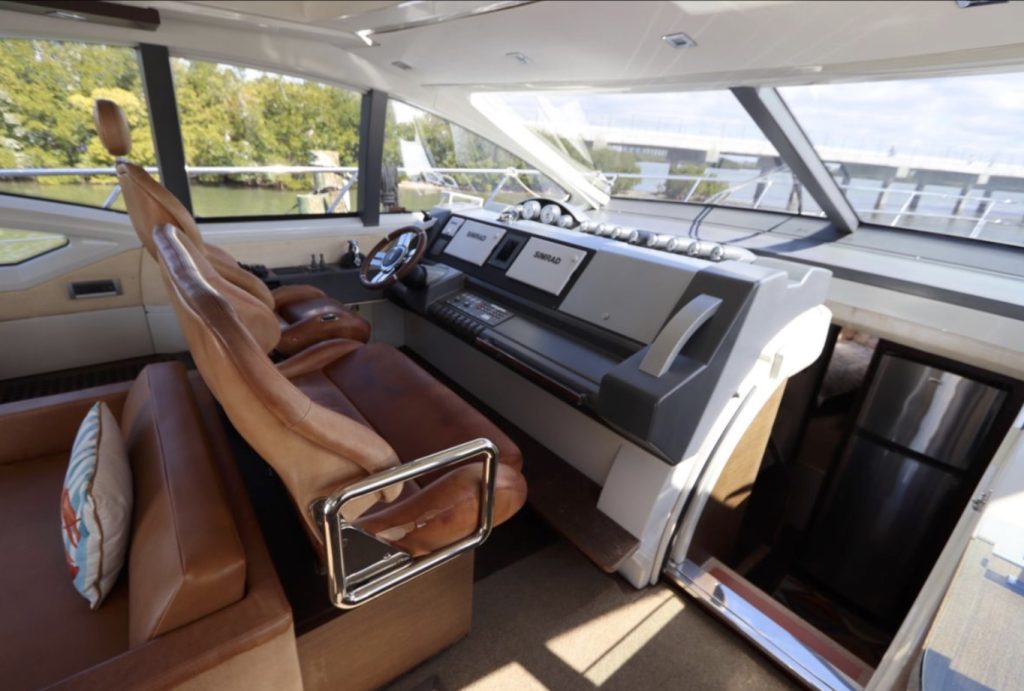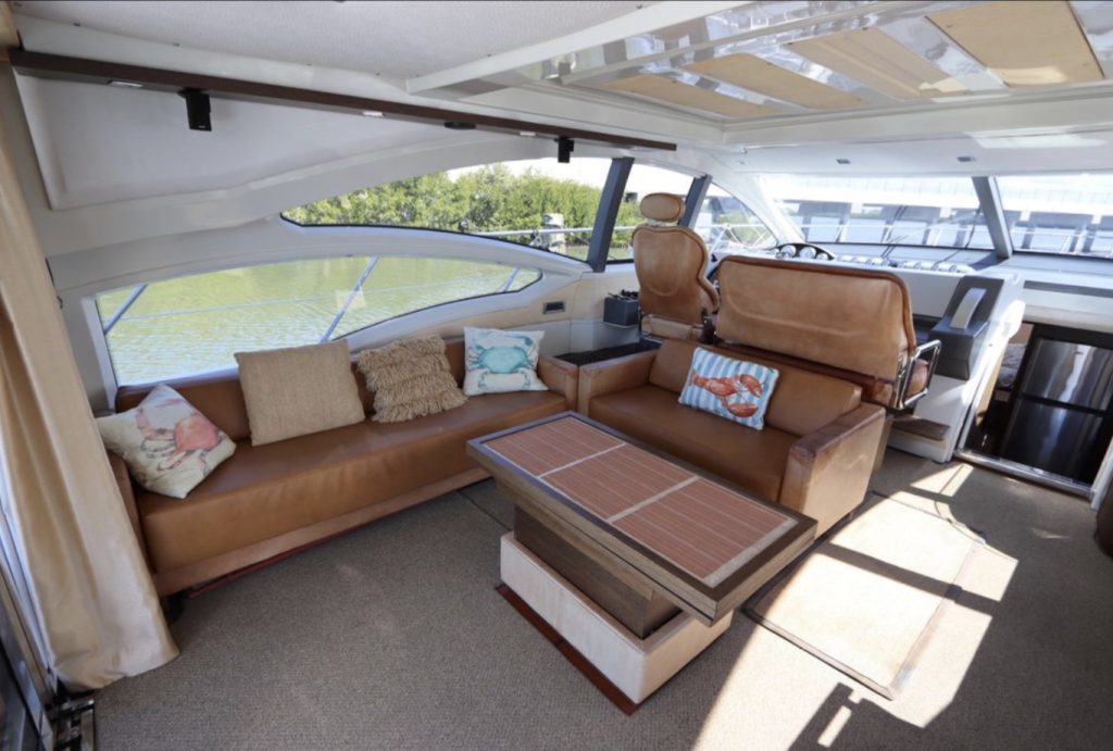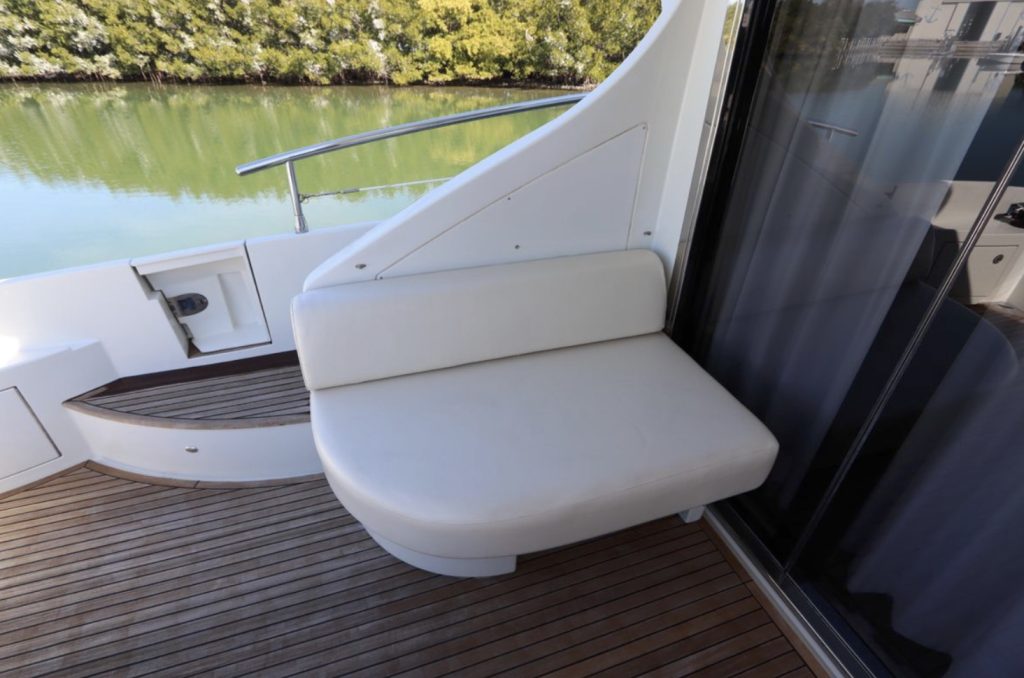 an inflatable or RIB. Finally, there’s a cut out in the forward sun pad for your wine and champagne. A good open-water performer, Cat 1,015hp C-18 V-drive diesels cruise at 28 knots (low 30s top).