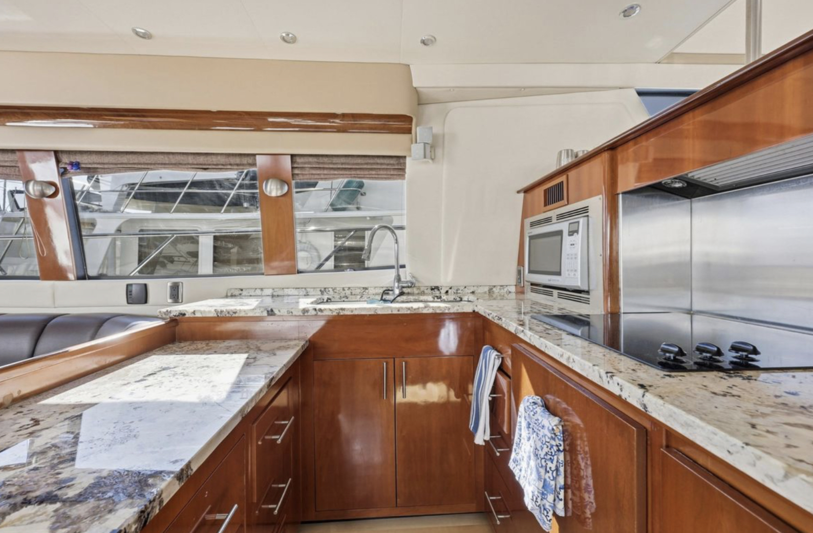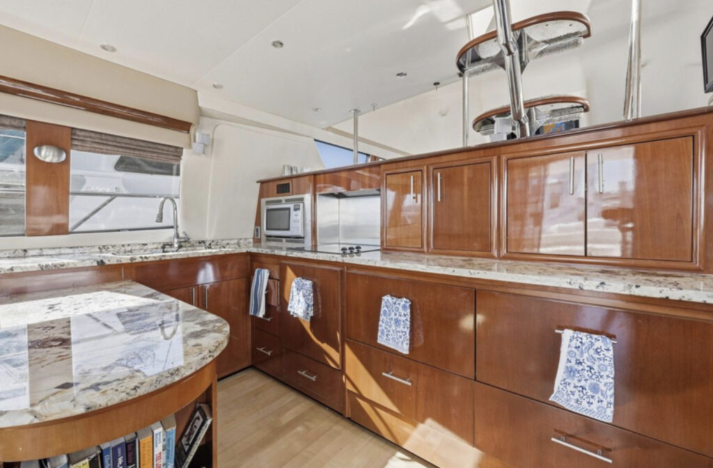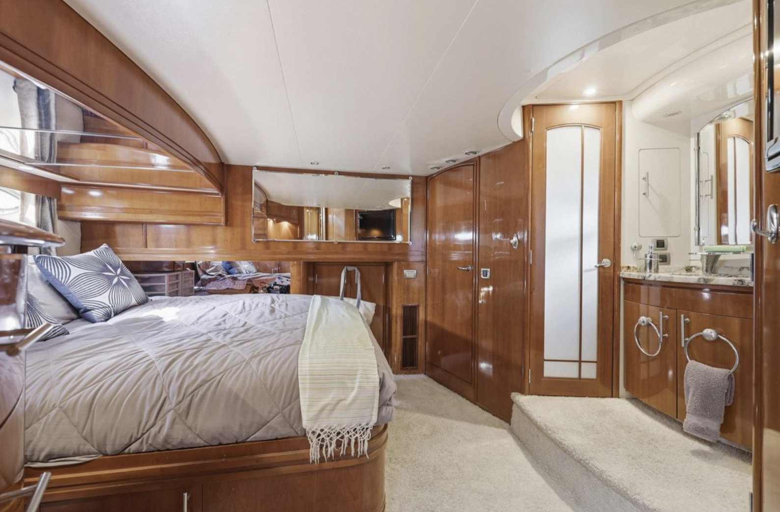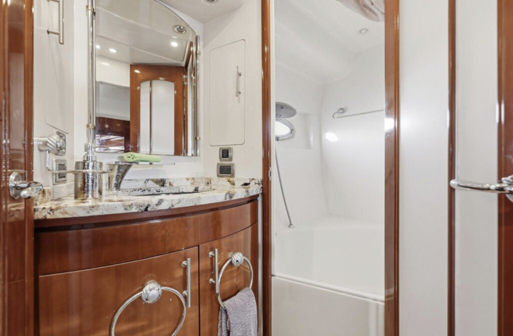 The Carver 56 Voyager offers a multitude of living spaces. The salon seamlessly flows into the galley, where top-of-the-line appliances and ample counter space make meal preparation a joy. There are three staterooms onboard, including a luxurious master suite and two guest cabins, ensuring that everyone on board enjoys the utmost in privacy and comfort.