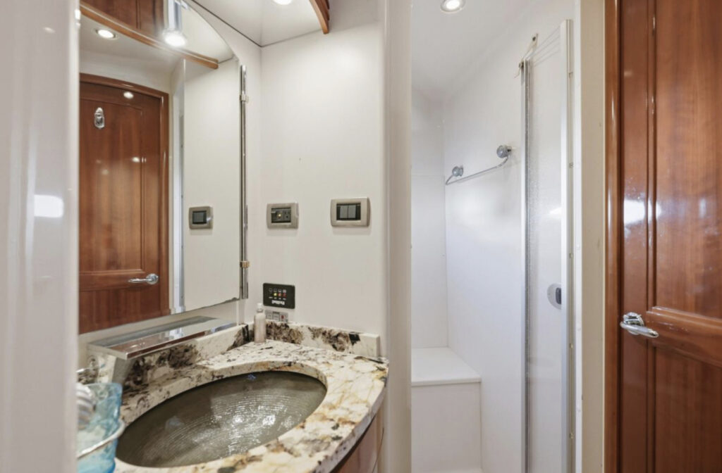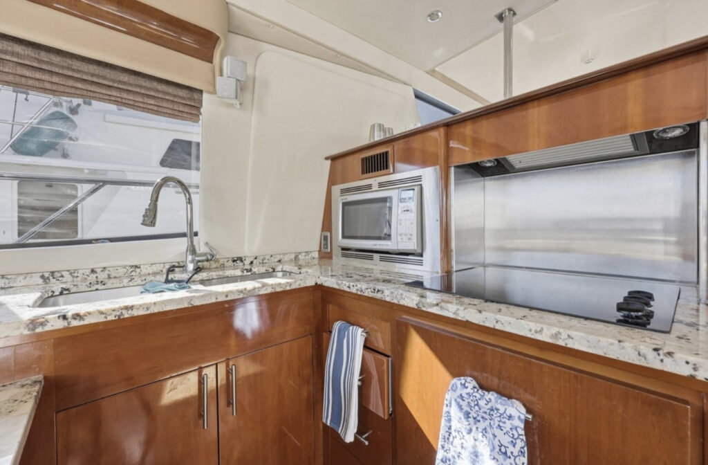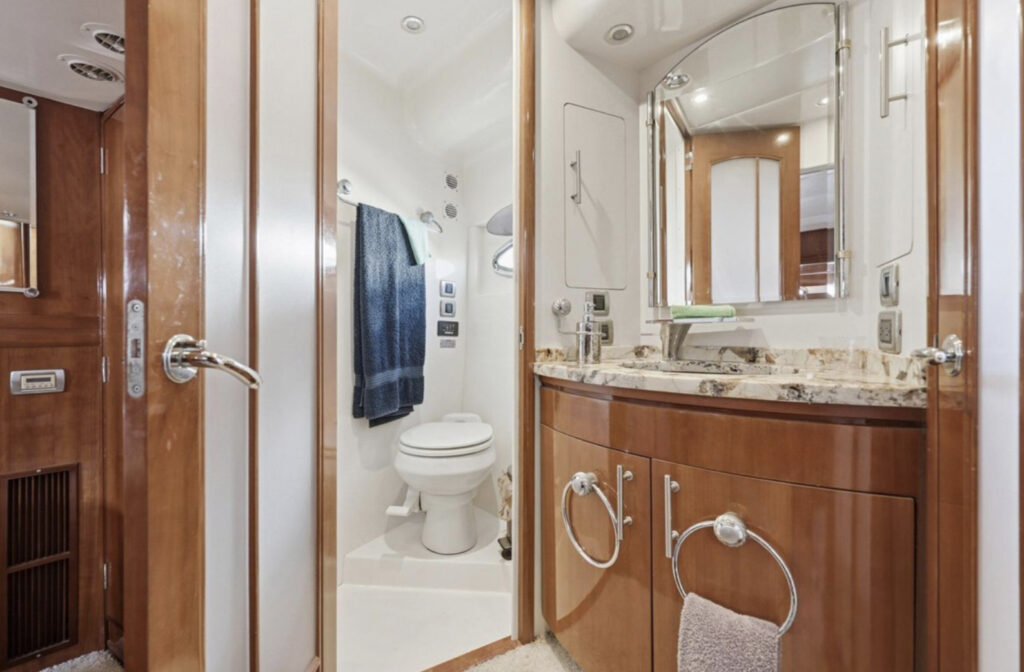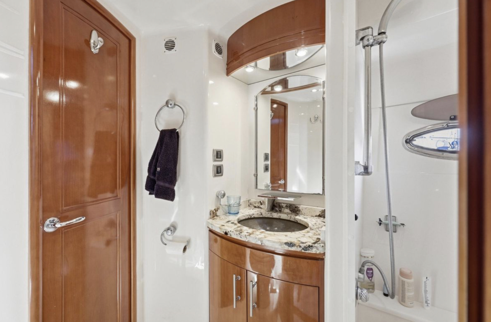 The Carver 56 Voyager offers a multitude of living spaces. The salon seamlessly flows into the galley, where top-of-the-line appliances and ample counter space make meal preparation a joy. There are three staterooms onboard, including a luxurious master suite and two guest cabins, ensuring that everyone on board enjoys the utmost in privacy and comfort.