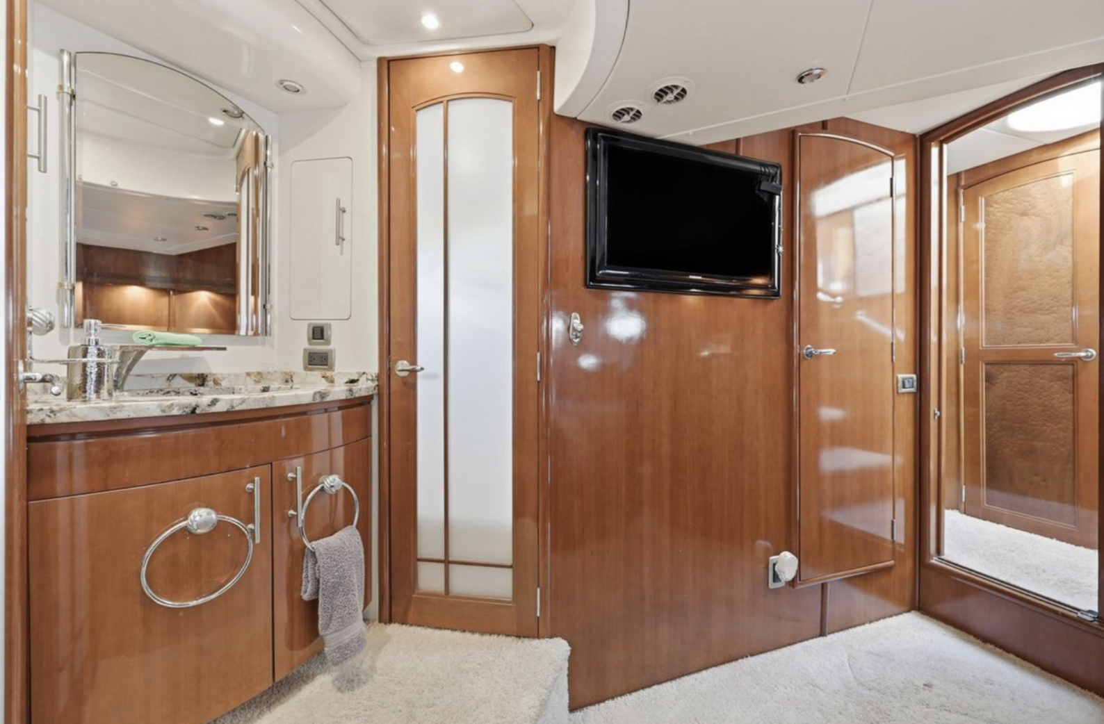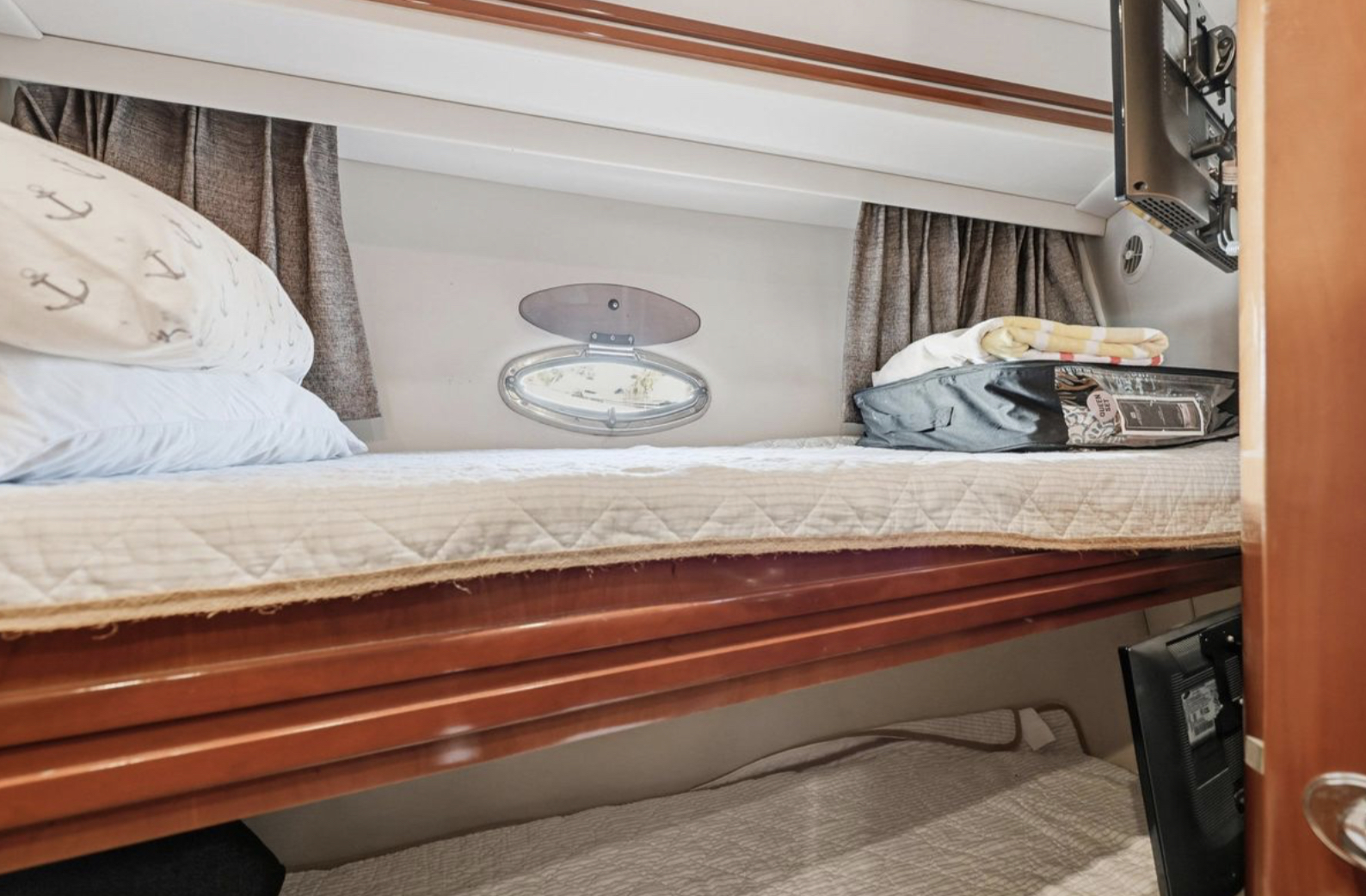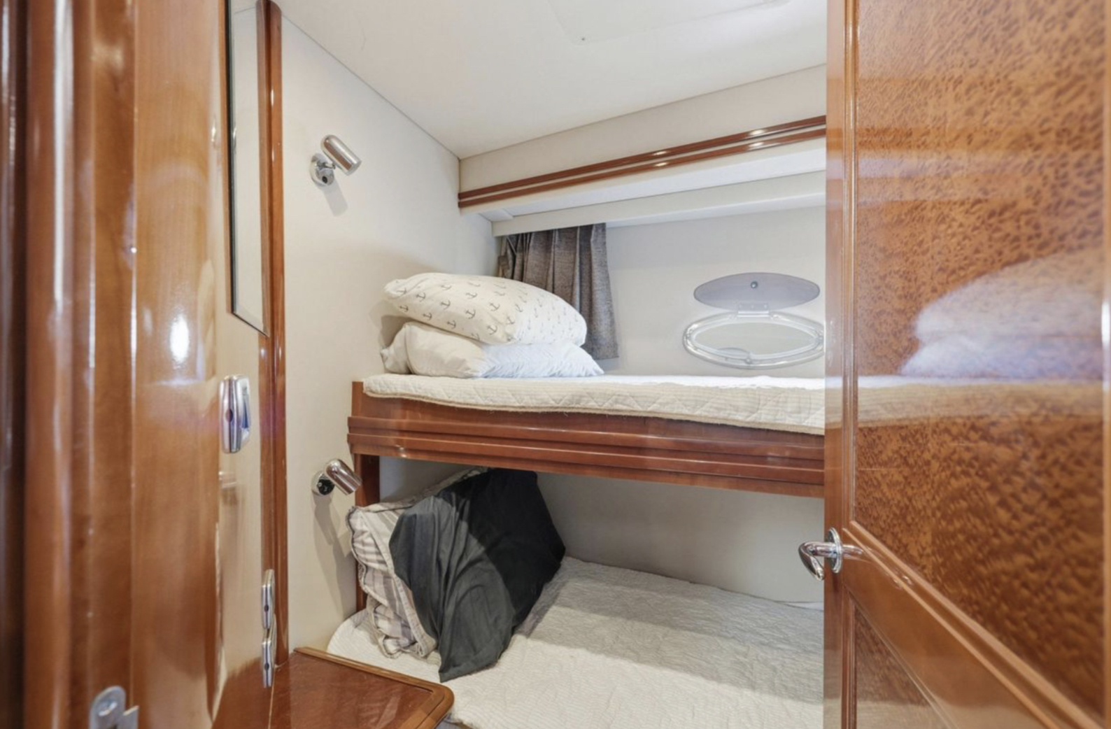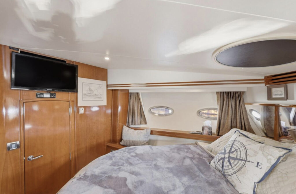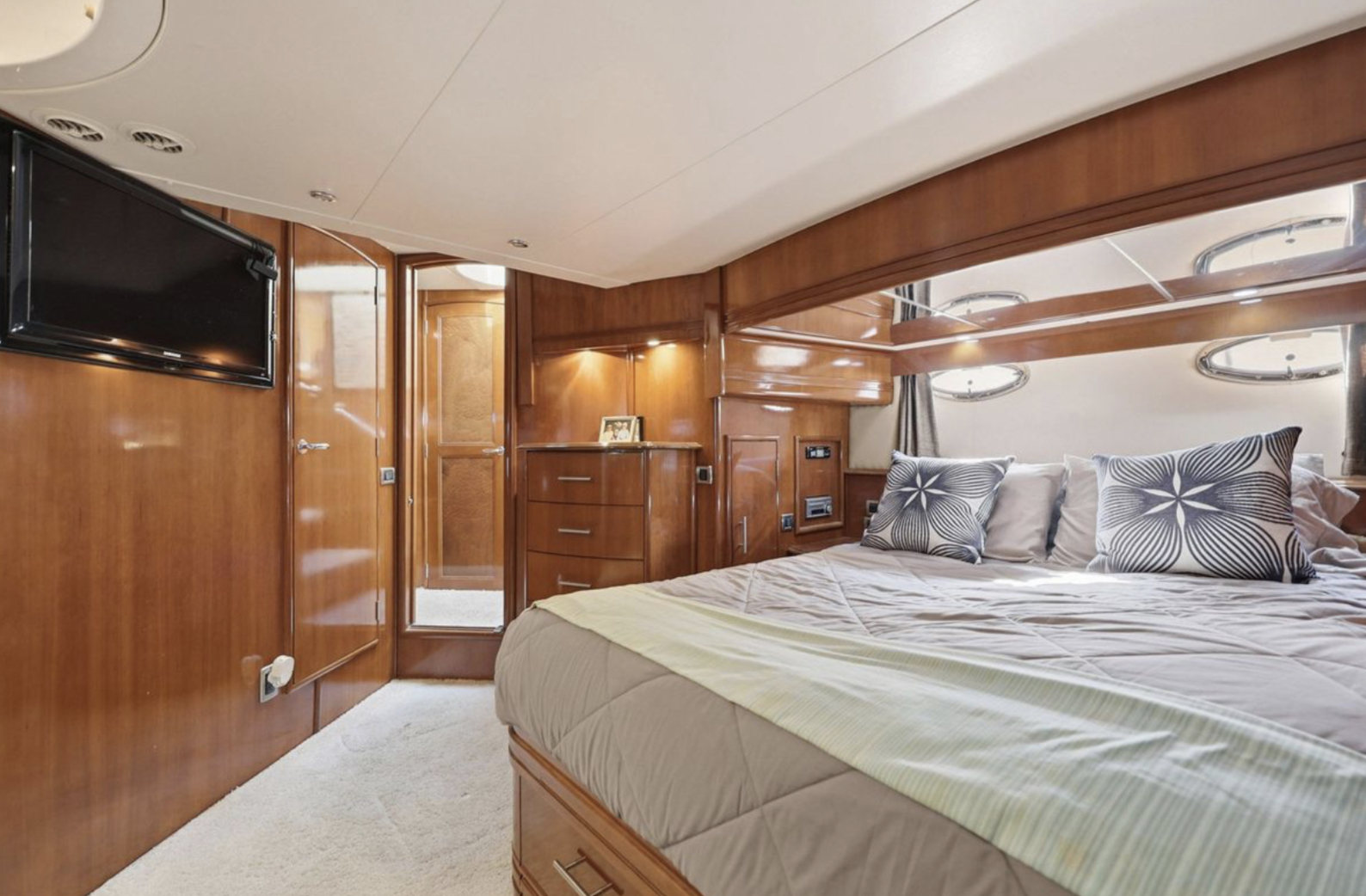 The Carver 56 Voyager is a three-stateroom two-head layout with a raised Pilothouse and a large Enclosed Bridge Deck. The Master Stateroom is midship with an over-sized Island Queen Berth. The Master features separate Head and Shower/tub closets and a full sized washer and dryer. The VIP Stateroom is forward and also features an Island Queen Berth. The third stateroom features over and under single bunks, each with their own TV! The Guest Head has a privacy entrance from the VIP as well as a day-head entrance.