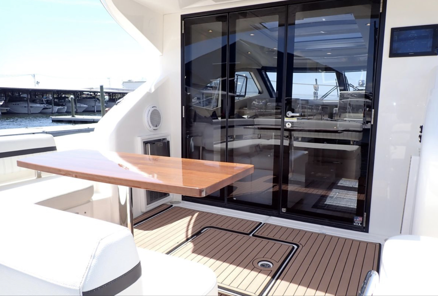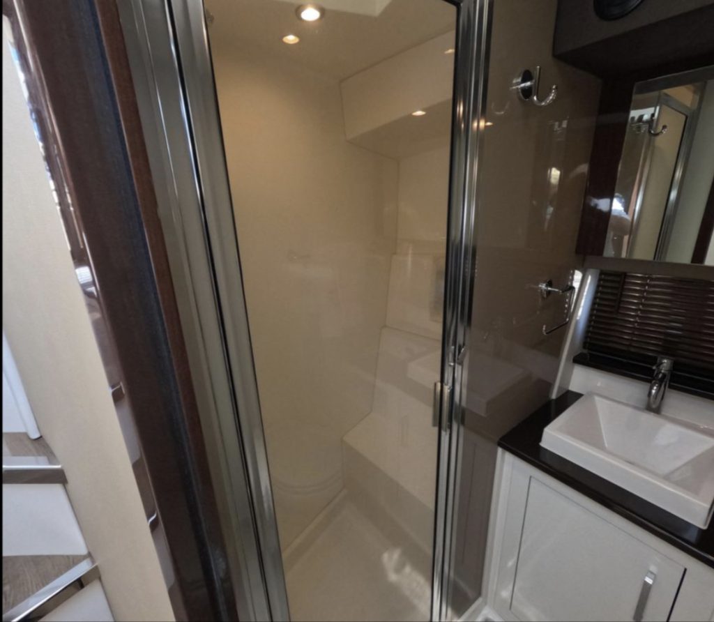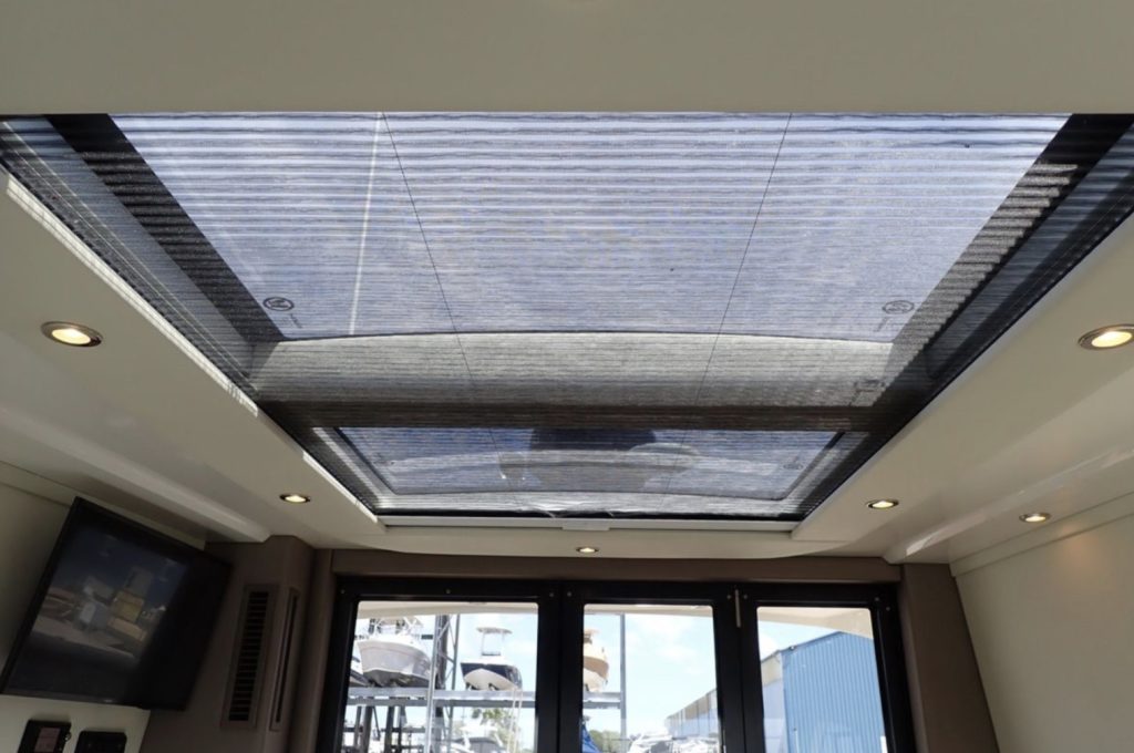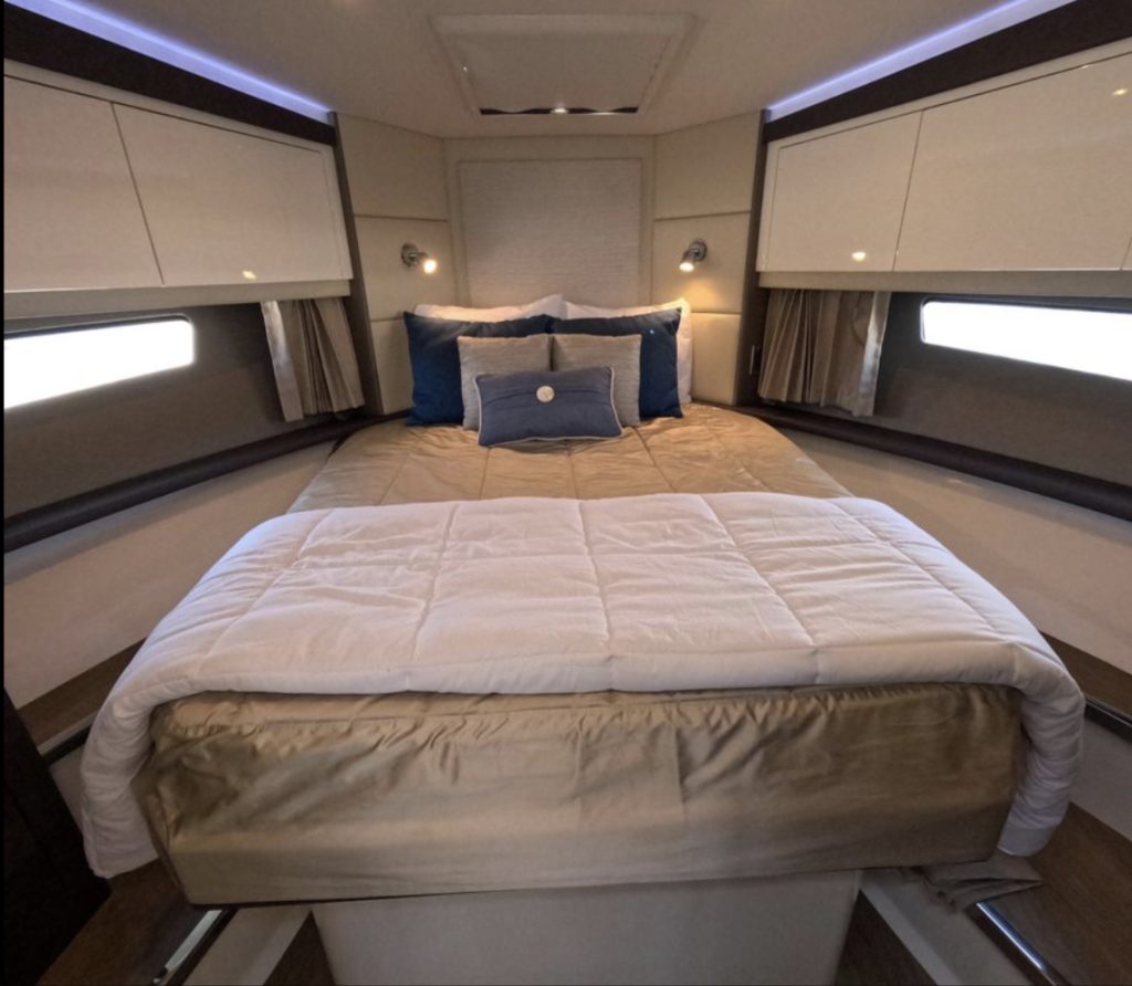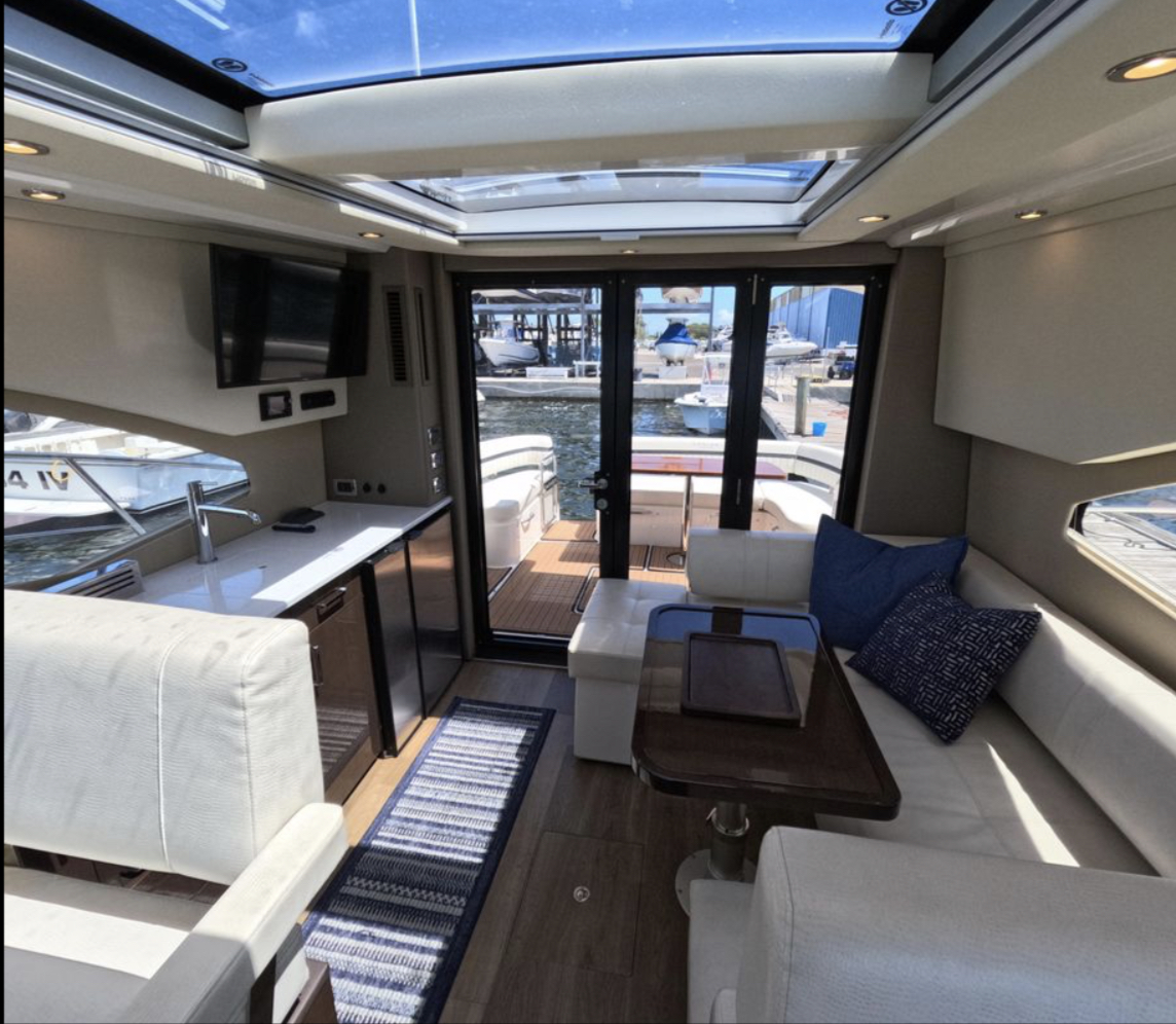 Once you open the salon’s dual doors, the helm, salon, and galley become part of one, single-level, indoor/outdoor living space for entertaining, relaxing, and simply enjoying life on the water.
