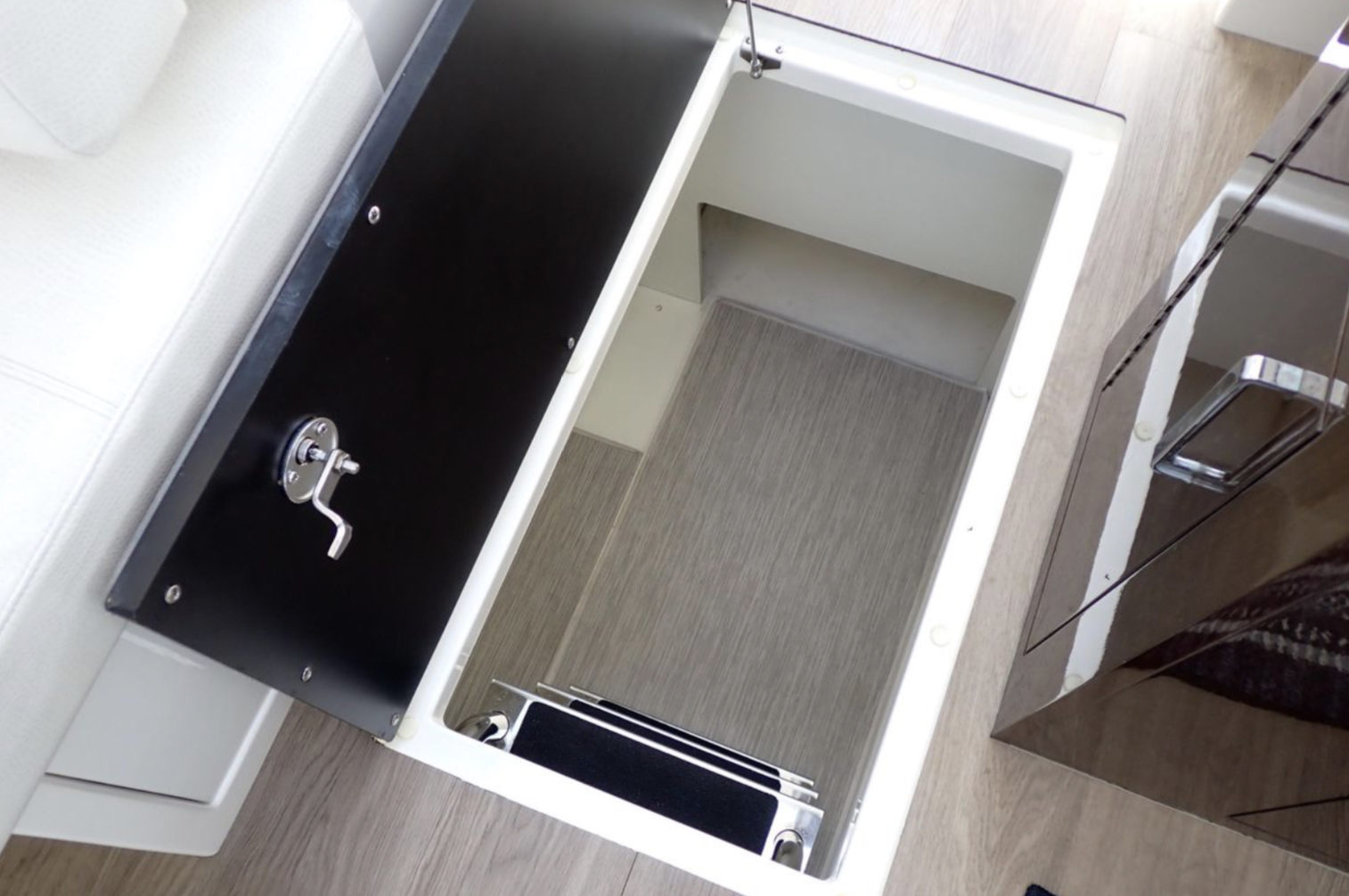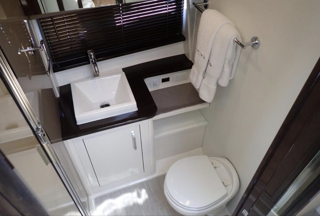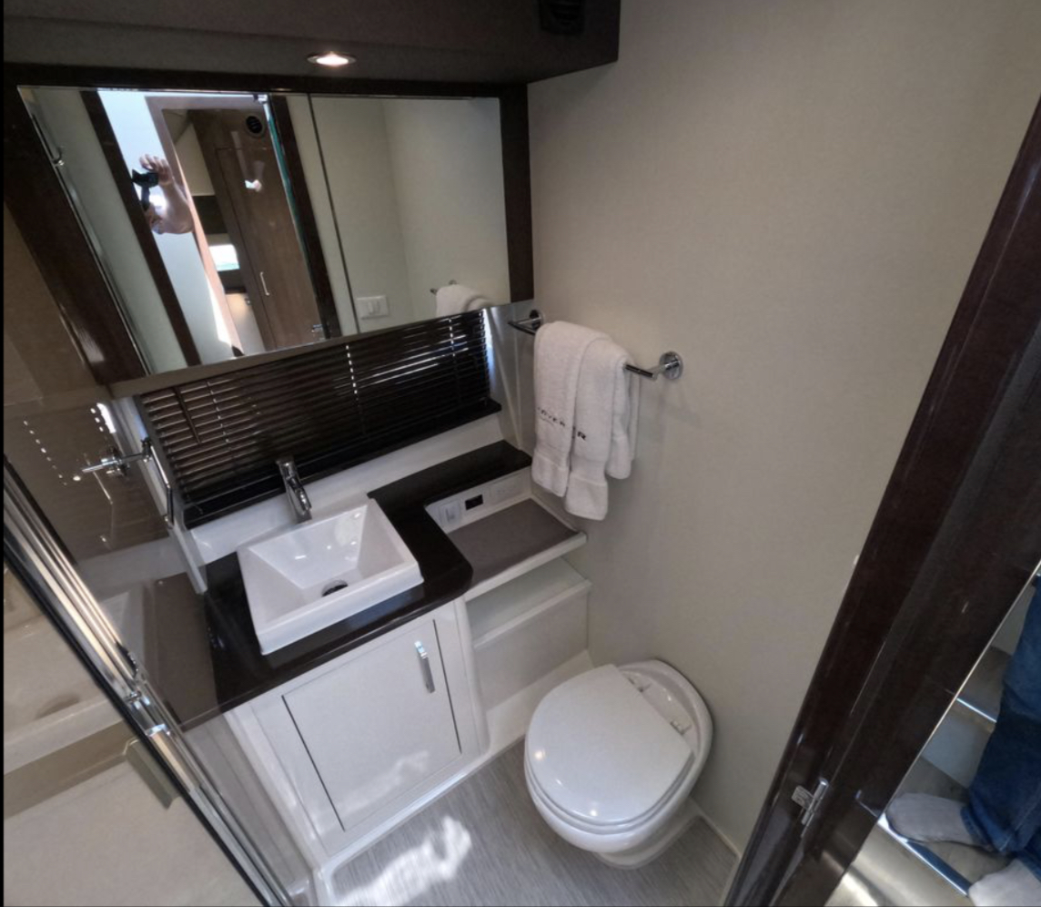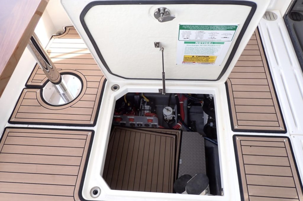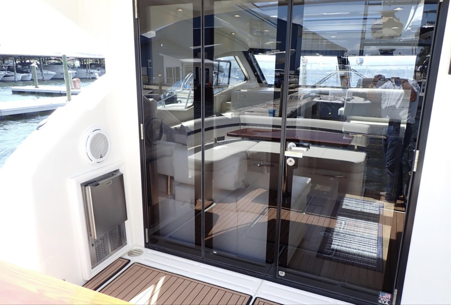 Once you open the salon’s dual doors, the helm, salon, and galley become part of one, single-level, indoor/outdoor living space for entertaining, relaxing, and simply enjoying life on the water.
