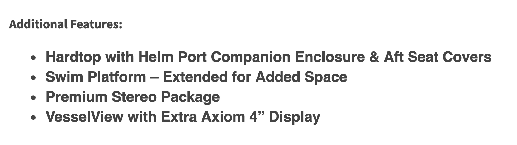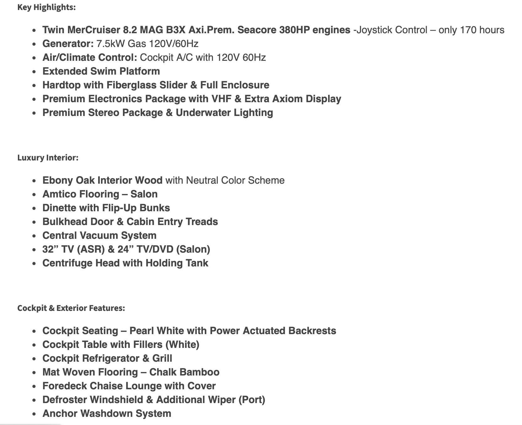 This yacht is fully loaded with the most desirable options and has been meticulously maintained. With just 170 hours, it represents an incredible opportunity to own a near-new, highly optioned Cruisers Yachts 390 Express Coupe at a fraction of new replacement cost.
