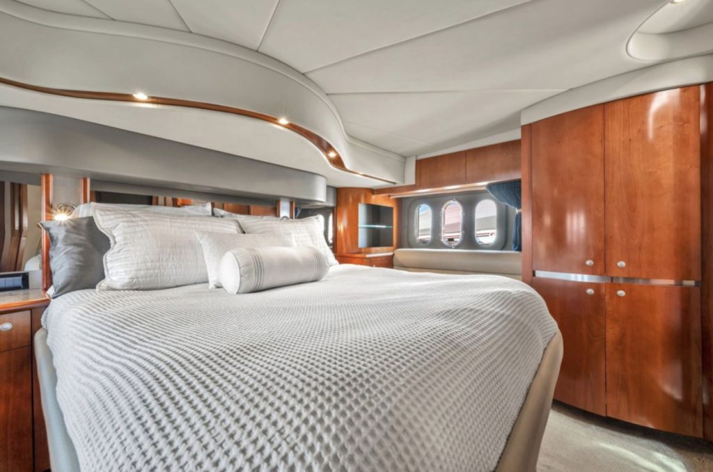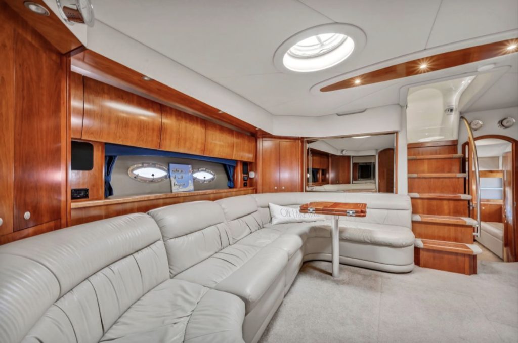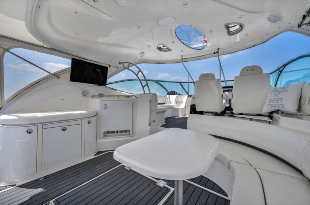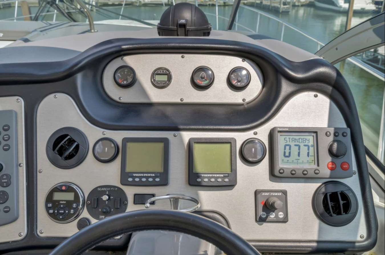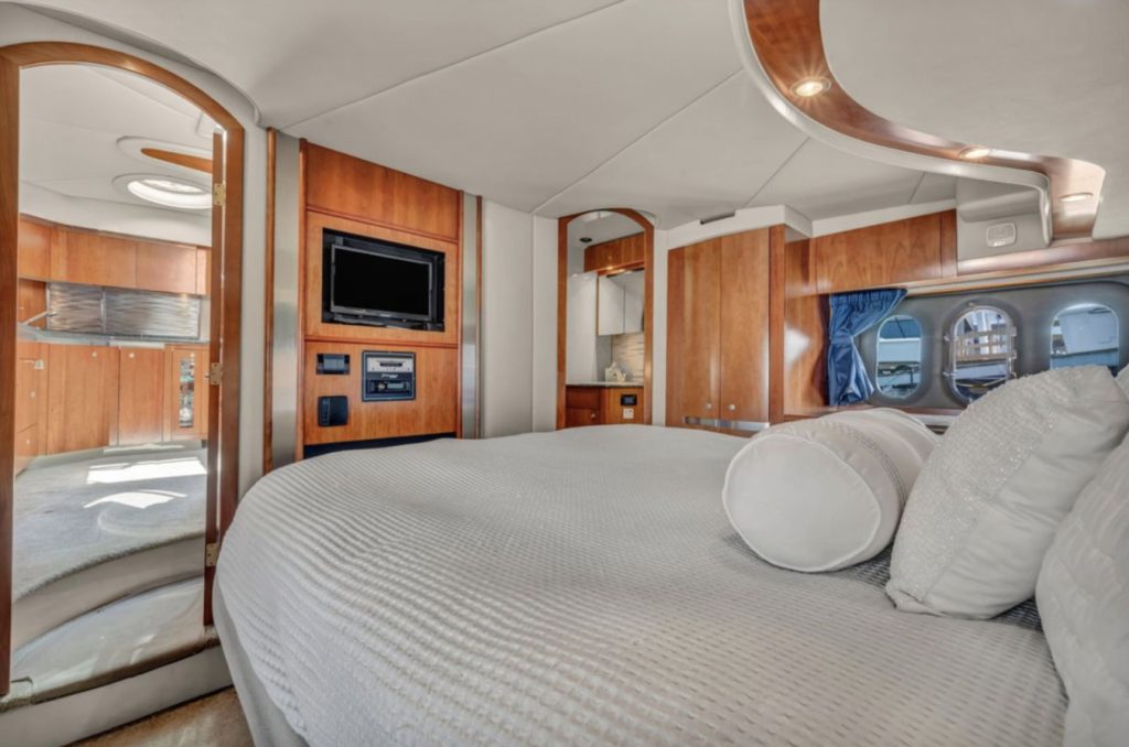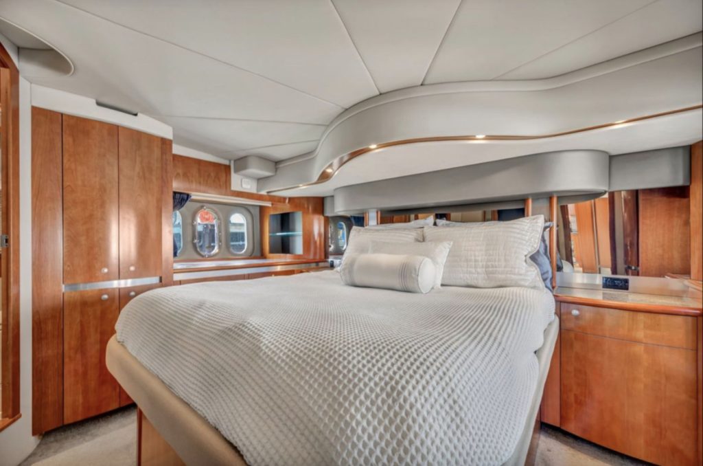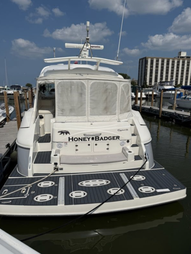 This refined 52 foot express cruiser combines exceptional performance with elegant, nautical comfort. Built with a semi displacement hull and top-tier systems, she features cathedral-style cherry veneer interiors, a full galley, lavish master stateroom, dynamic entertainment setups, and cockpit lounging complete with hydraulic swim platform and integrated grill/wet bar
