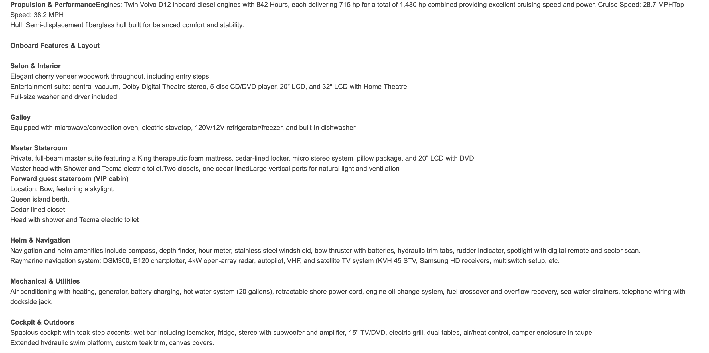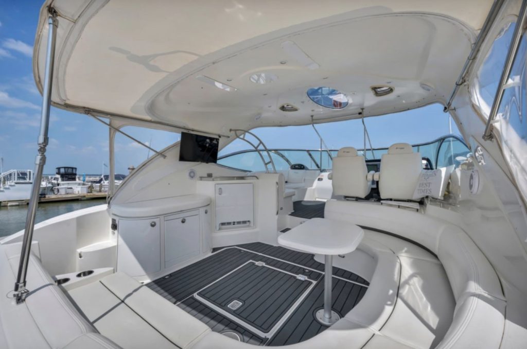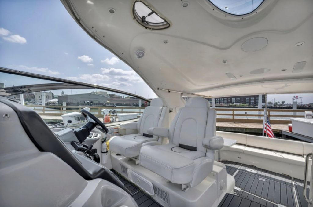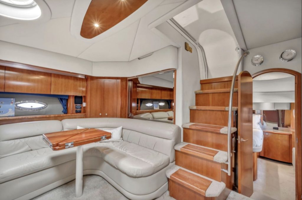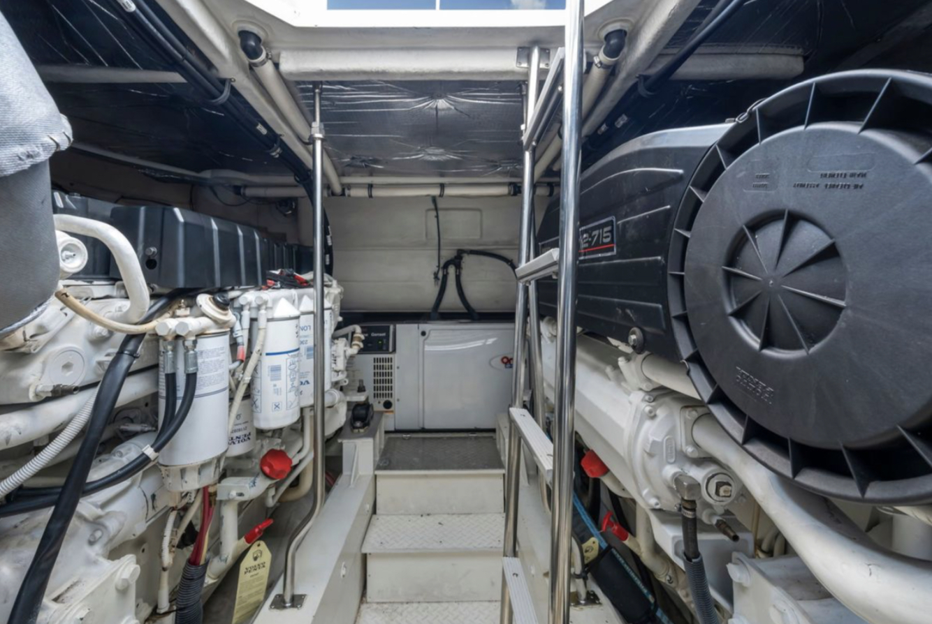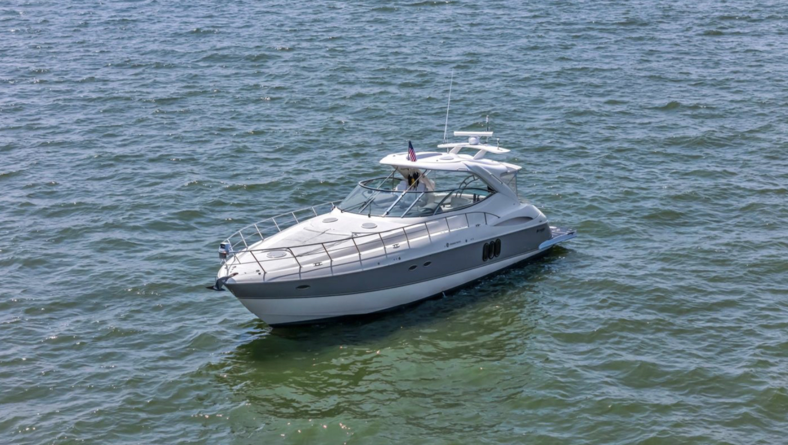 This refined 52 foot express cruiser combines exceptional performance with elegant, nautical comfort. Built with a semi displacement hull and top-tier systems, she features cathedral-style cherry veneer interiors, a full galley, lavish master stateroom, dynamic entertainment setups, and cockpit lounging complete with hydraulic swim platform and integrated grill/wet bar