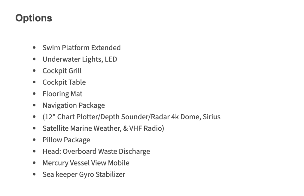 The boat presented on this page is for information purposes only and is not necessarily available for sale and/or rent. This boat is offered under reserve, availability to be verified. This document or this announcement is not contractual. The boat information displayed in the above results is presented in good faith and, while believed to be correct, is not guaranteed. Ita Yachts Canada Inc. and/or ProprioBateau does not offer warranty or assume any legal liability or responsibility for the accuracy, completeness, or usefulness of the information and/or images displayed, as they may not be current or may be images of a comparable boat. All boat information is subject to change without notice and is without warranty. This boat may be offered by another broker open to co-brokerage.
