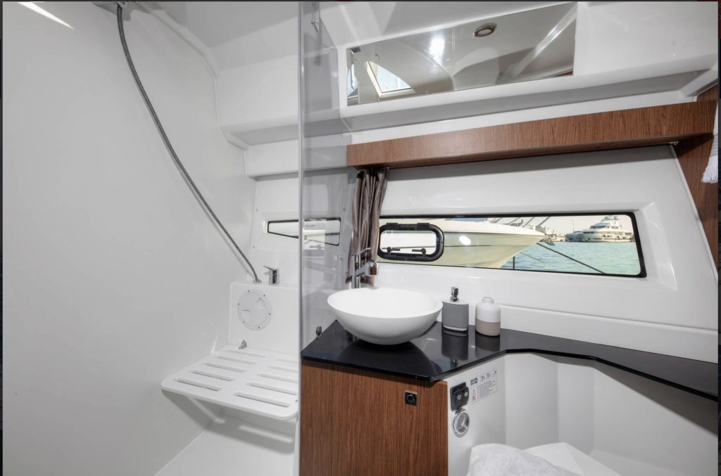 Like all Jeanneaus, the NC 1095 has been designed for life underway and include some clever features like recessed side-decks allowing for safe movement about the boat with easy access to the helm. A large L-shaped lounge comfortably fits a large group and easily converts into a large lounging area. Large transom platforms on either side of the outboard engines, make boarding safe and easy.