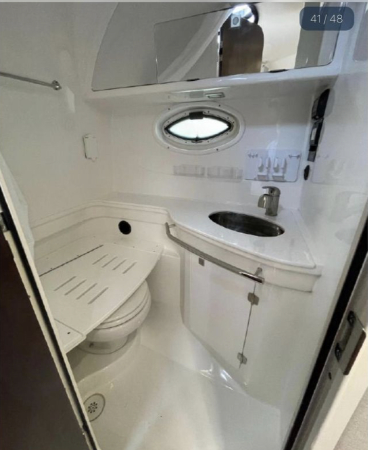 Down below, you will find a fully air-conditioned and spacious cabin with a full berth forward that can easily sleep two. There is also a full galley with an electric burner, microwave, and a drawer fridge on the port side. There is a couch on the stbd side that is able to fold out and turn into another sleeping area. As you go aft, there is a full head on the port side and another berth fully aft.